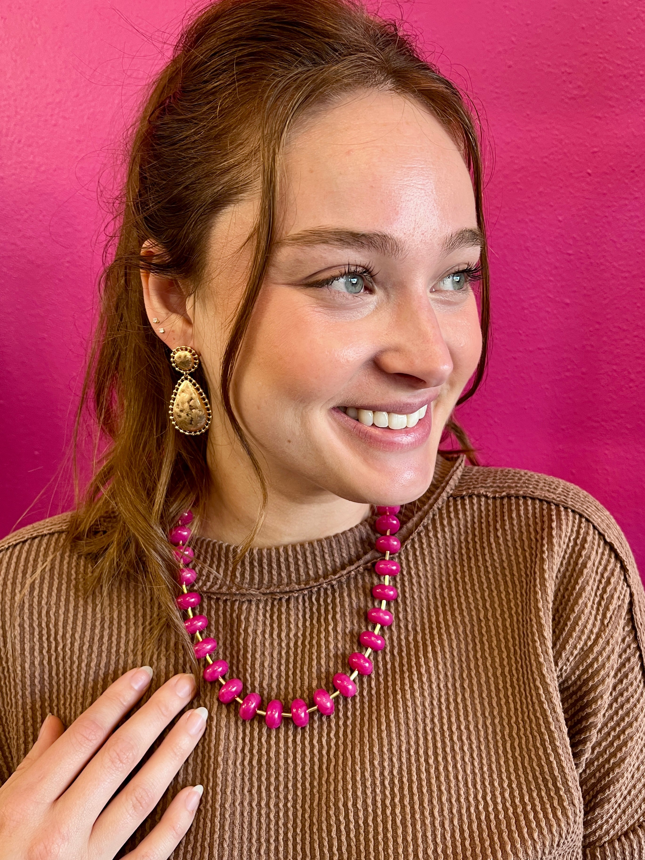 This charming hot pink necklace features vibrant round beads paired with gleaming gold accents for a pop of color that instantly elevates any look. Its delicate design makes it perfect for layering with other pieces, letting you mix and match to create your own signature style. Whether worn solo for a bold statement or stacked with complementary necklaces, this beauty brings warmth and personality to your everyday jewelry collection.