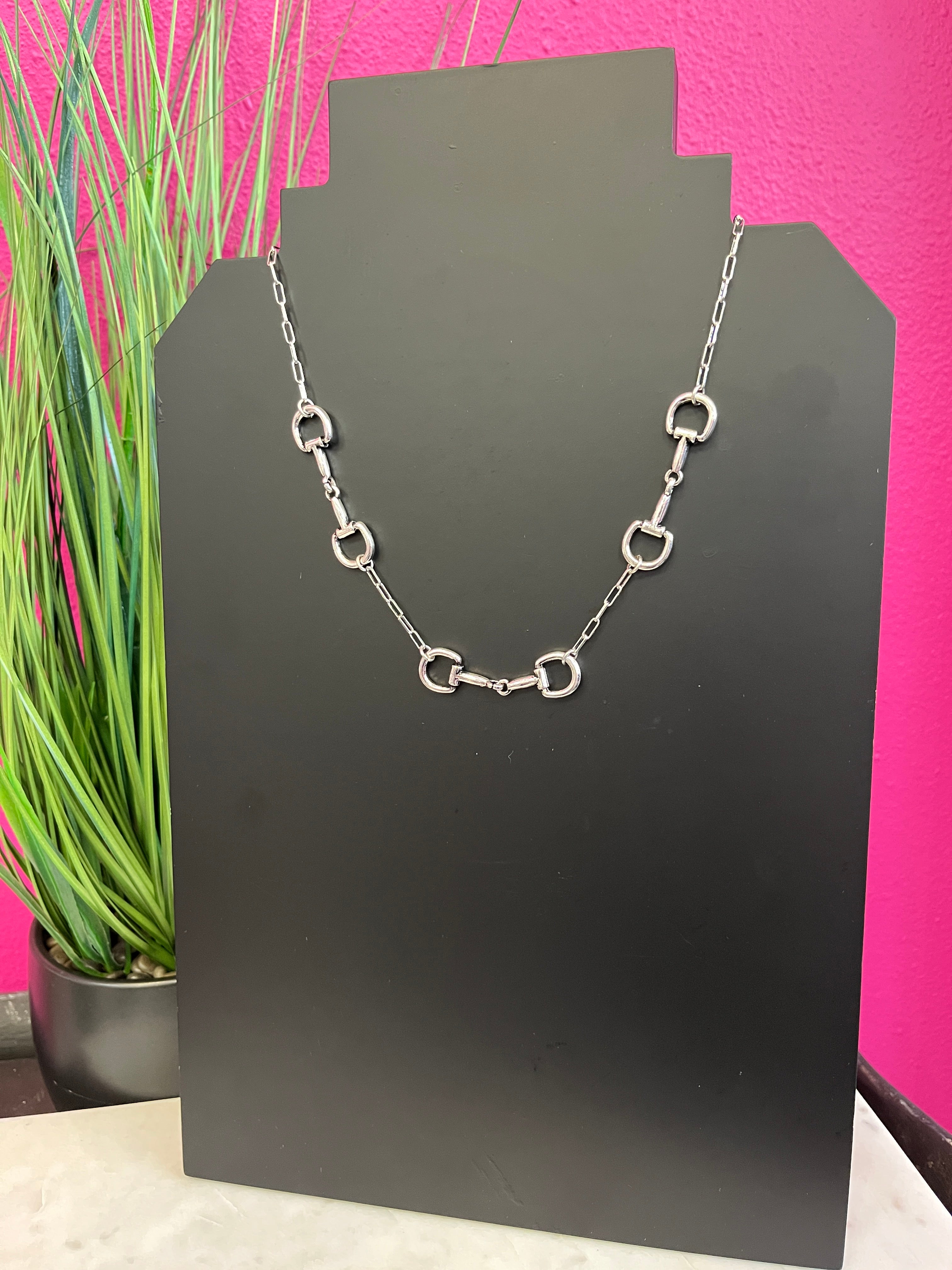 Elevate your layering game with this adorable silver necklace featuring three delicate horsebits strung together. The minimalist design pairs effortlessly with other pieces, letting you stack and mix for a personalized look. Whether worn solo for subtle sophistication or combined with your favorite chains, this playful accessory brings just the right amount of equestrian charm to any outfit. Perfect for the jewelry lover who loves versatility and style.