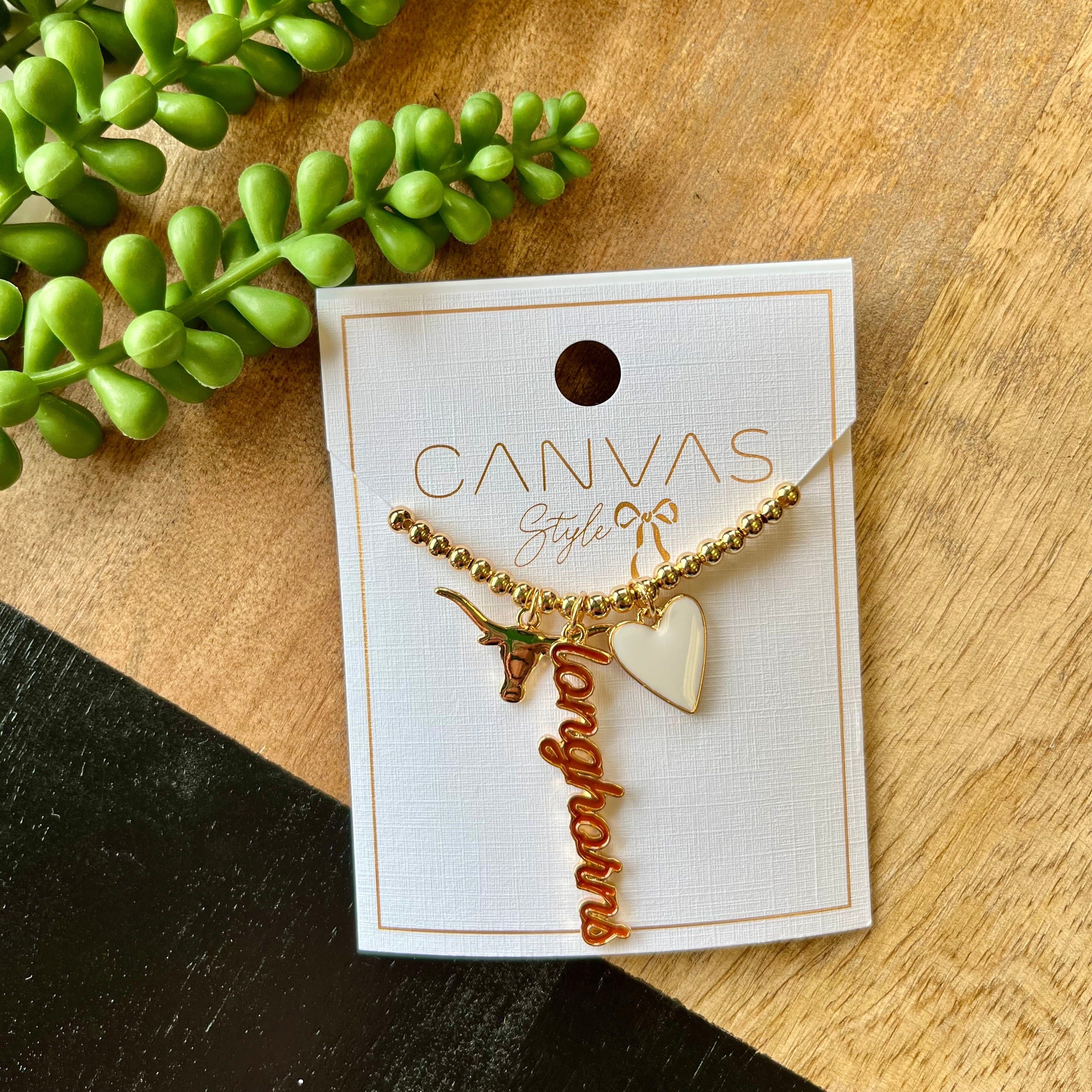 Show your Texas pride with this playful gold ball bead necklace featuring three charming Texas Longhorns charms. Perfect for game day or any day you want to celebrate Austin style, this necklace adds a cute and spirited touch to your outfit. Lightweight and fun, it’s a must-have accessory for every Longhorn fan!
