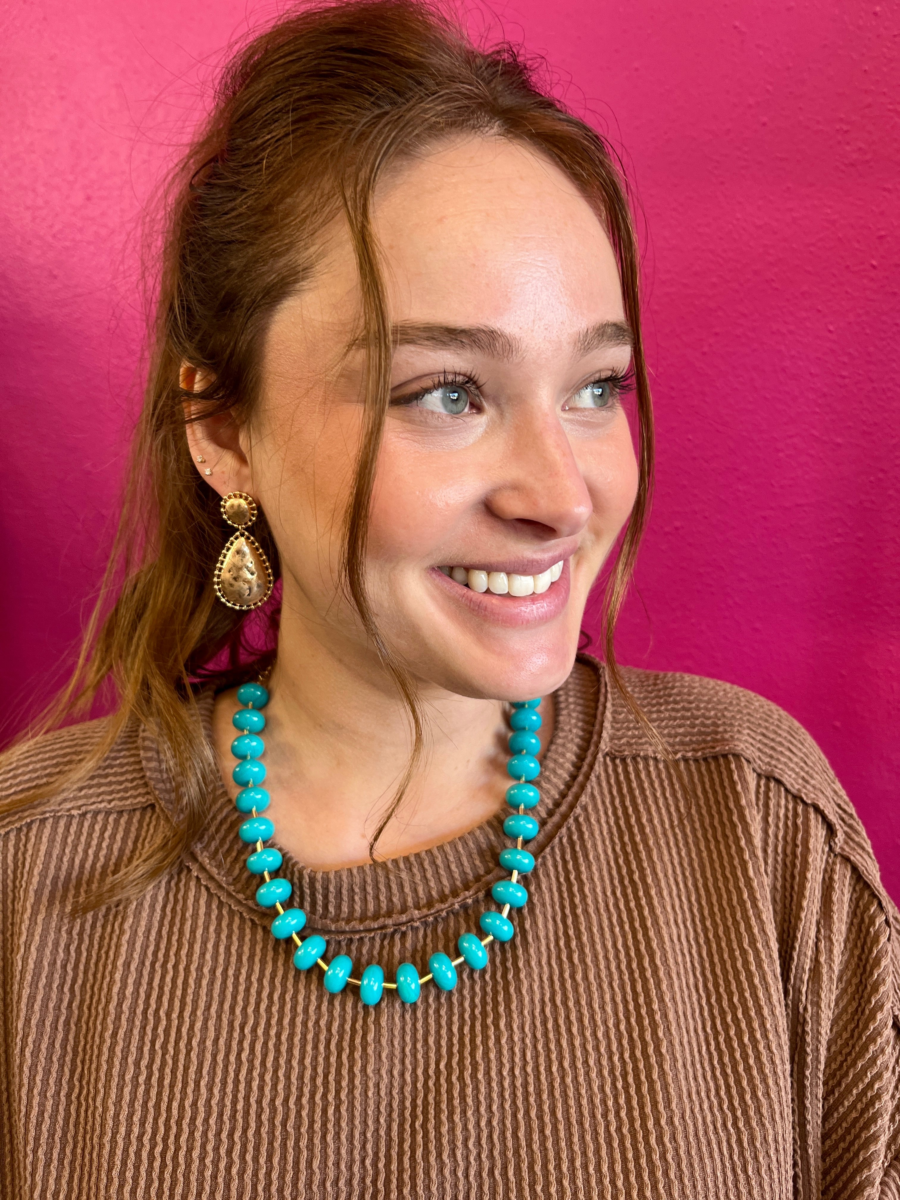This charming turquoise necklace features vibrant round beads paired with gleaming gold accents for a pop of color that instantly elevates any look. Its delicate design makes it perfect for layering with other pieces, letting you mix and match to create your own signature style. Whether worn solo for a bold statement or stacked with complementary necklaces, this beauty brings warmth and personality to your everyday jewelry collection.