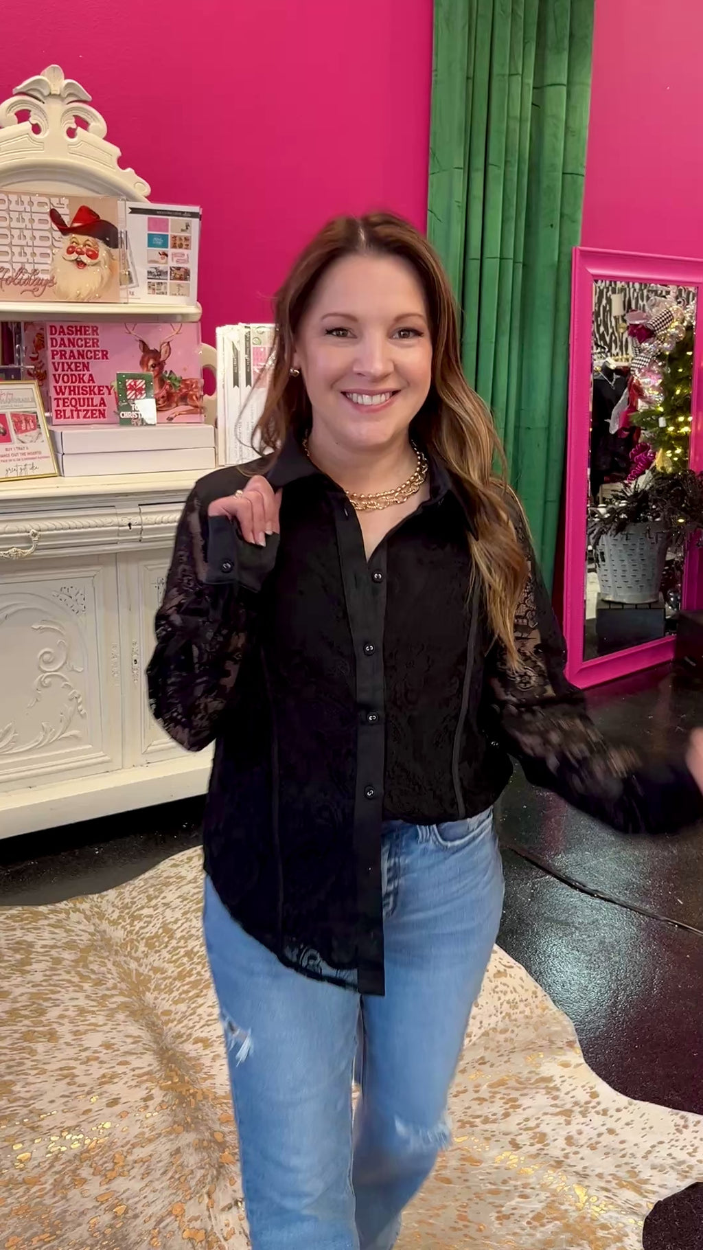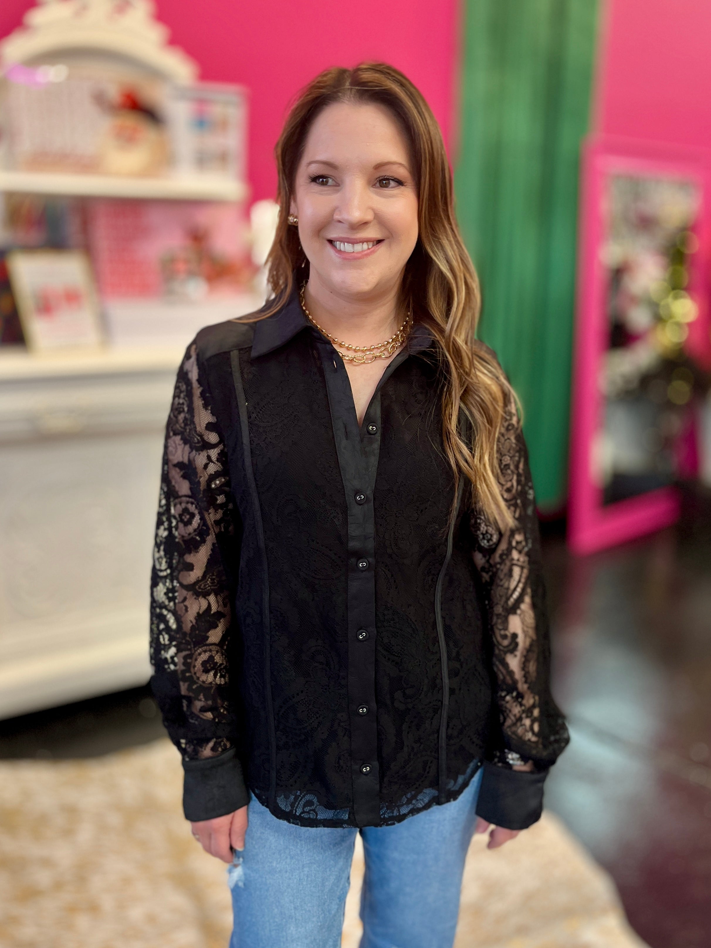 Black Paisley Lace Button Up Top Turn heads with this chic button-up featuring intricate paisley lace detailing that's equal parts elegant and edgy. Throw it on with jeans for effortless weekend vibes or layer it under a blazer for boardroom-ready polish. Versatile, flattering, and unapologetically fabulous—this top does it all with serious style and a wink.