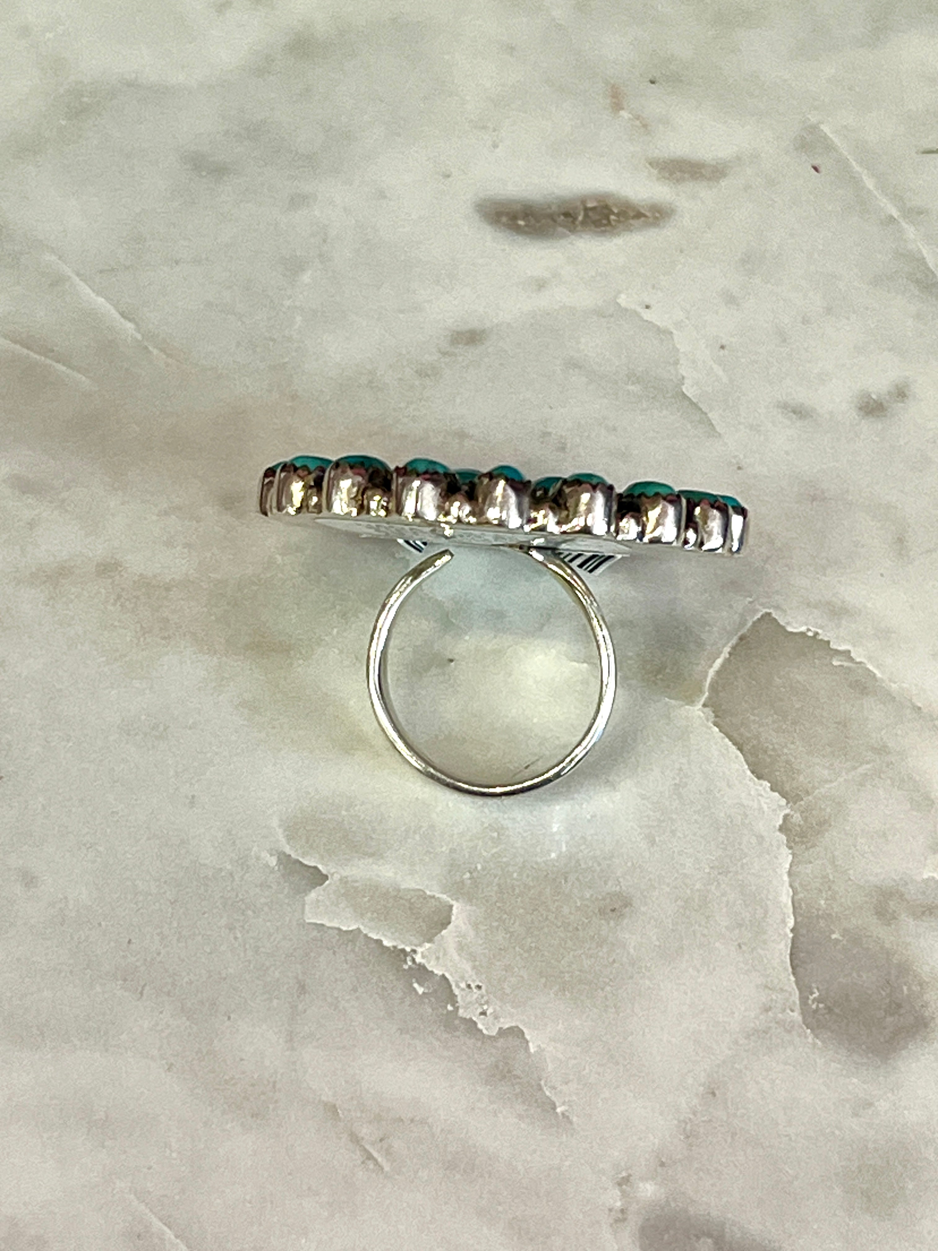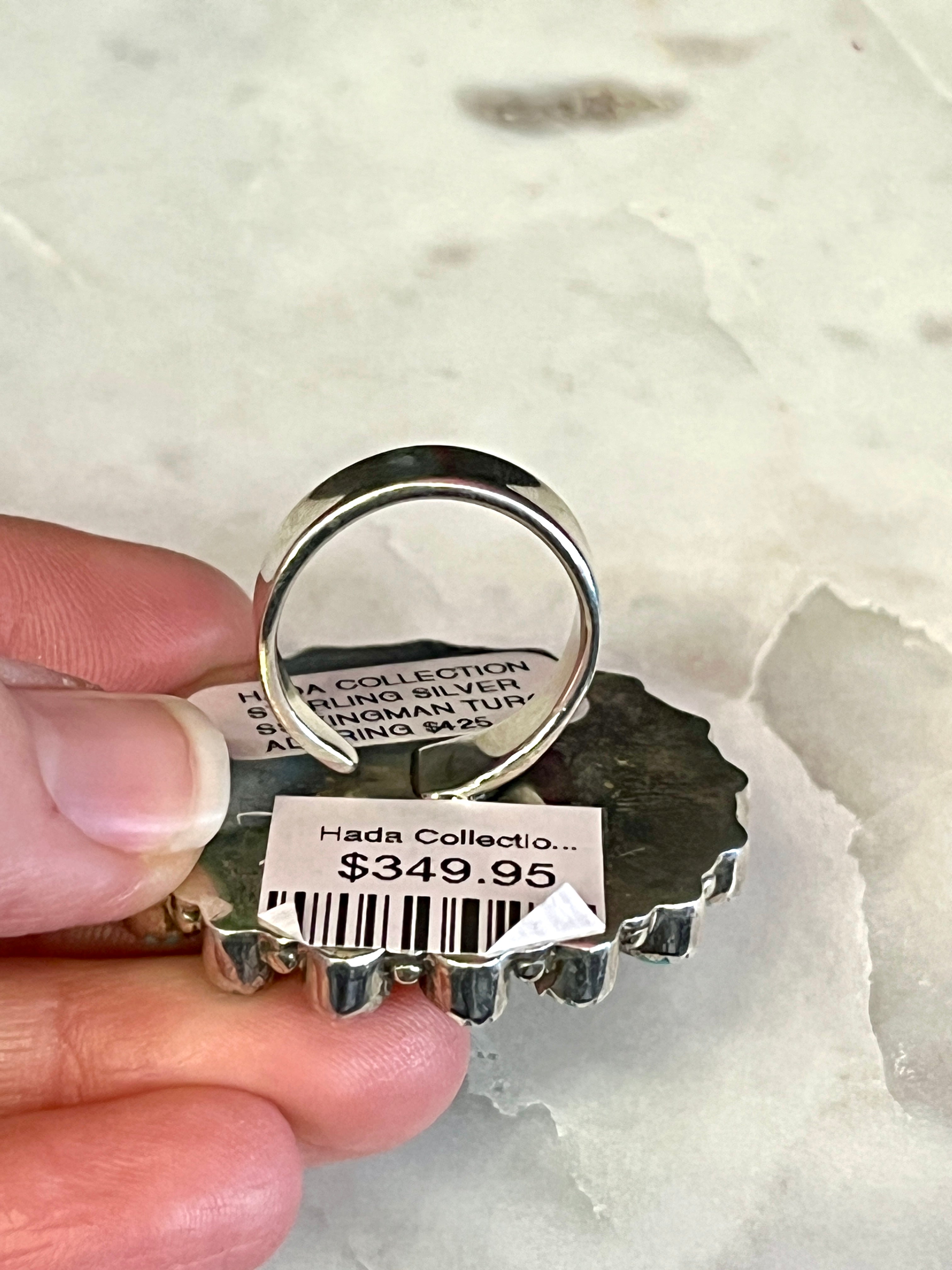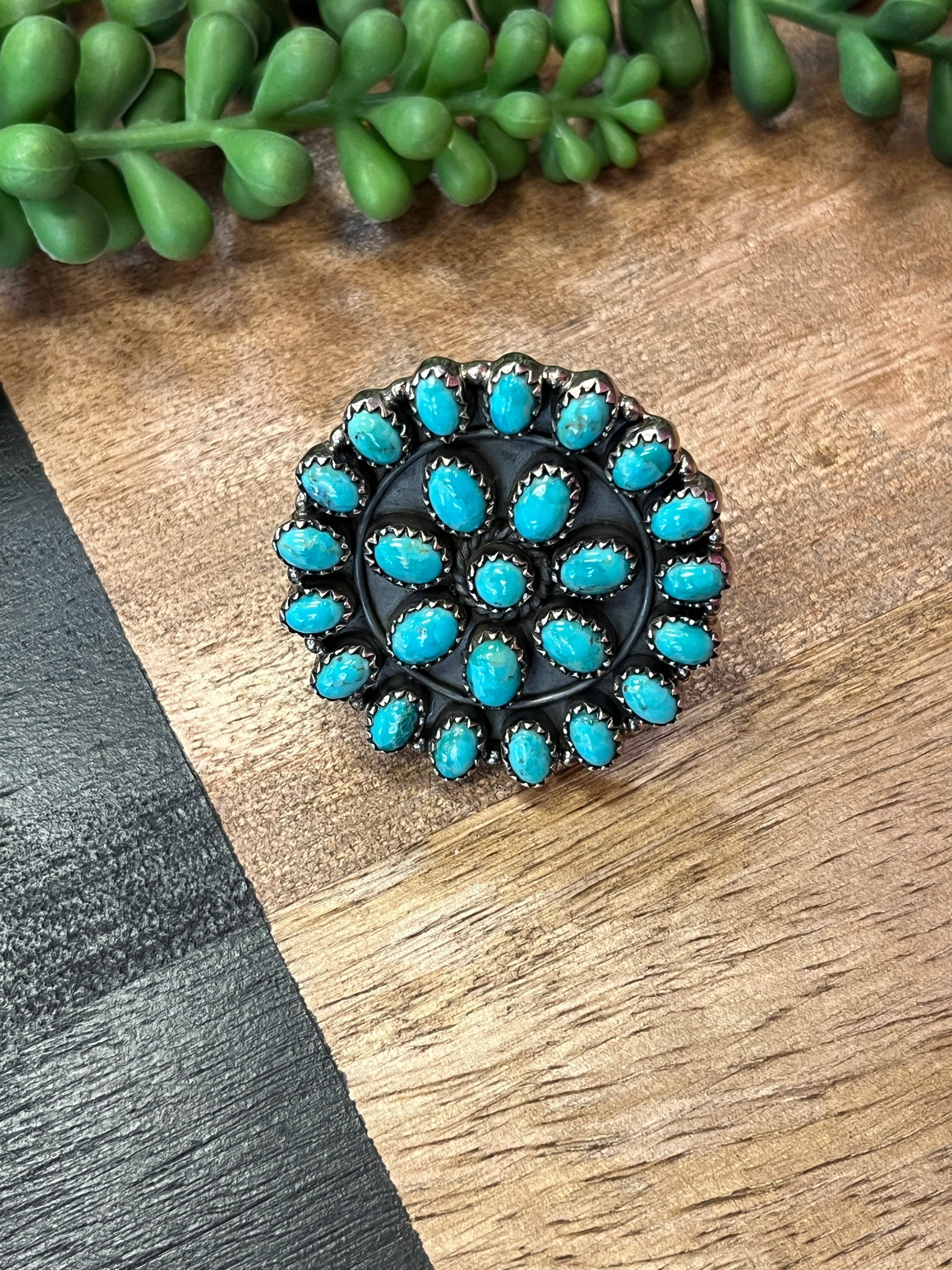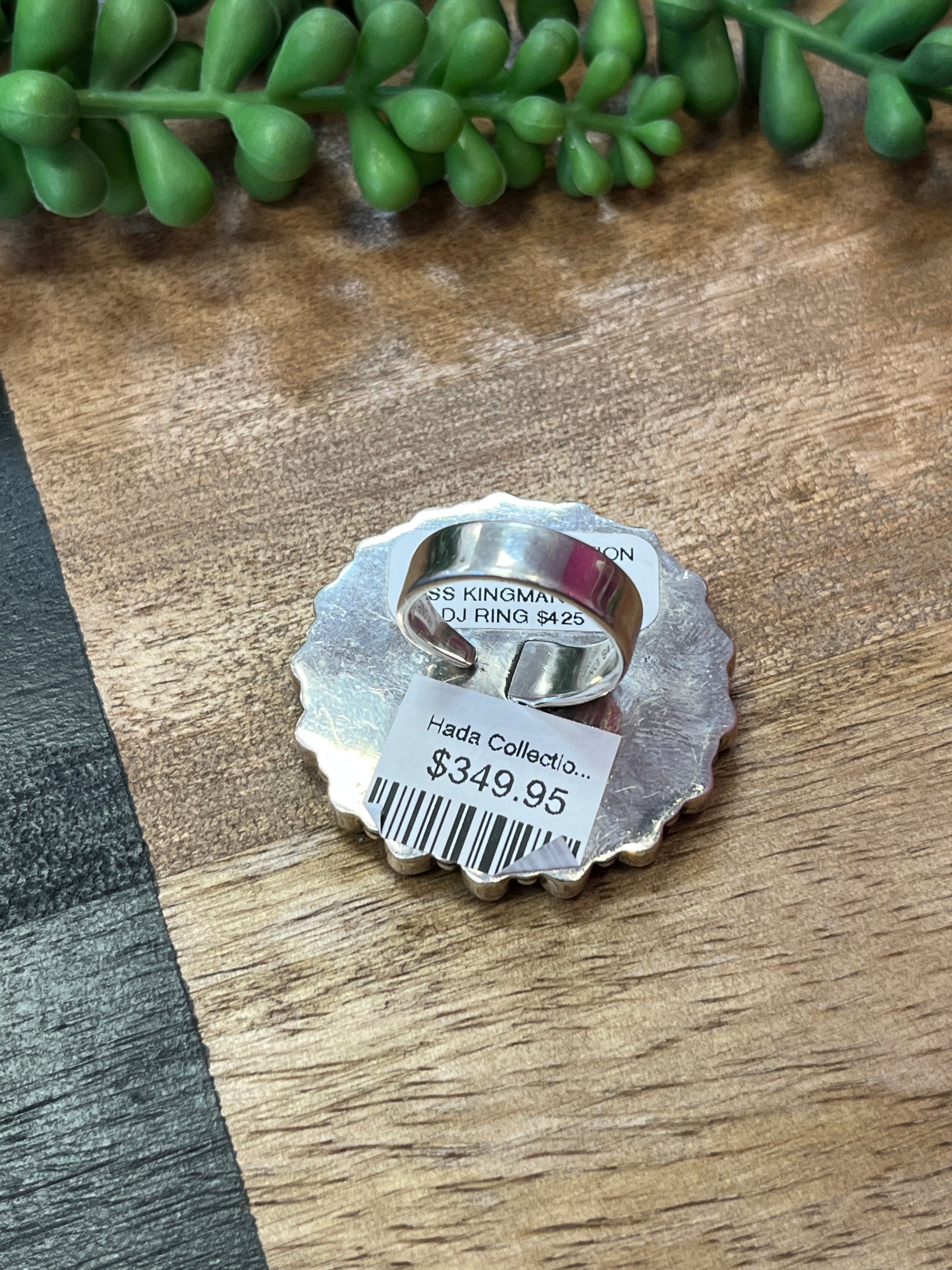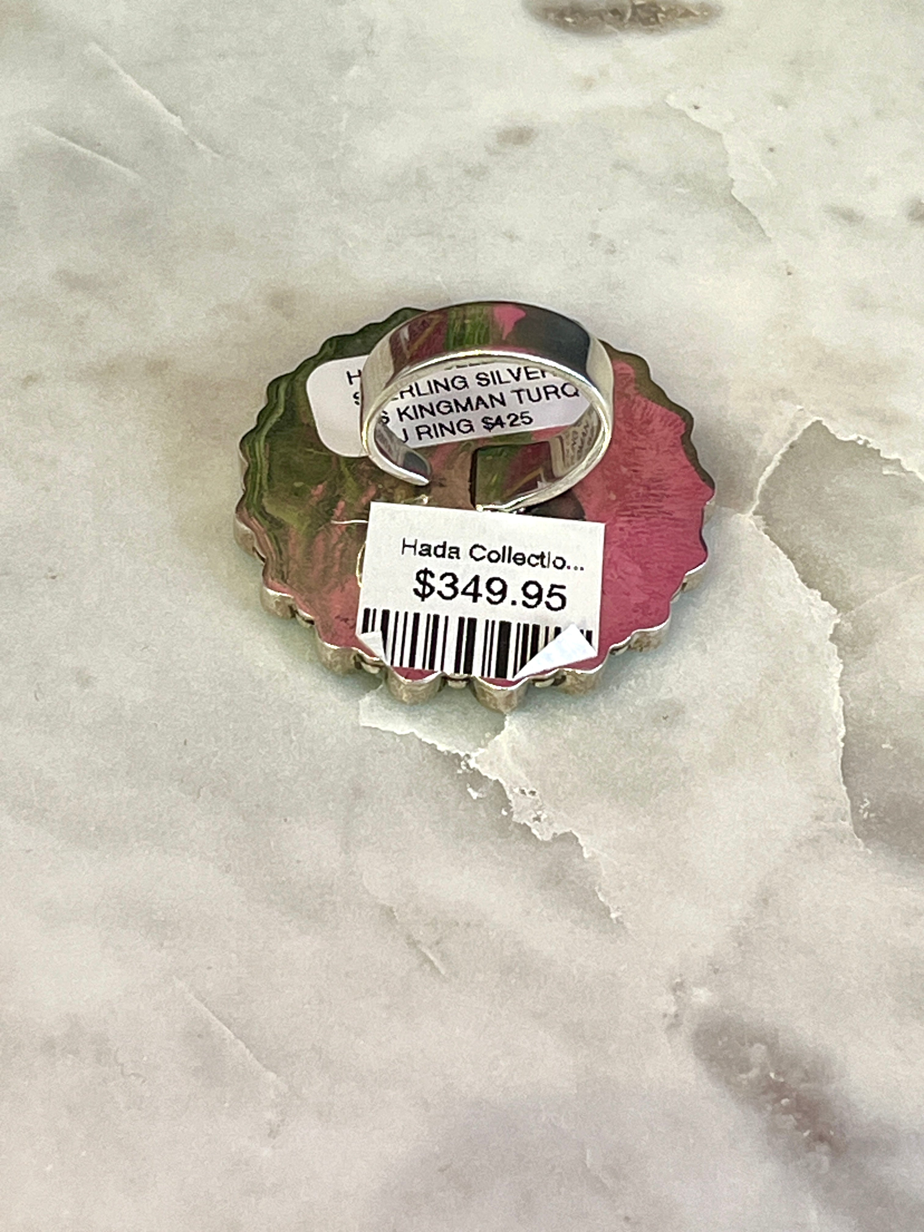 Elevate your everyday sparkle with this stunning turquoise circle ring from our Hada Collection. Crafted with genuine Kingman turquoise and polished sterling silver, this beauty brings authentic southwestern charm to your fingertips. The adjustable design ensures a perfect fit for anyone, making it an effortless accessory that transitions from casual to chic. Whether you're a turquoise devotee or just discovering its magic, this ring is your new go-to piece for adding a pop of color and personality to any look.