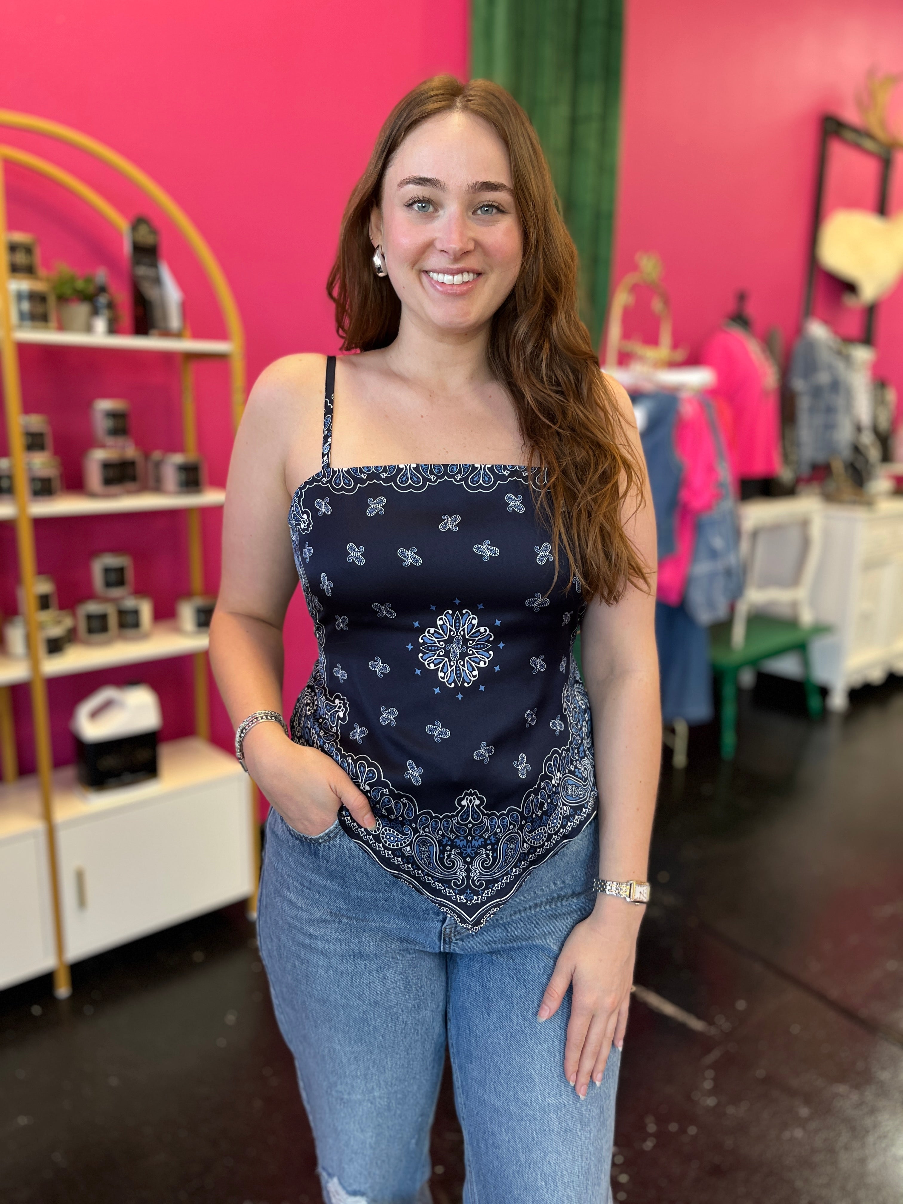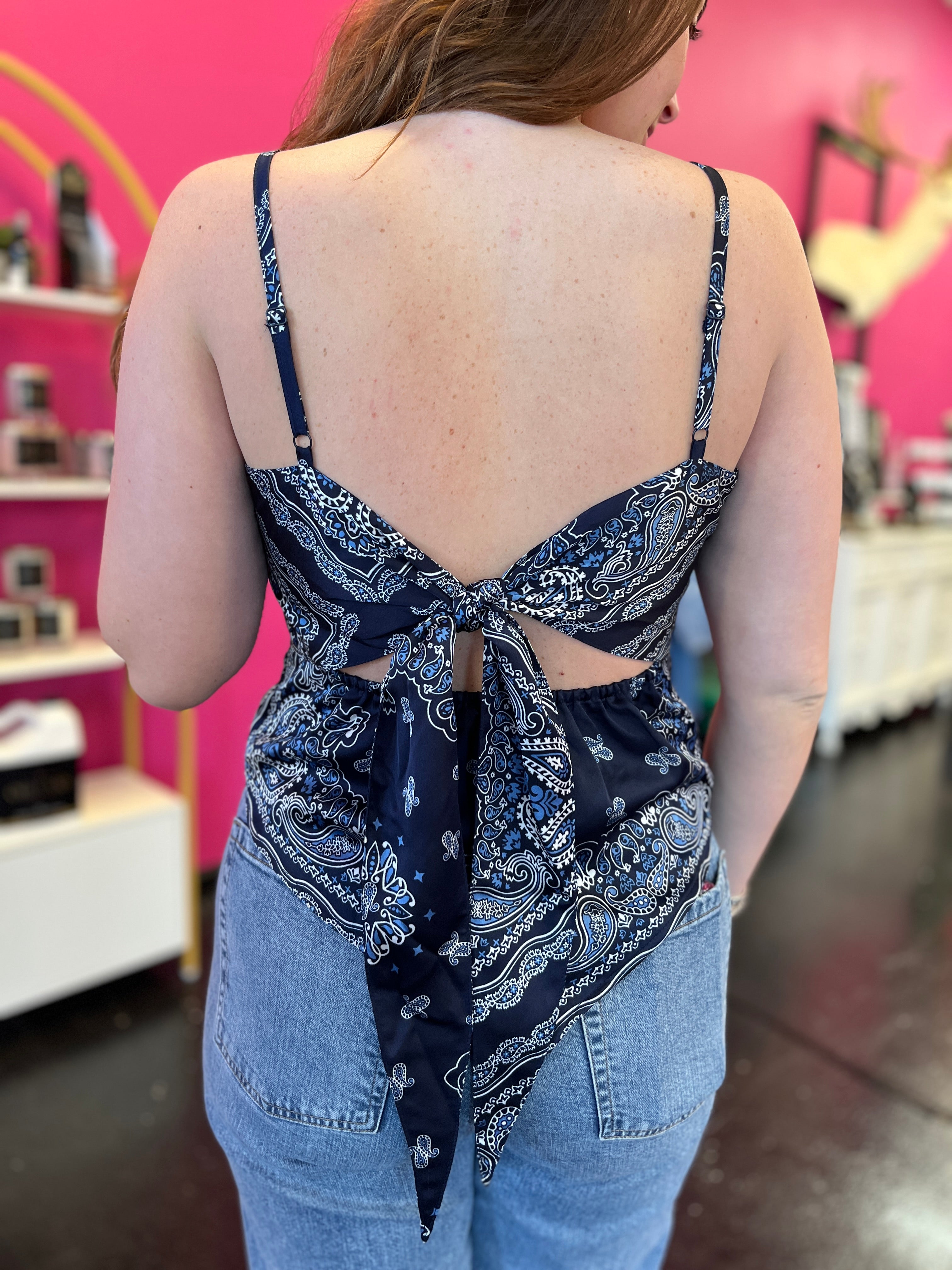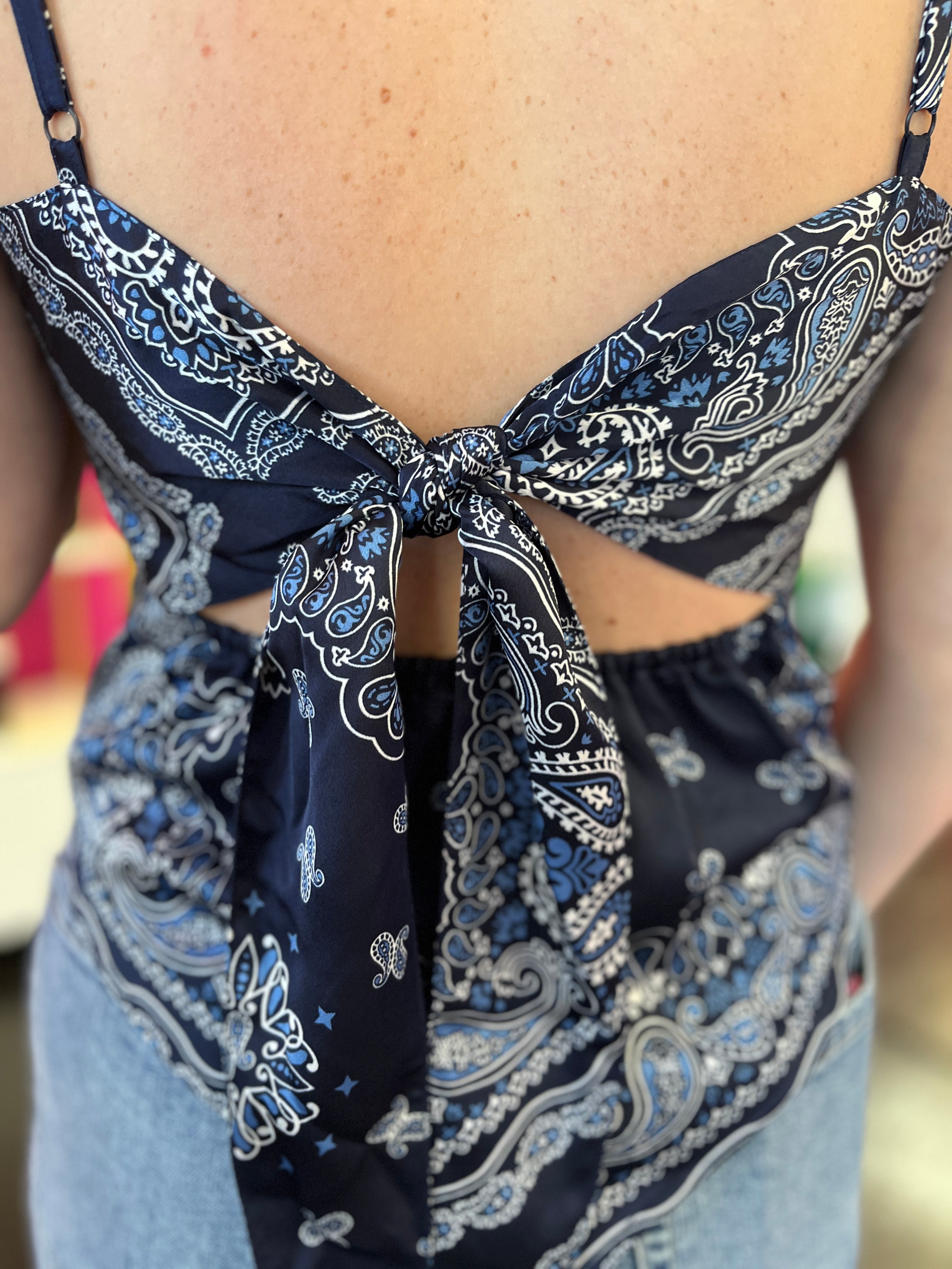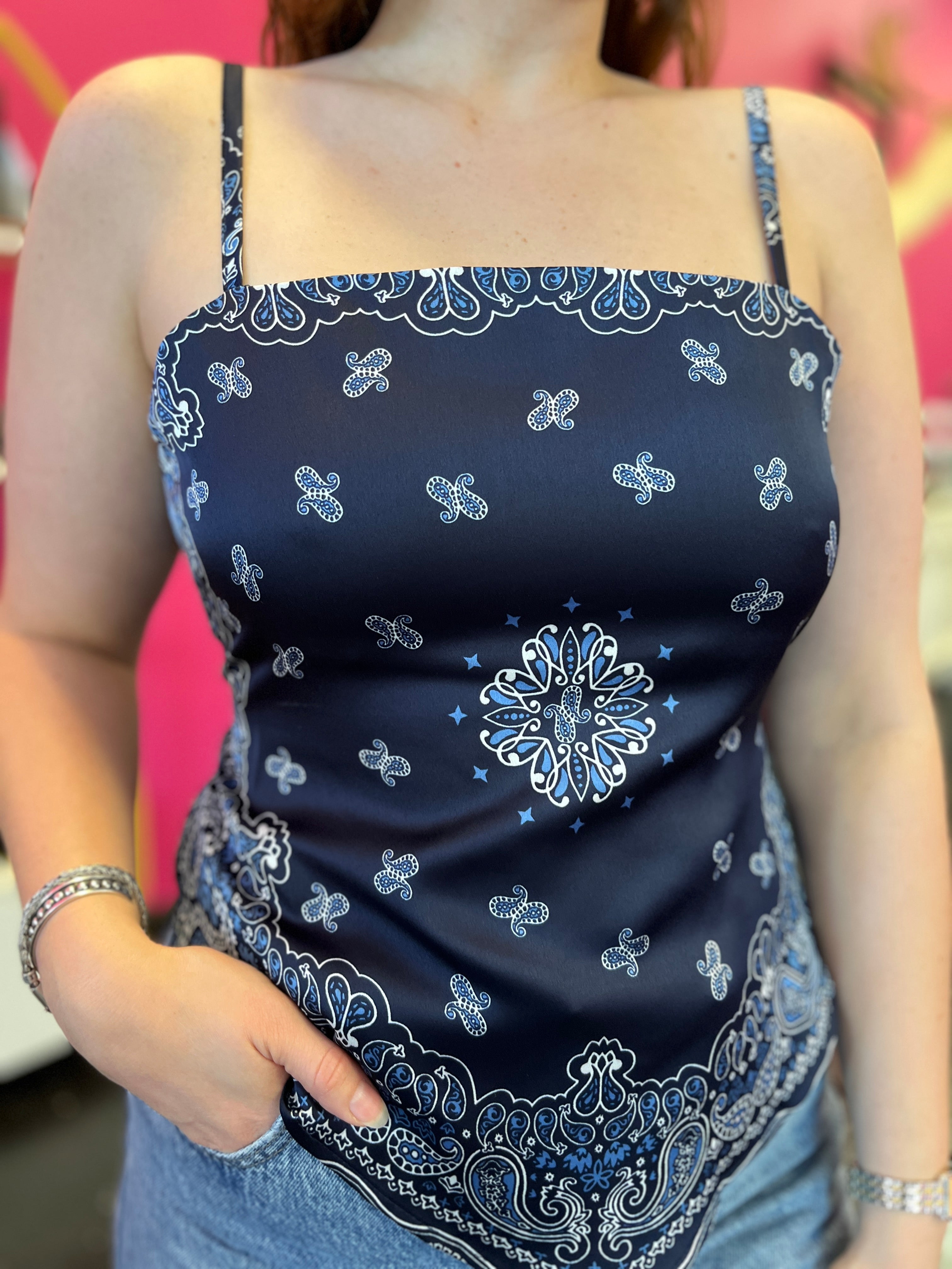 Elevate your casual wardrobe with this adorable navy bandana scarf top. Featuring a charming open tie-back design and adjustable spaghetti straps, it offers both style and comfort. The square neckline and flowing silhouette create a flattering, effortless look. Perfect paired with crisp white bottoms for a fresh, put-together aesthetic that works from day to night.