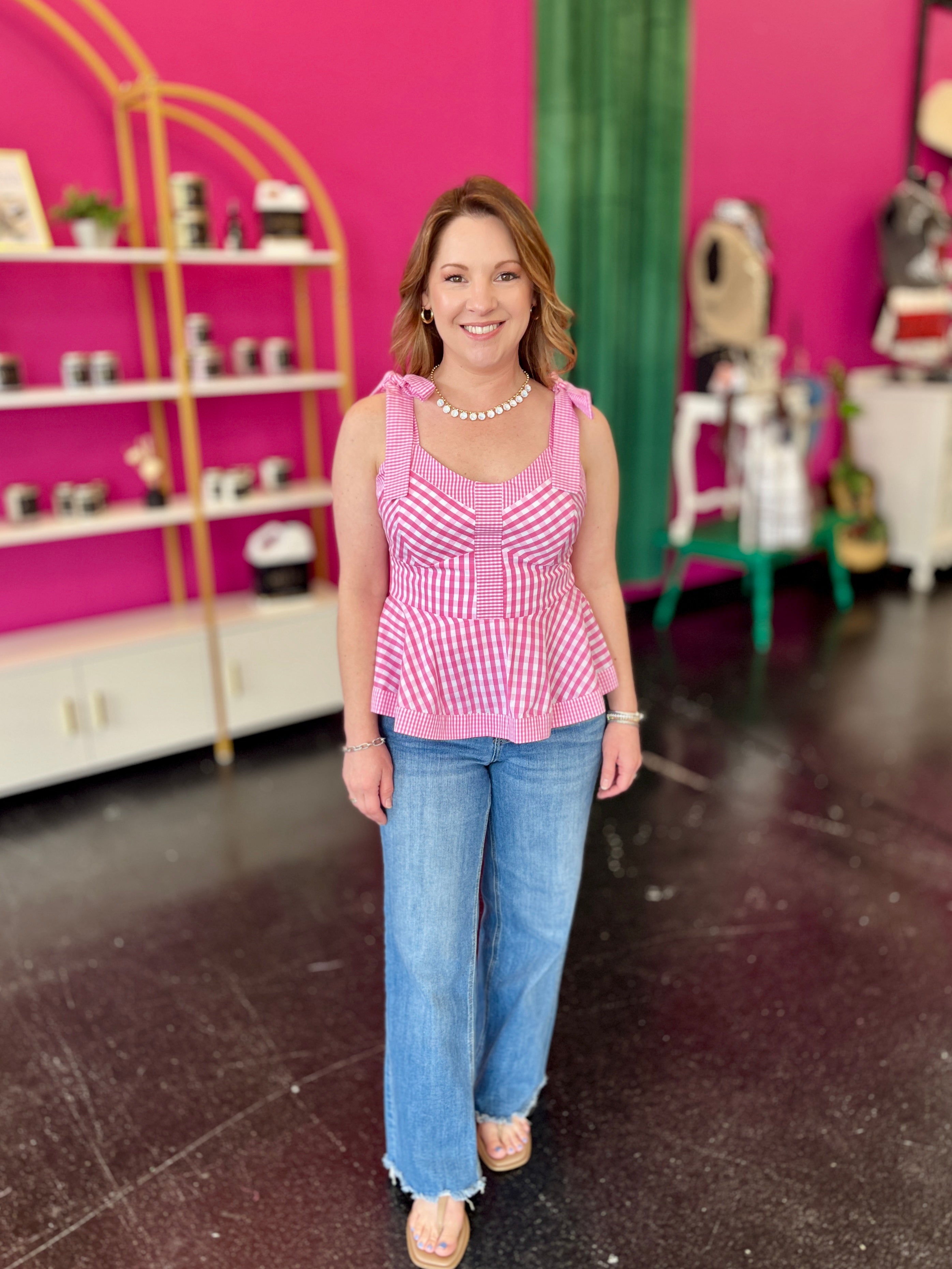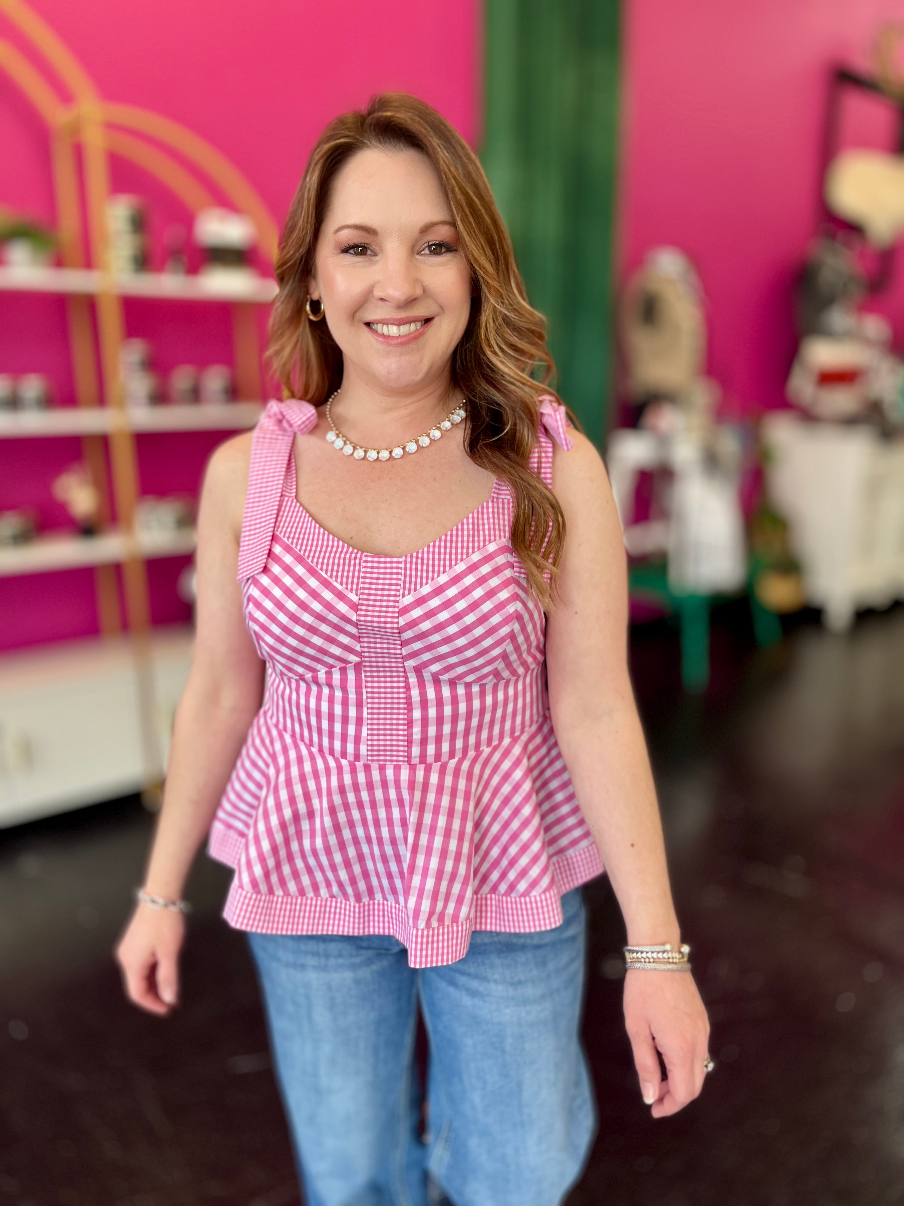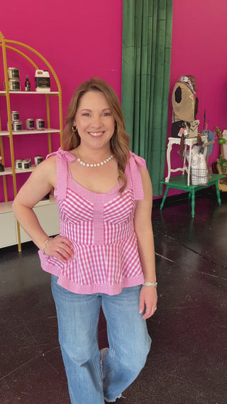 The cutest pink top for summer! This Pink Gingham Bow Tie Top features an adorable bow tie shoulder detail and sweetheart neckline thats perfect for warm-weather outings. The classic pink and white gingham print pairs beautifully with any summer look, while the sleeveless peplum silhouette keeps you cool and comfortable. Dress it up or down—this charming piece is a must-have for your seasonal wardrobe.