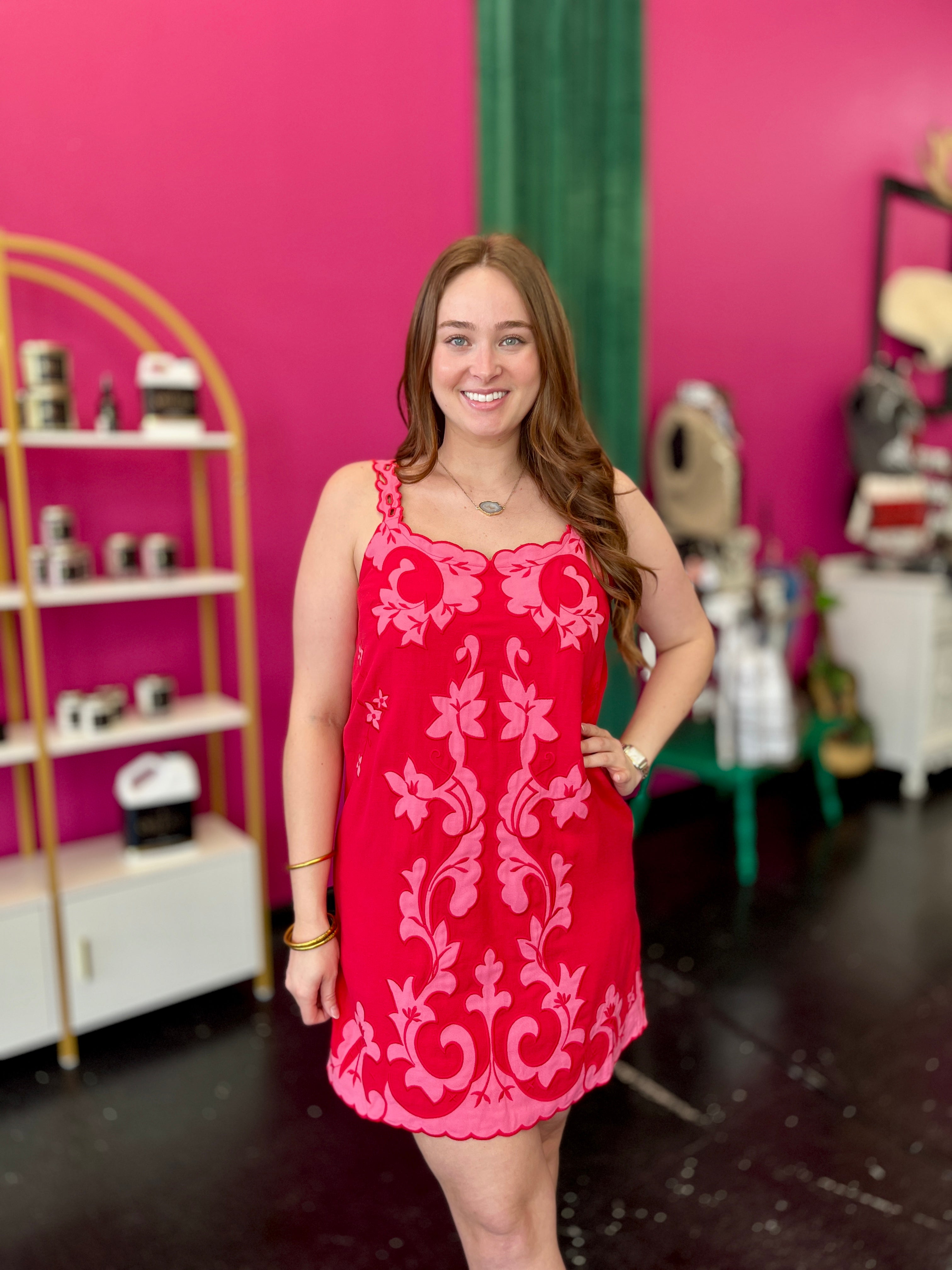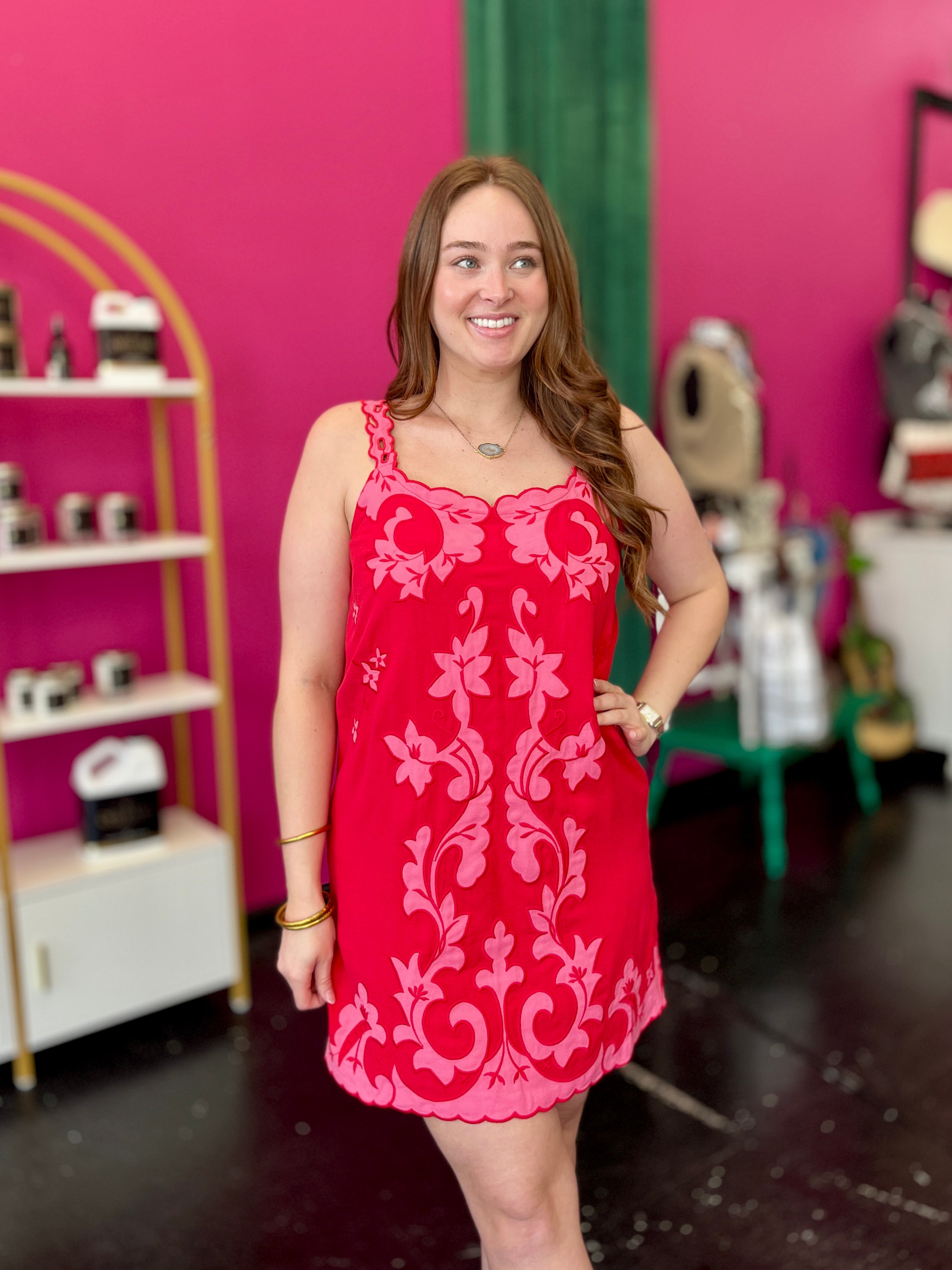 Answer the call of vacation style with this charming Red & Pink Embroidery Shift Dress. The effortless shift silhouette pairs beautifully with delicate pink embroidery throughout, creating an elegant yet relaxed look perfect for getaways and warm-weather occasions. Designed for comfort and sophistication, this dress features a sweetheart neckline, sleeveless embroidery cutout straps, and a scalloped embroidery hem on both front and back. The side zipper ensures an easy fit, while the linen-viscose blend keeps you cool and breathable all day long. Simple, stunning, and ready for adventure.