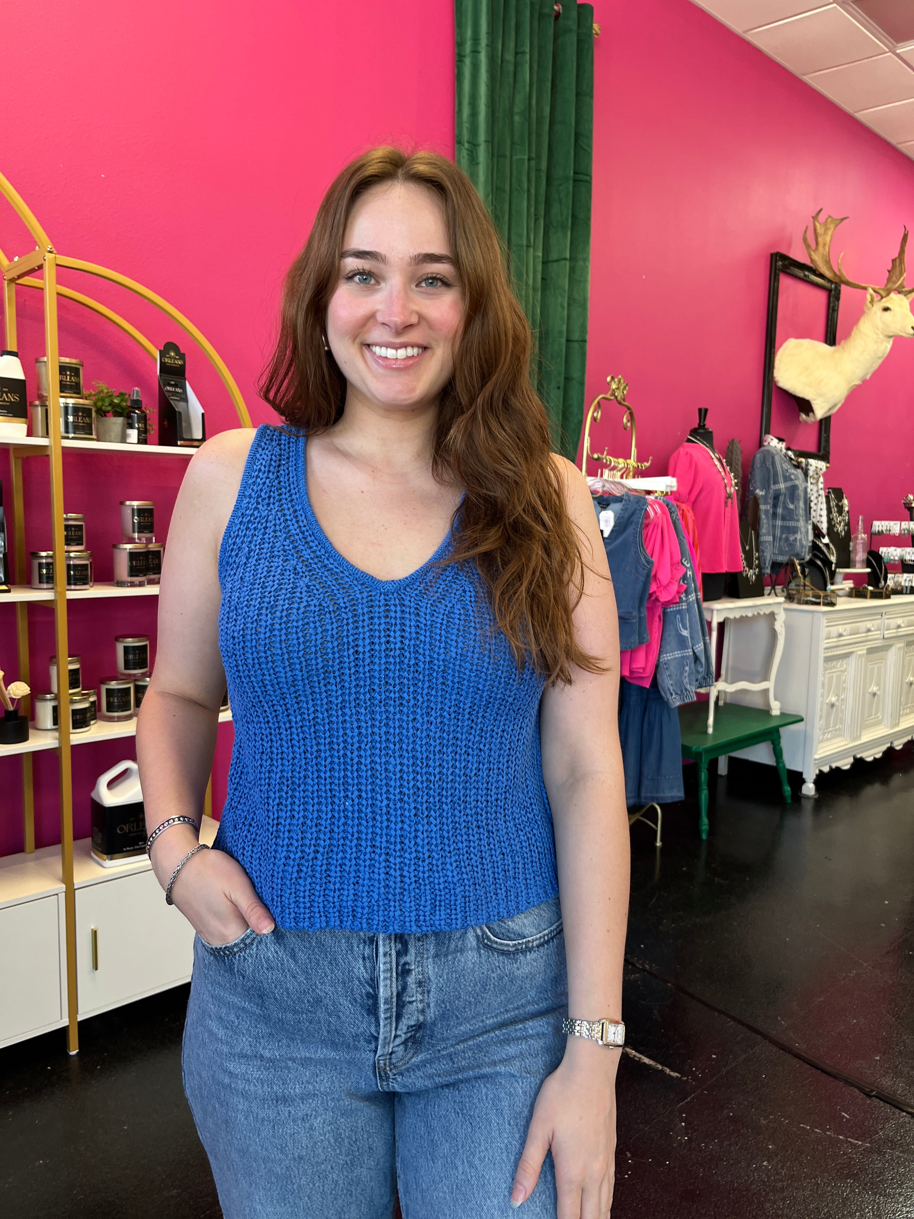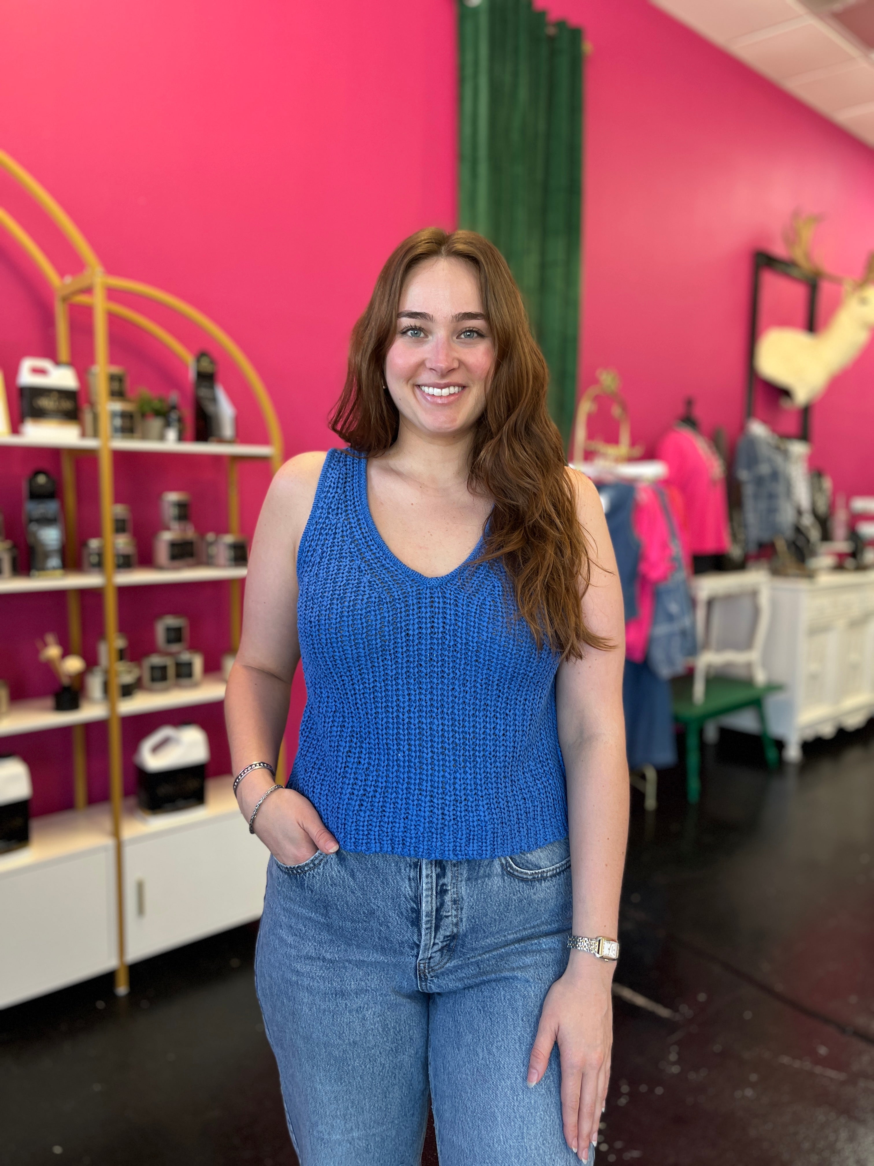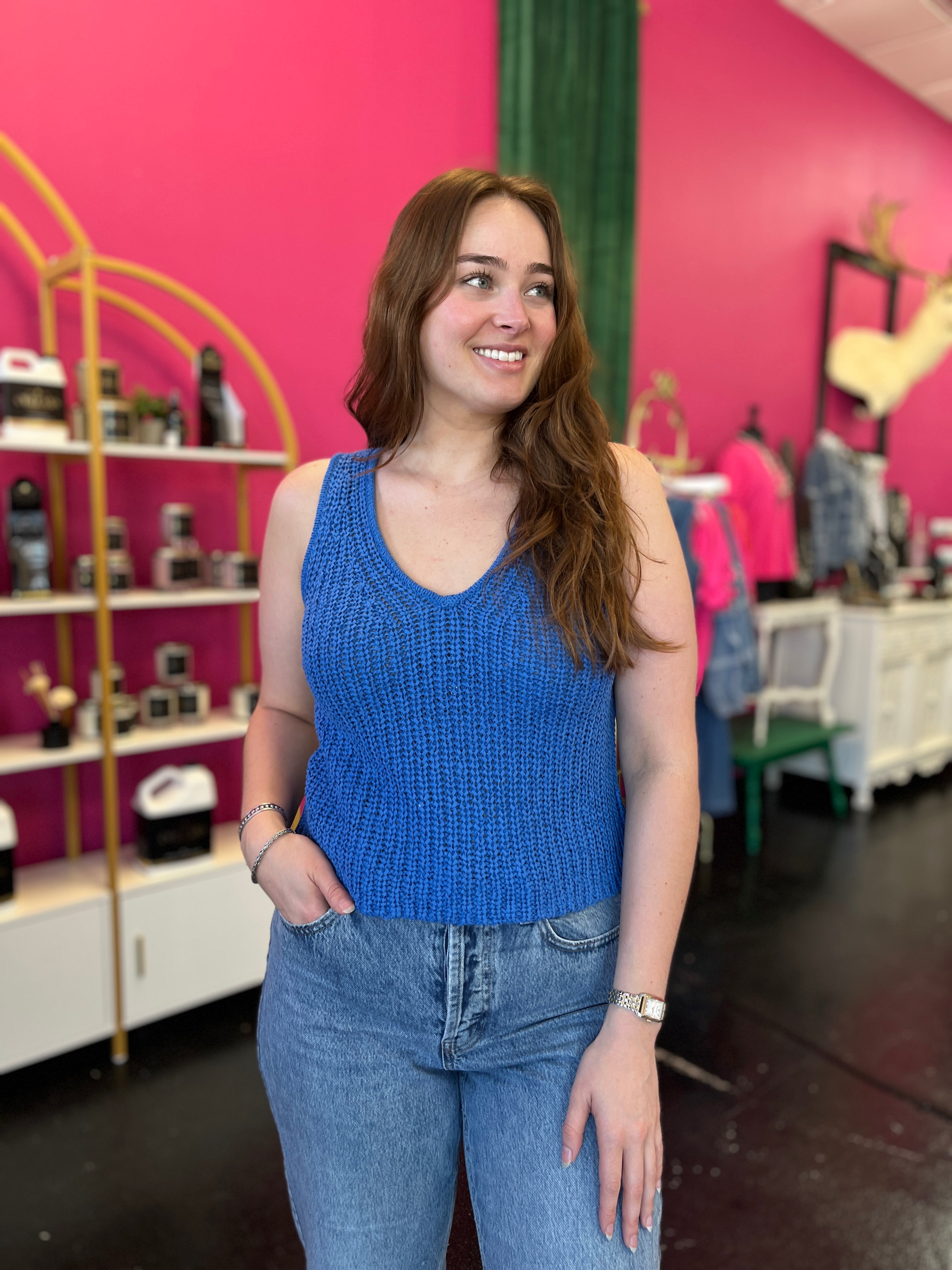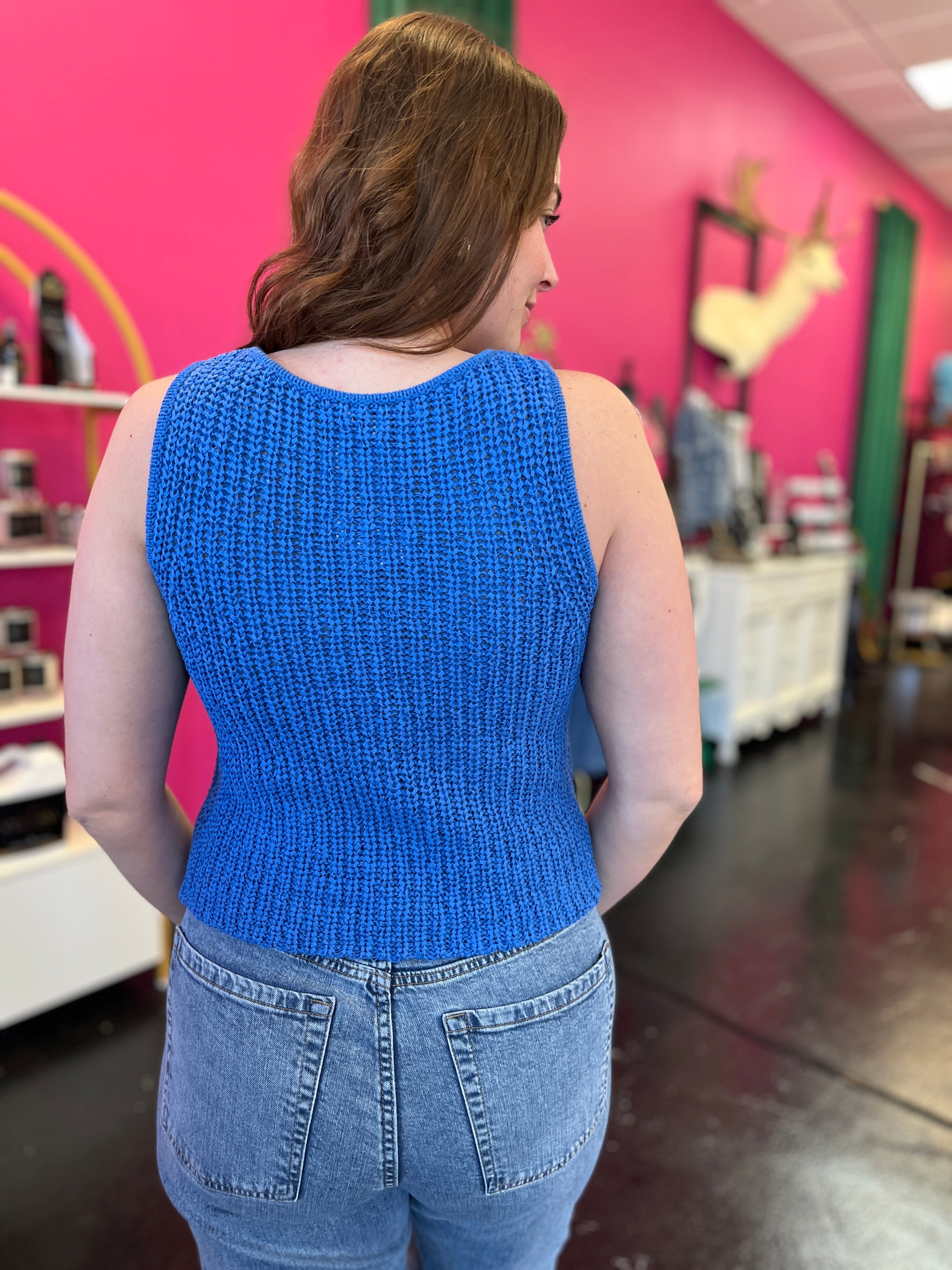 Catch the wave of summer style with this adorable surf blue crochet knitted top. The breezy, textured knit is perfect for warm-weather days and pairs beautifully with white bottoms for a fresh, clean look or patterned pieces for a playful vibe. Lightweight and effortlessly cute, it's your go-to piece for laid-back summer vibes.