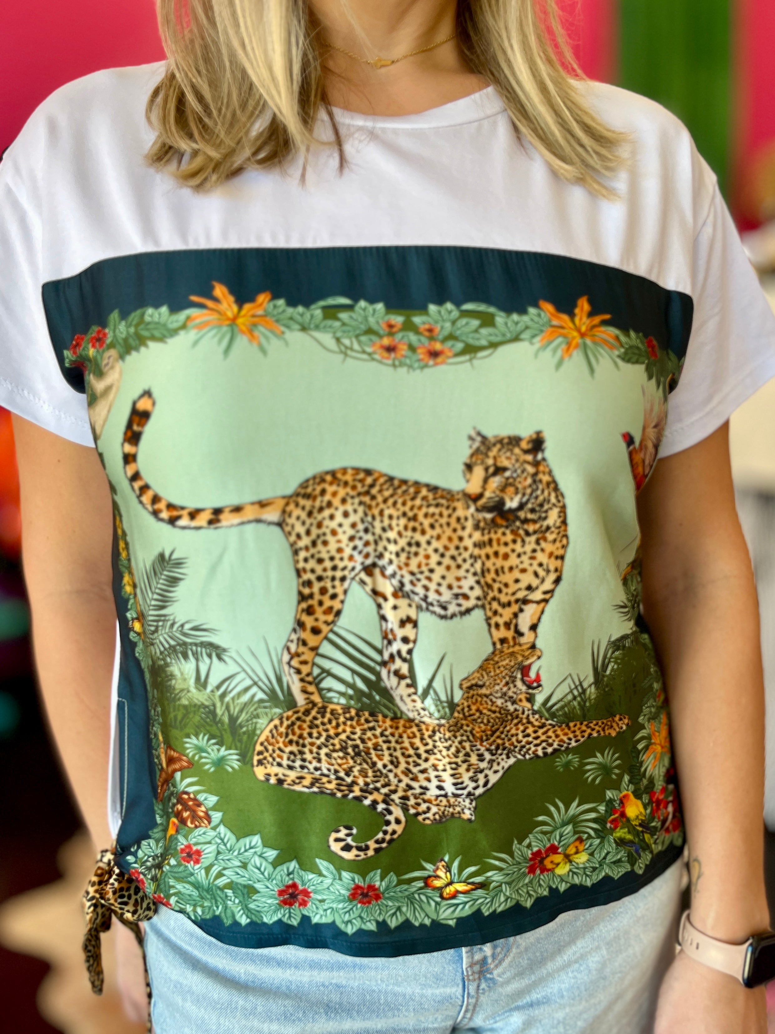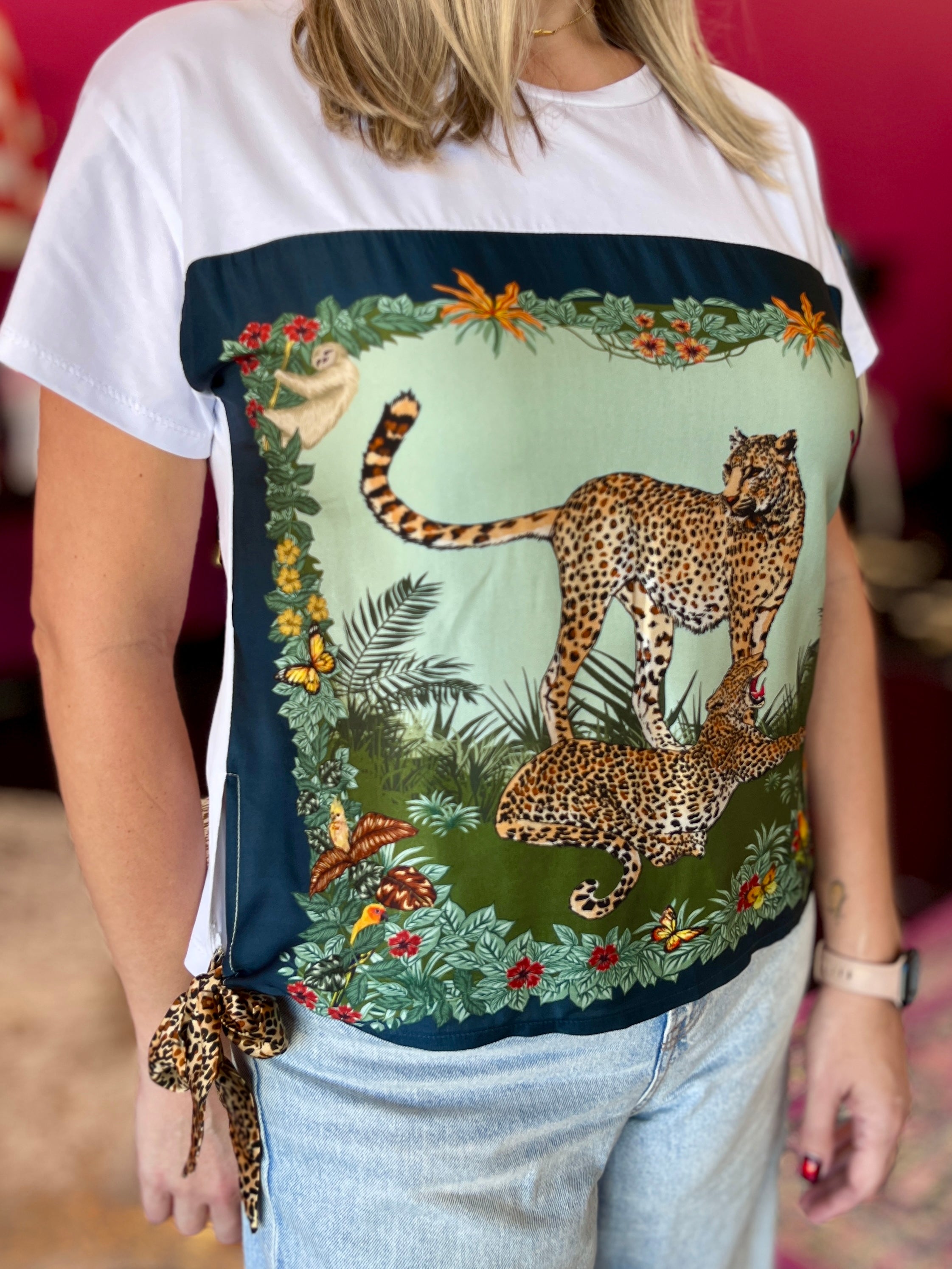 Step out with confidence in the Welcome to the Jungle White Tee, featuring a playful leopard scarf design that makes it truly one of a kind. This tee effortlessly blends comfort with a touch of wild style, perfect for adding a fun twist to your everyday look. Let your outfit do the talking and turn heads wherever you go!