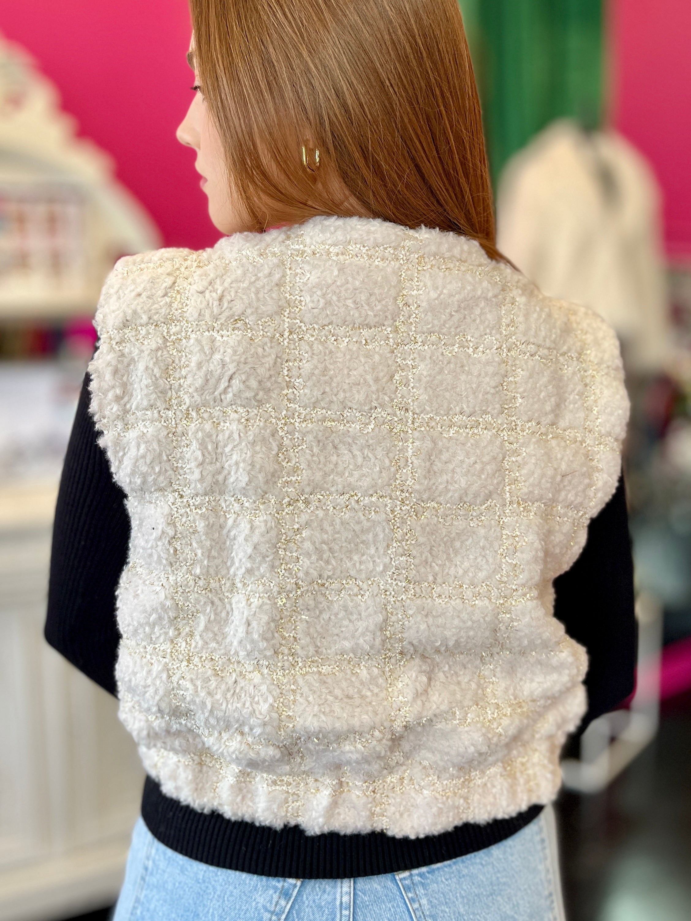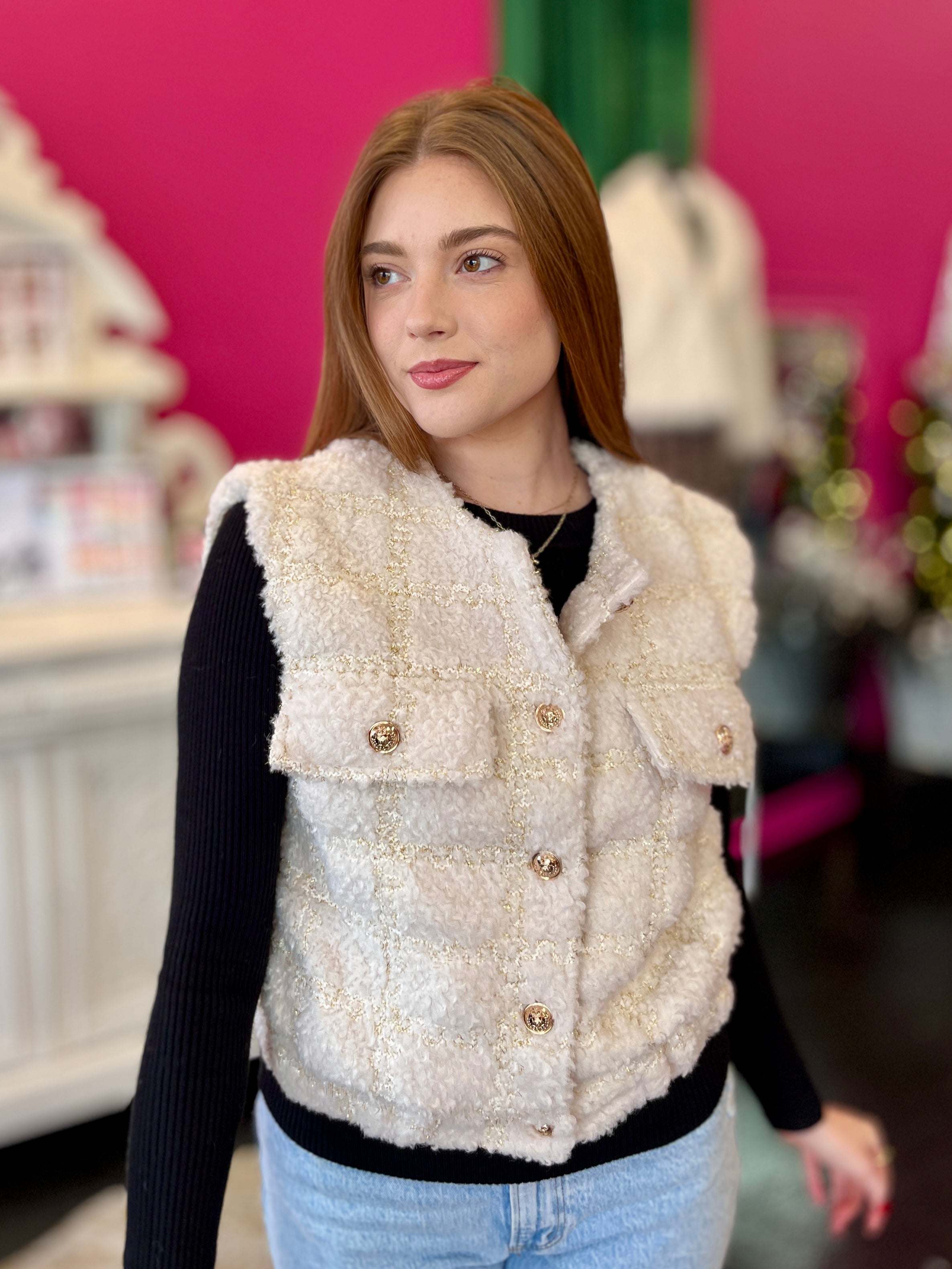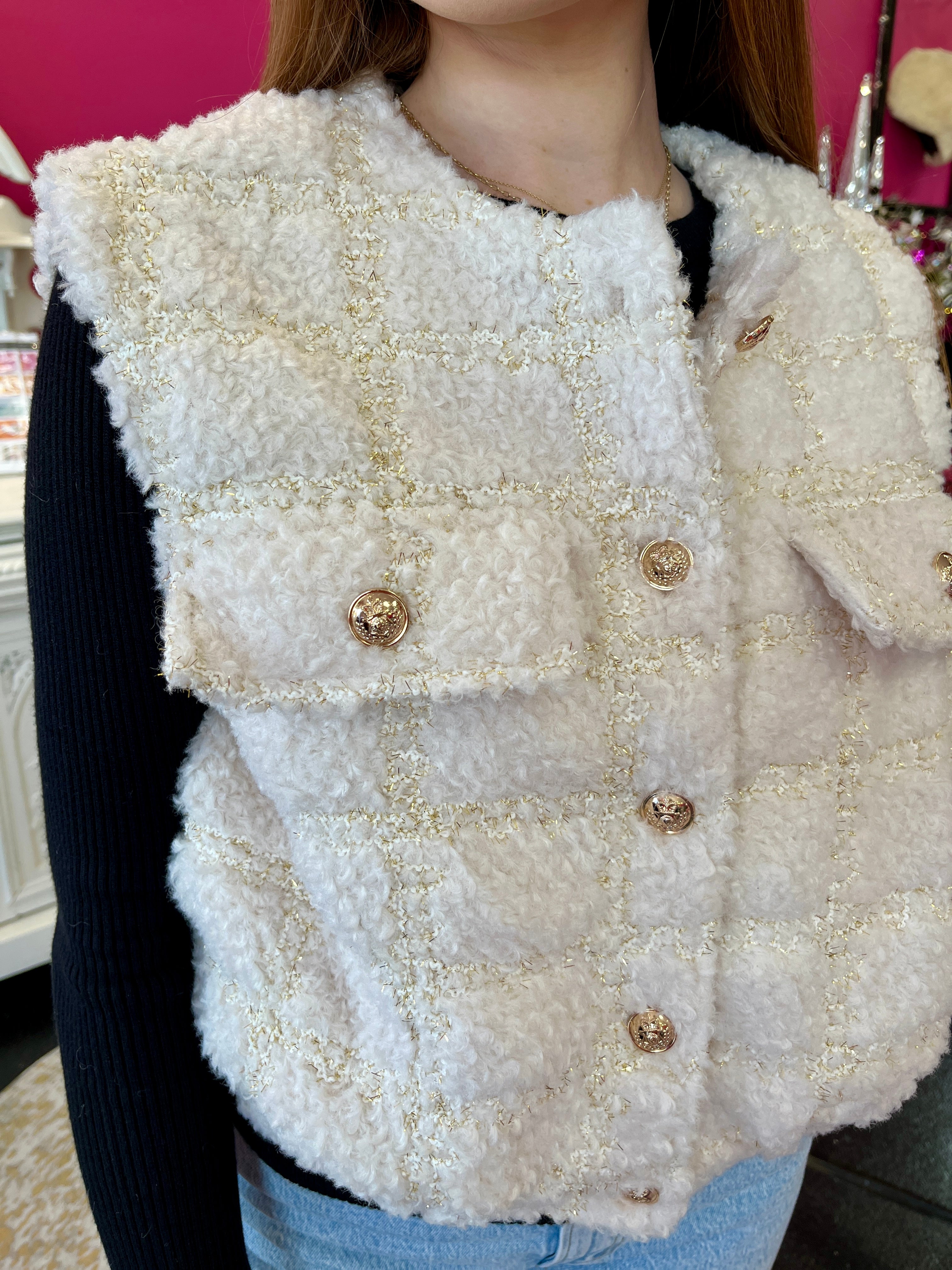 Elevate your wardrobe with this adorable cream tweed vest that's giving major style goals! The soft, textured tweed fabric brings that coveted sophisticated charm while staying effortlessly trendy. Perfect for layering over your favorite tee or dress, this piece instantly transforms any outfit into something chic and put-together. Whether you're dressing up for a night out or keeping it casual, this cream beauty is your new go-to for that polished, fashion-forward look that turns heads.