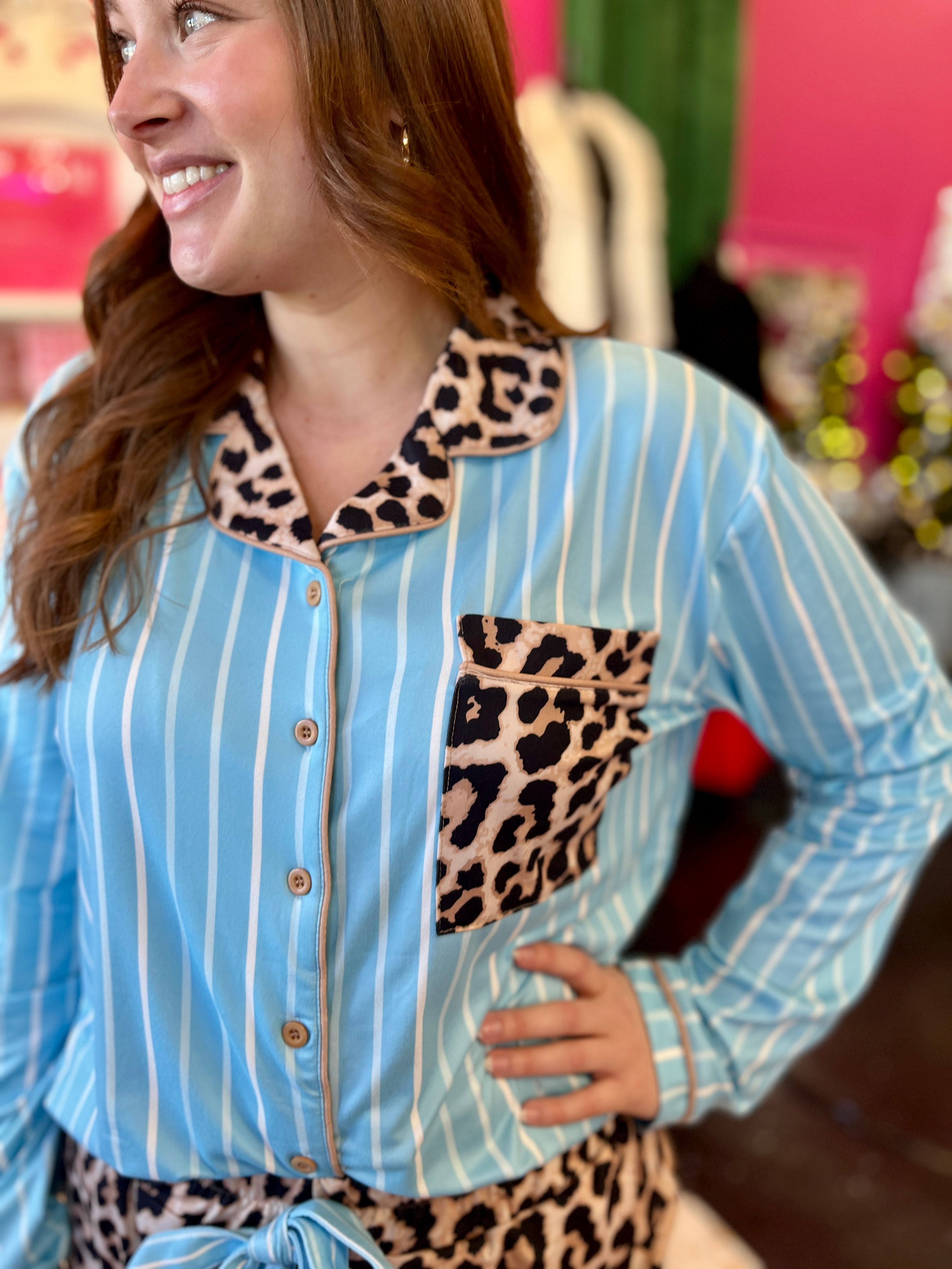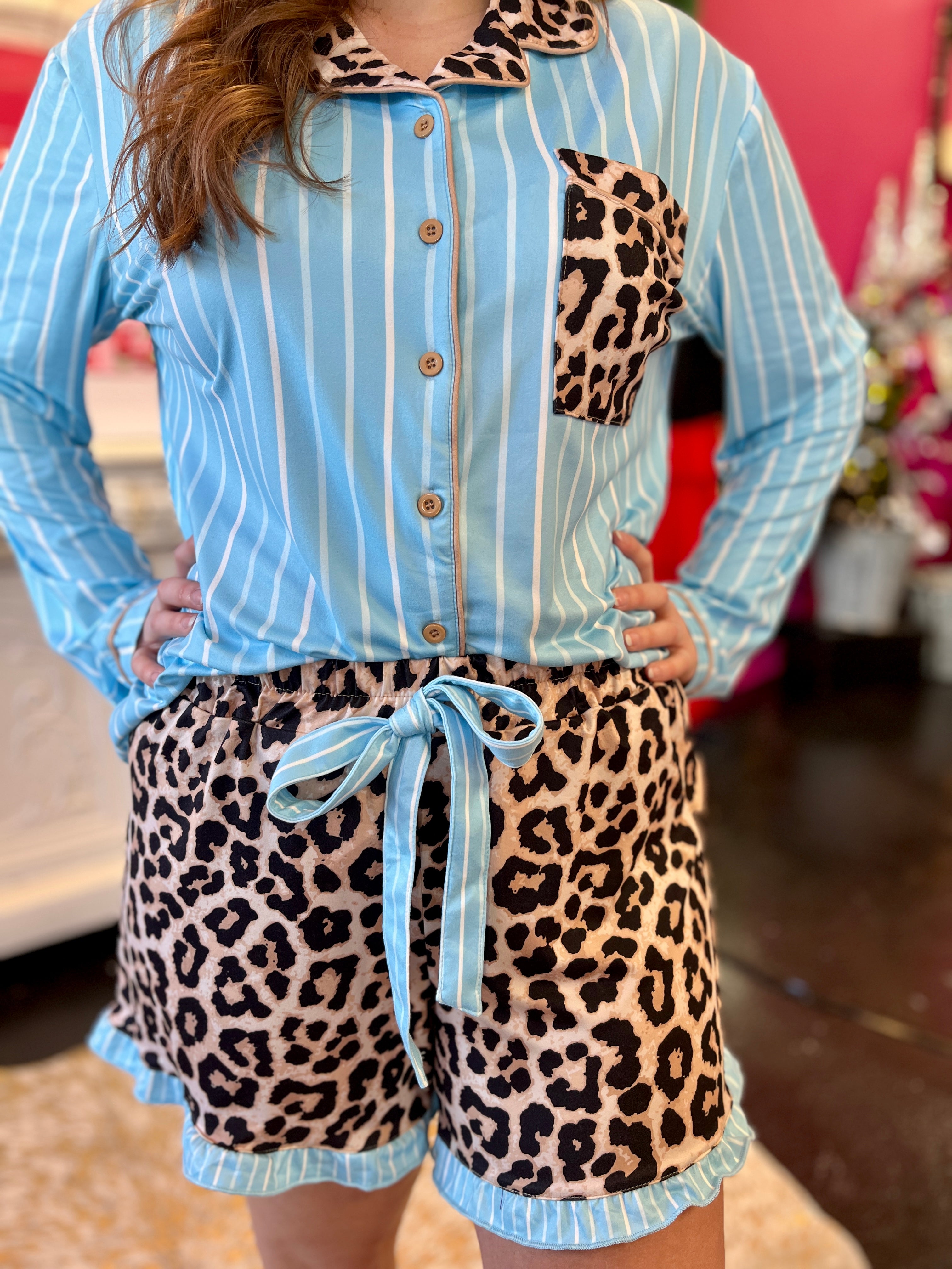 Snuggle up in style with these adorable Blue & Leopard Couture Ruffle Pajama Set! Featuring a fun leopard print paired with soft light blue stripes, this cozy set brings playful flair to bedtime. The charming ruffle details add that extra touch of cuteness, while the ultra-soft fabric feels like a warm hug against your skin. Perfect for lounging, sleeping, or just feeling fabulous all day long. Sweet dreams never looked so good!