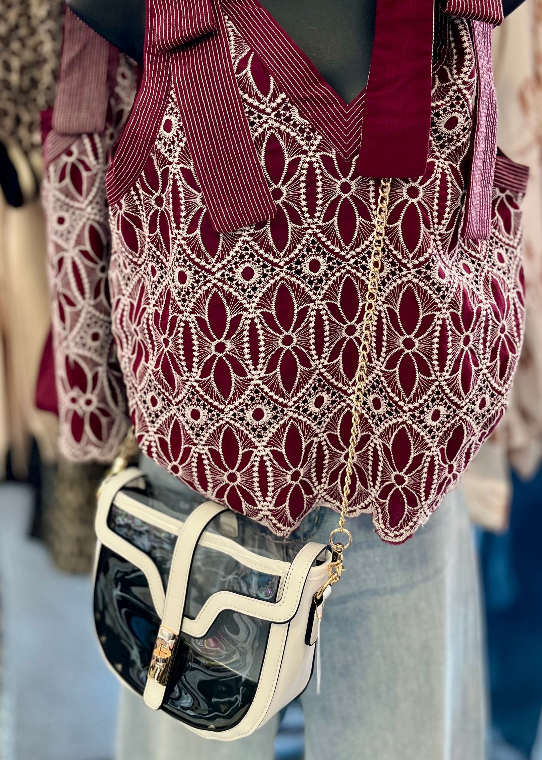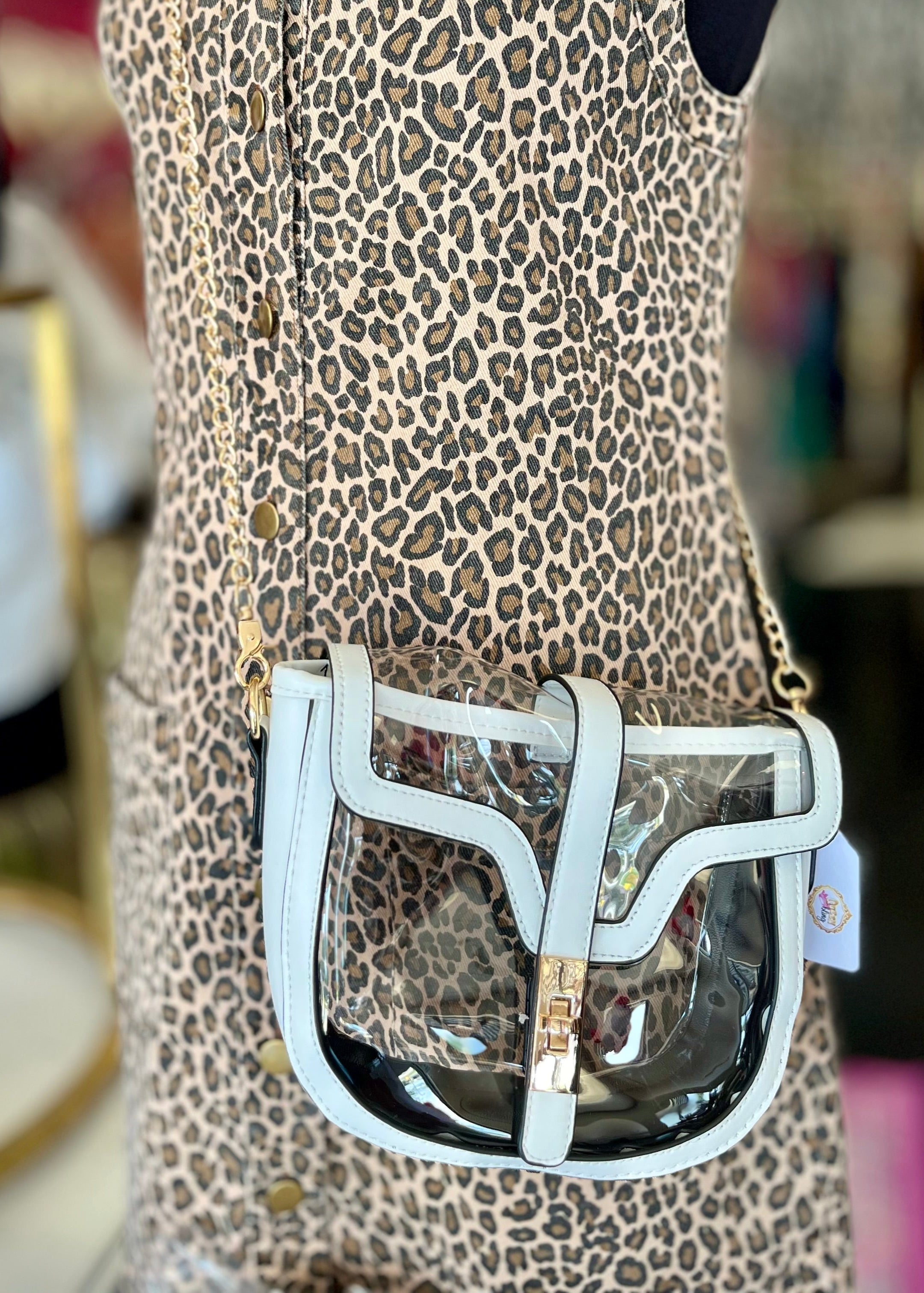 This adorable Claire White & Clear Saddle Bag is your new gameday must-have! The transparent body keeps it trendy and easy to spot your essentials, while the chic white trim and sparkling gold hardware add just the right touch of glam. Light, fun, and stylish—this bag makes every game day feel like a winning play!