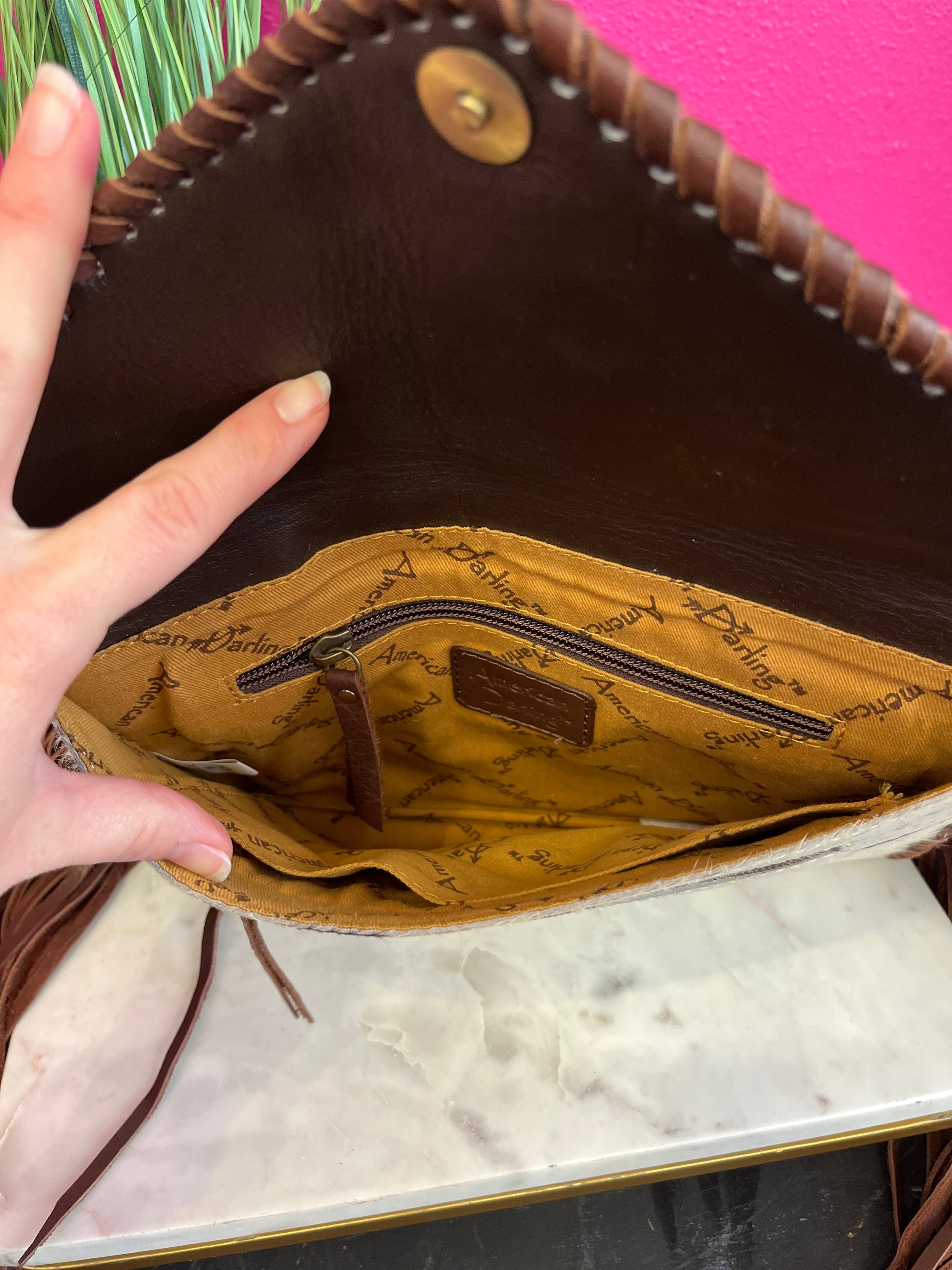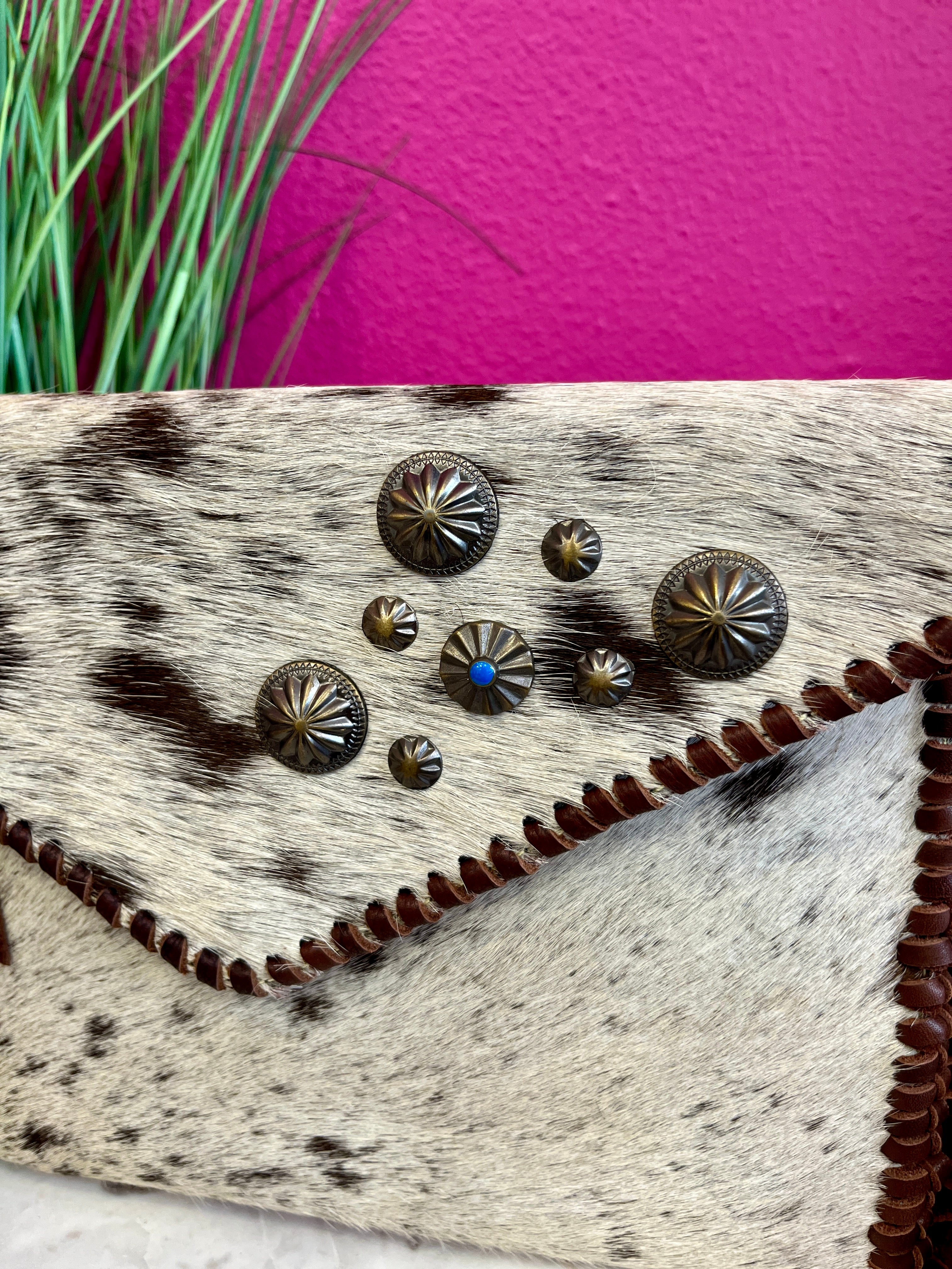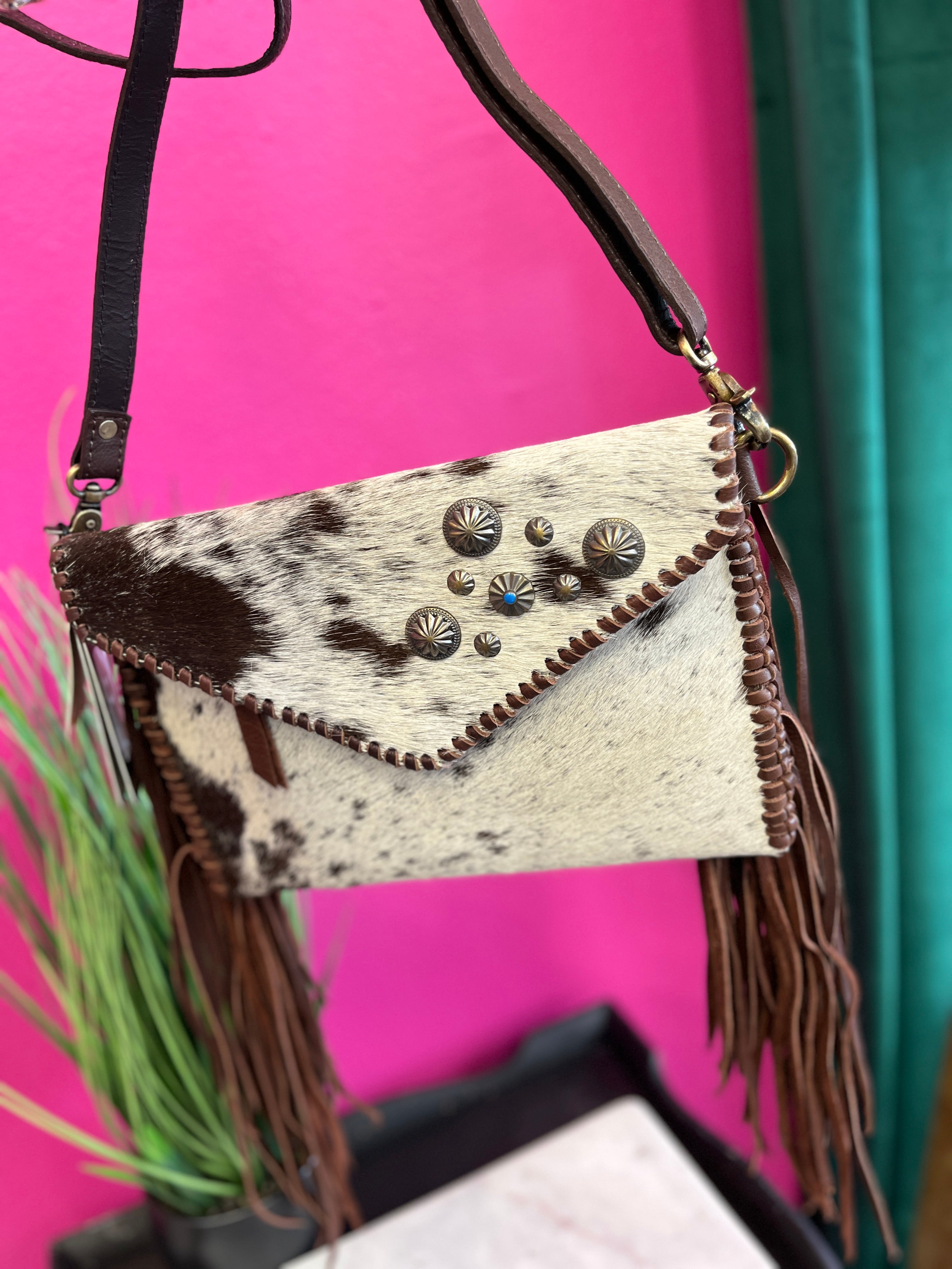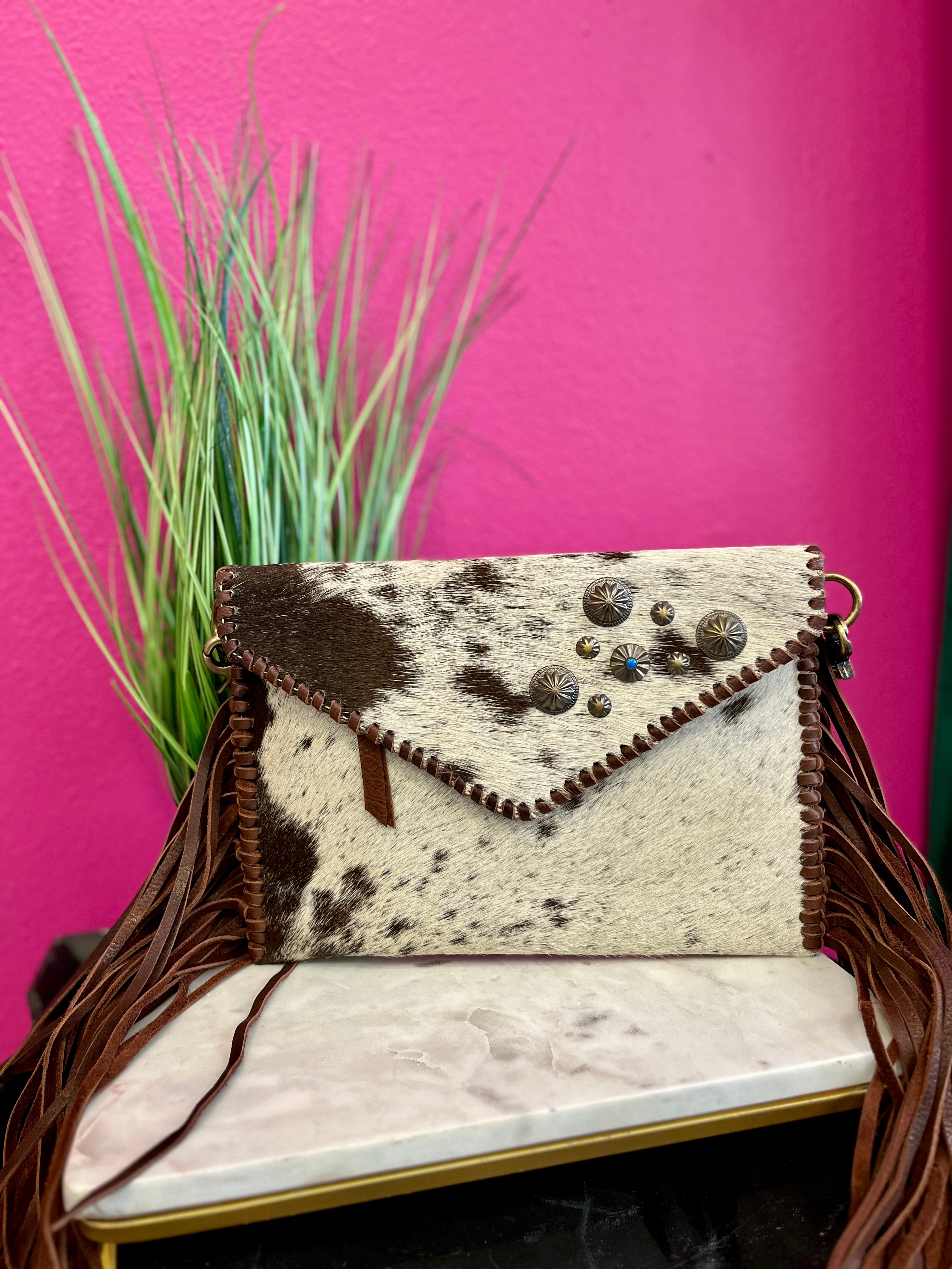 Saddle up for style with this stunning cowhide envelope purse! Crafted from genuine cowhide with eye-catching fringe detailing along the sides, it's a statement piece that works double duty. Carry it as a clutch for an evening out or wear it crossbody for hands-free convenience. The perfect blend of Western charm and everyday versatility.
