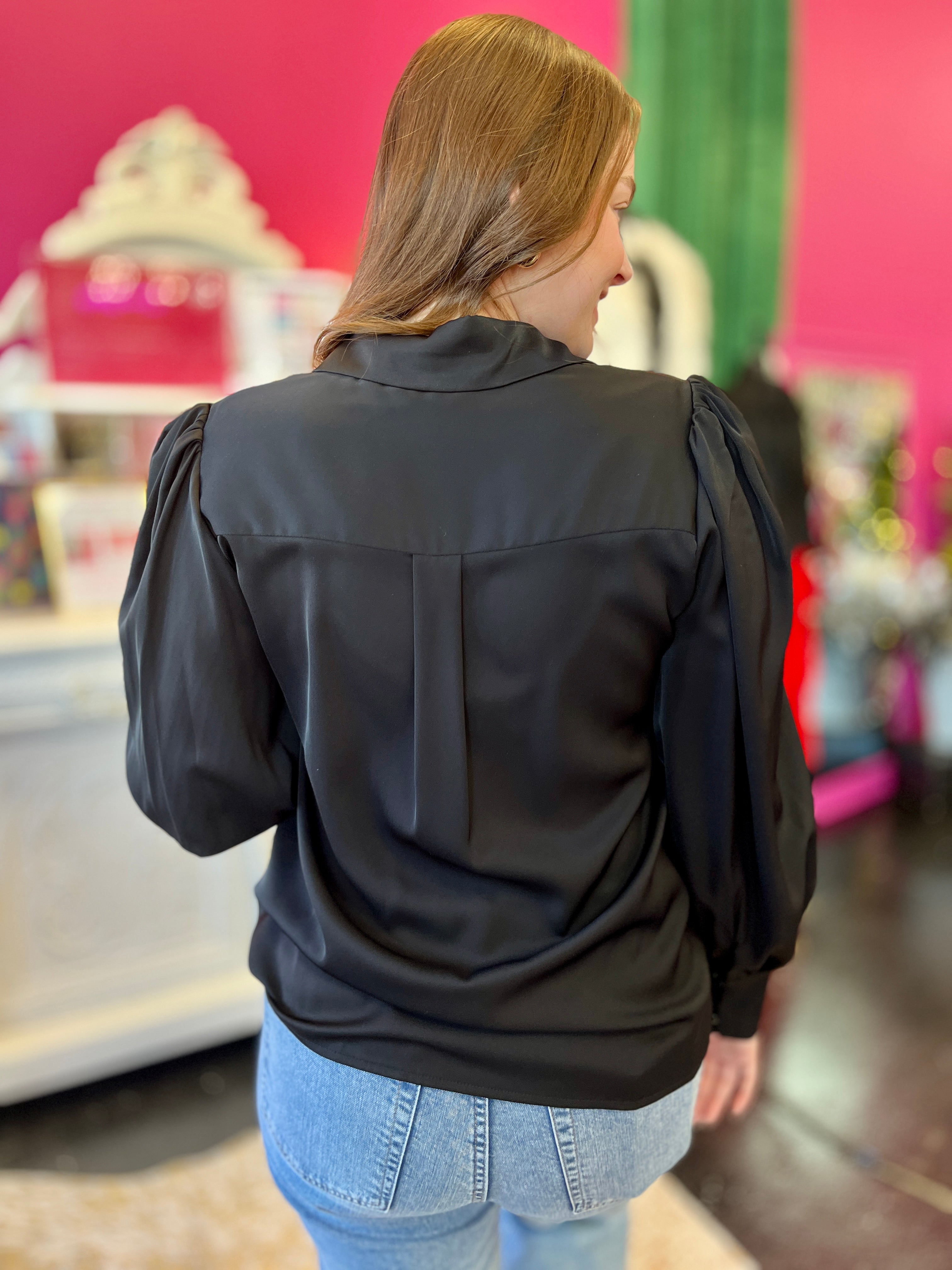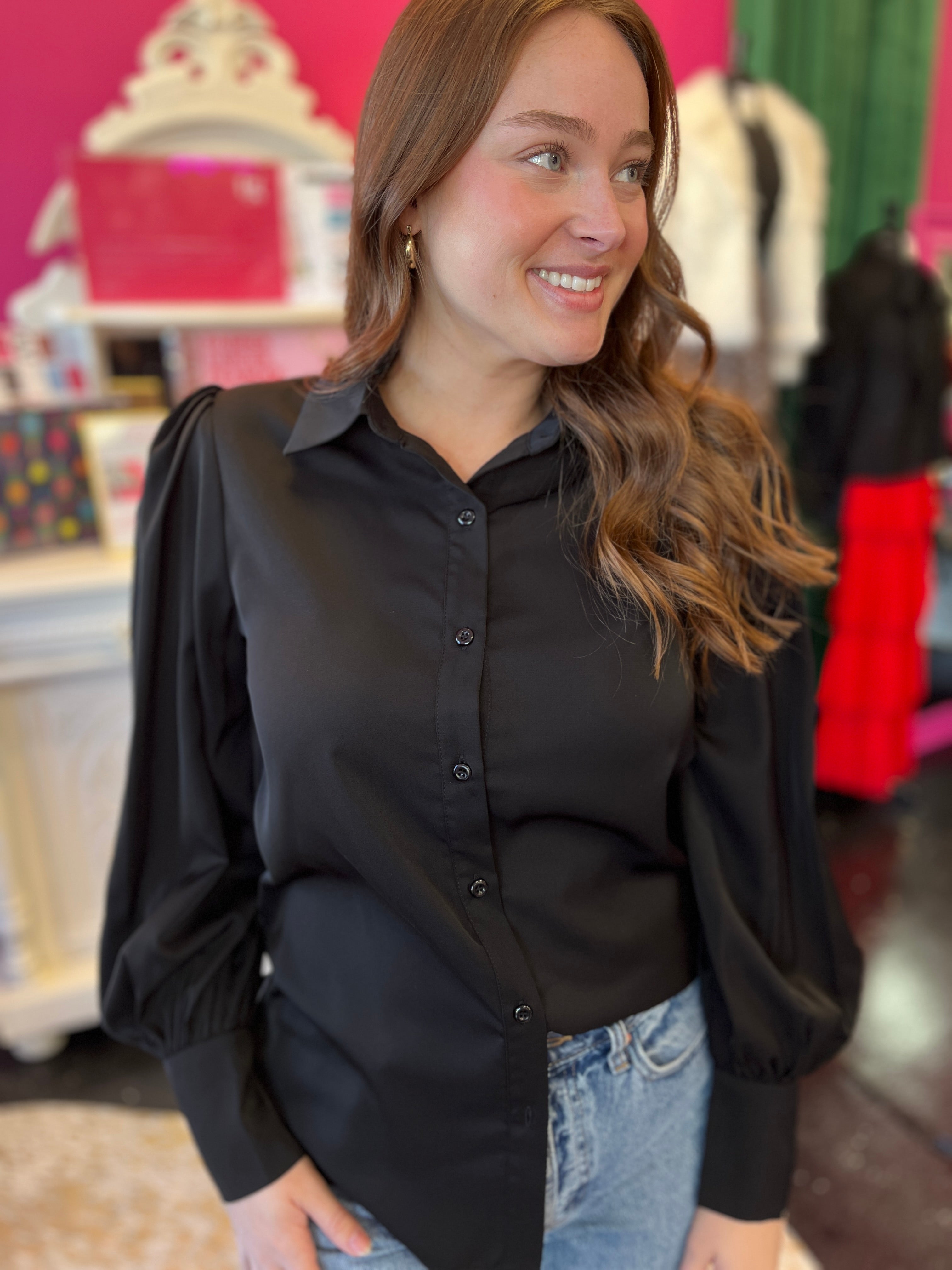 Meet your new wardrobe essential! This adorable black button-up top is the ultimate blank canvas for your style. Dress it up with a blazer for the office, tie it at the waist for a casual vibe, or layer it under your favorite pieces. The classic black hue pairs with literally everything, making it endlessly versatile. Whether you're going preppy, edgy, or effortlessly chic, Betty's got your back. A closet staple that works as hard as you do!