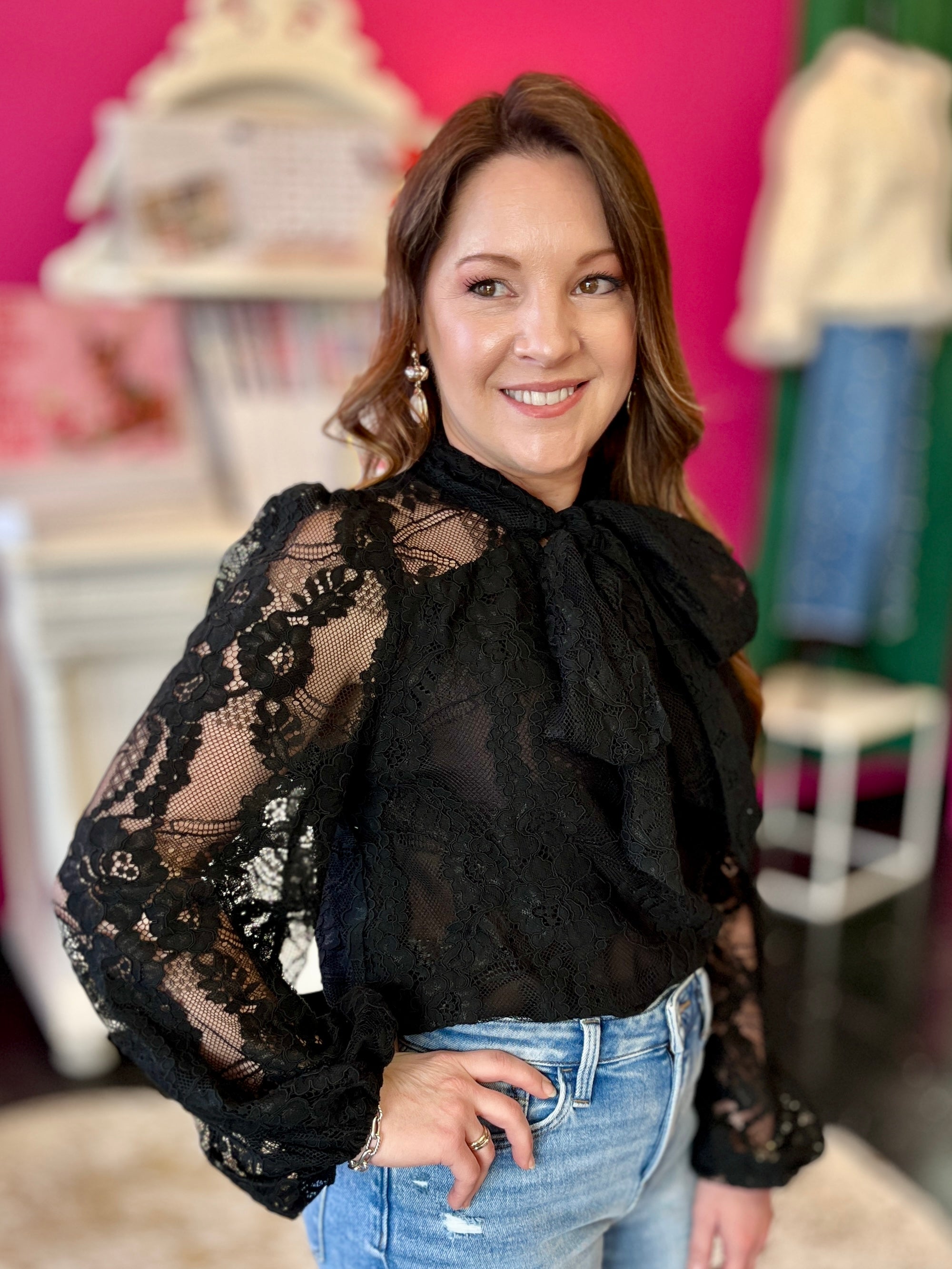 Elevate your holiday look with this stunning black lace bow top! The delicate lace detailing pairs beautifully with the charming tie bow neckline, creating an effortlessly chic vibe. Dress it up for a festive party or keep it casual with your favorite jeans—this versatile piece works for any occasion. Whether you're hitting the dance floor or grabbing cocktails with friends, you'll feel confident and fabulous in this wardrobe essential.