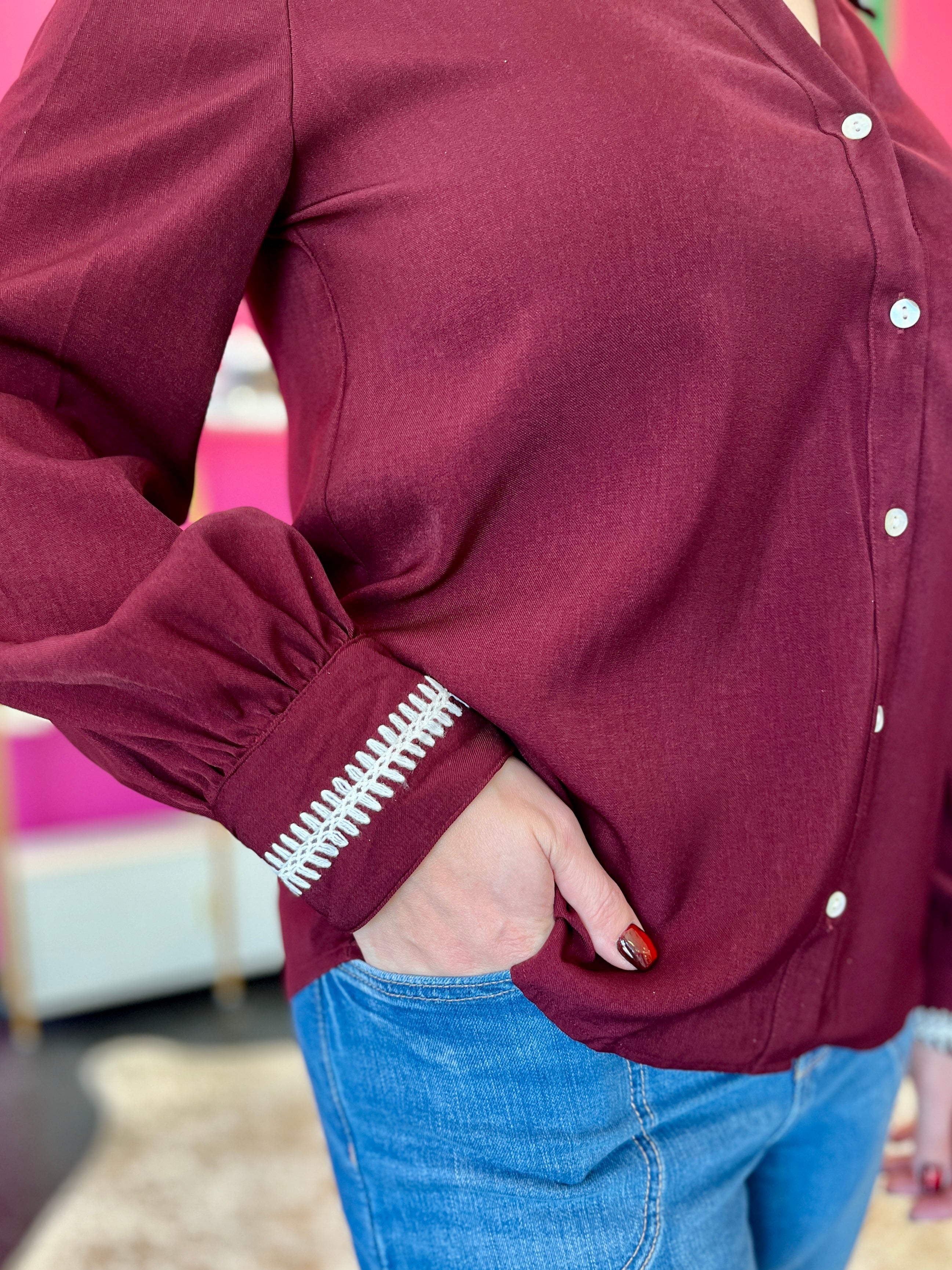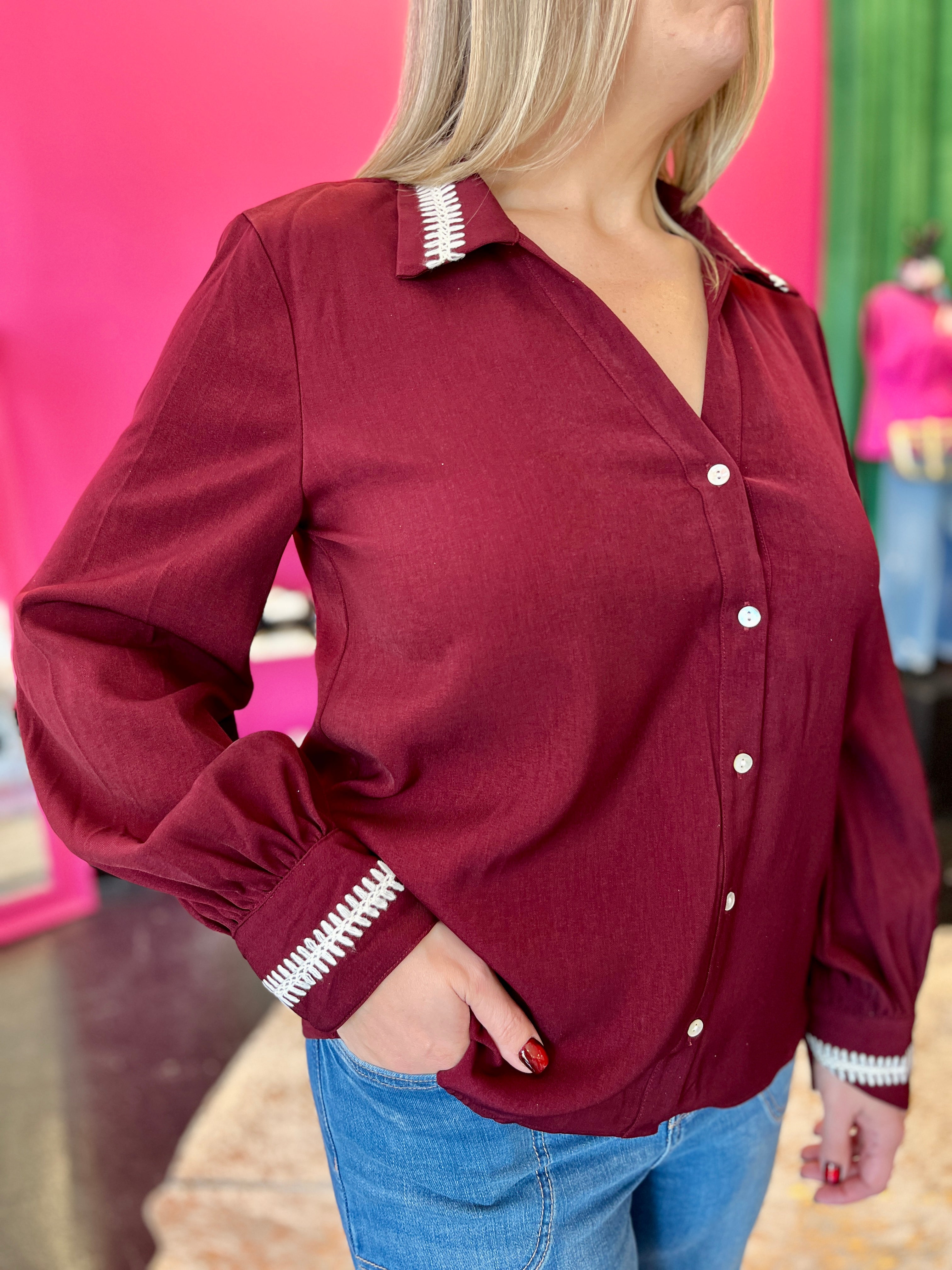 Burgundy Stitched Collar Button Up Top