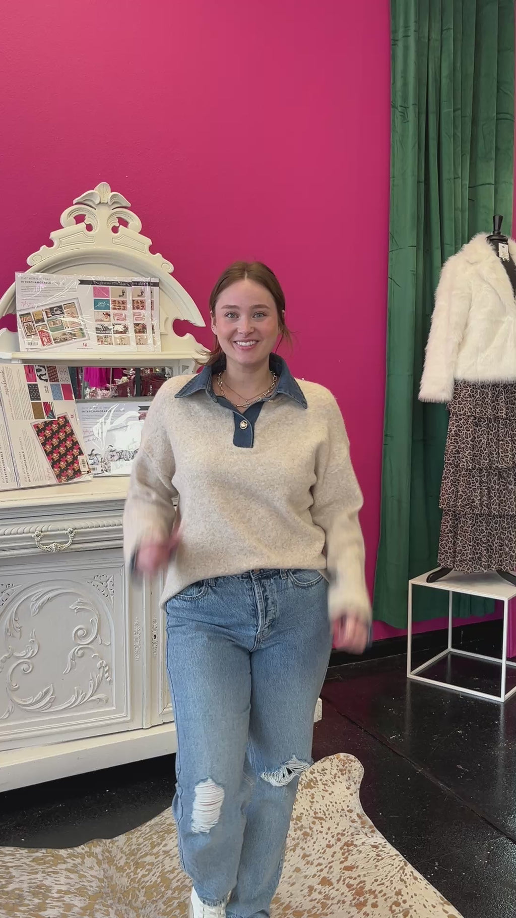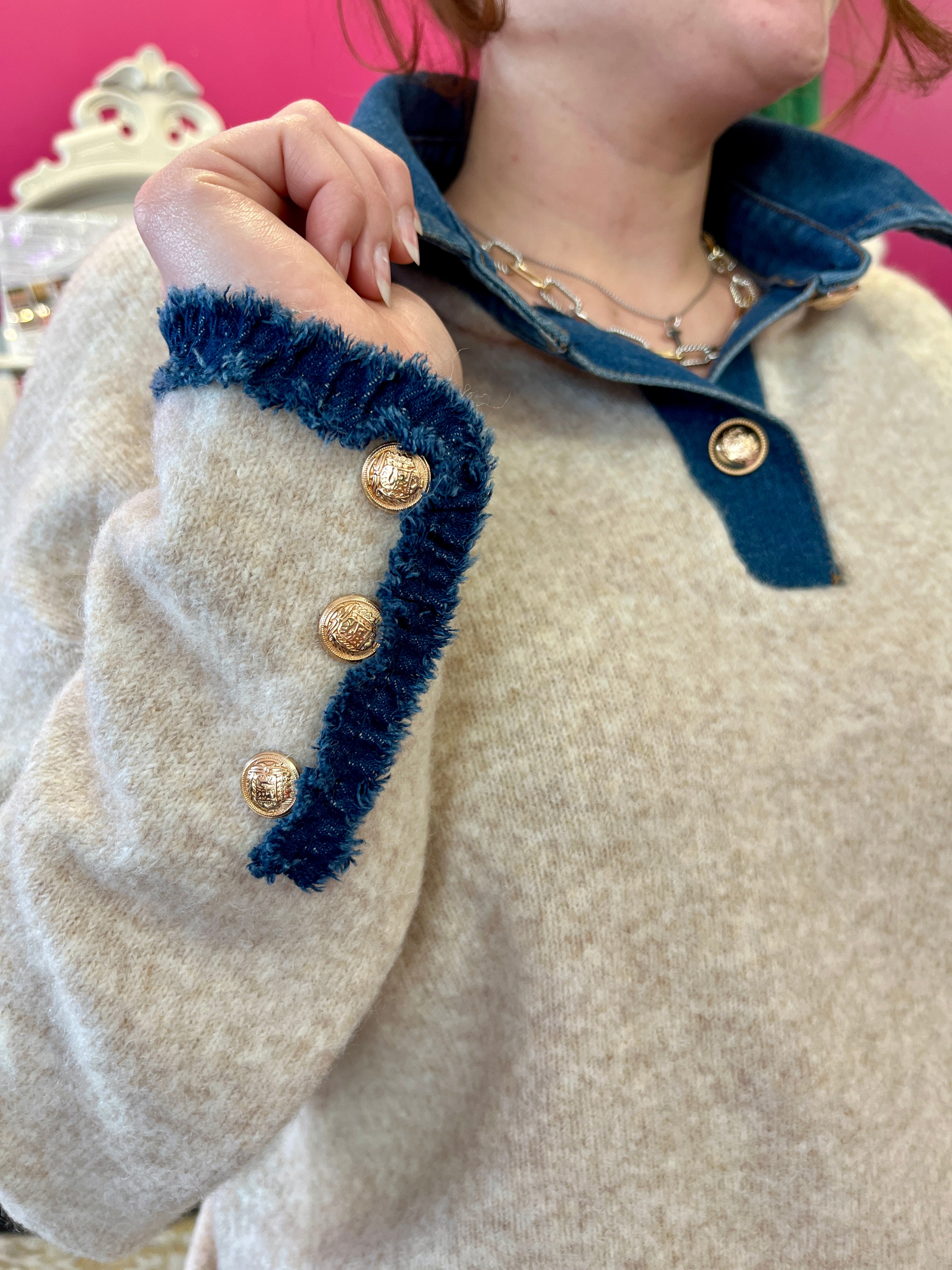 Denim Delight Natural Sweater This adorable sweater brings effortless charm with its signature denim collar and denim-trimmed sleeves that add a playful edge to a timeless piece. Crafted in a beautiful, soft natural color, it's the perfect blend of cozy comfort and cute style. Whether you're dressing up for a casual outing or keeping it relaxed at home, this sweater delivers that sweet spot between trendy and wearable. A wardrobe essential that makes you smile every time you put it on!