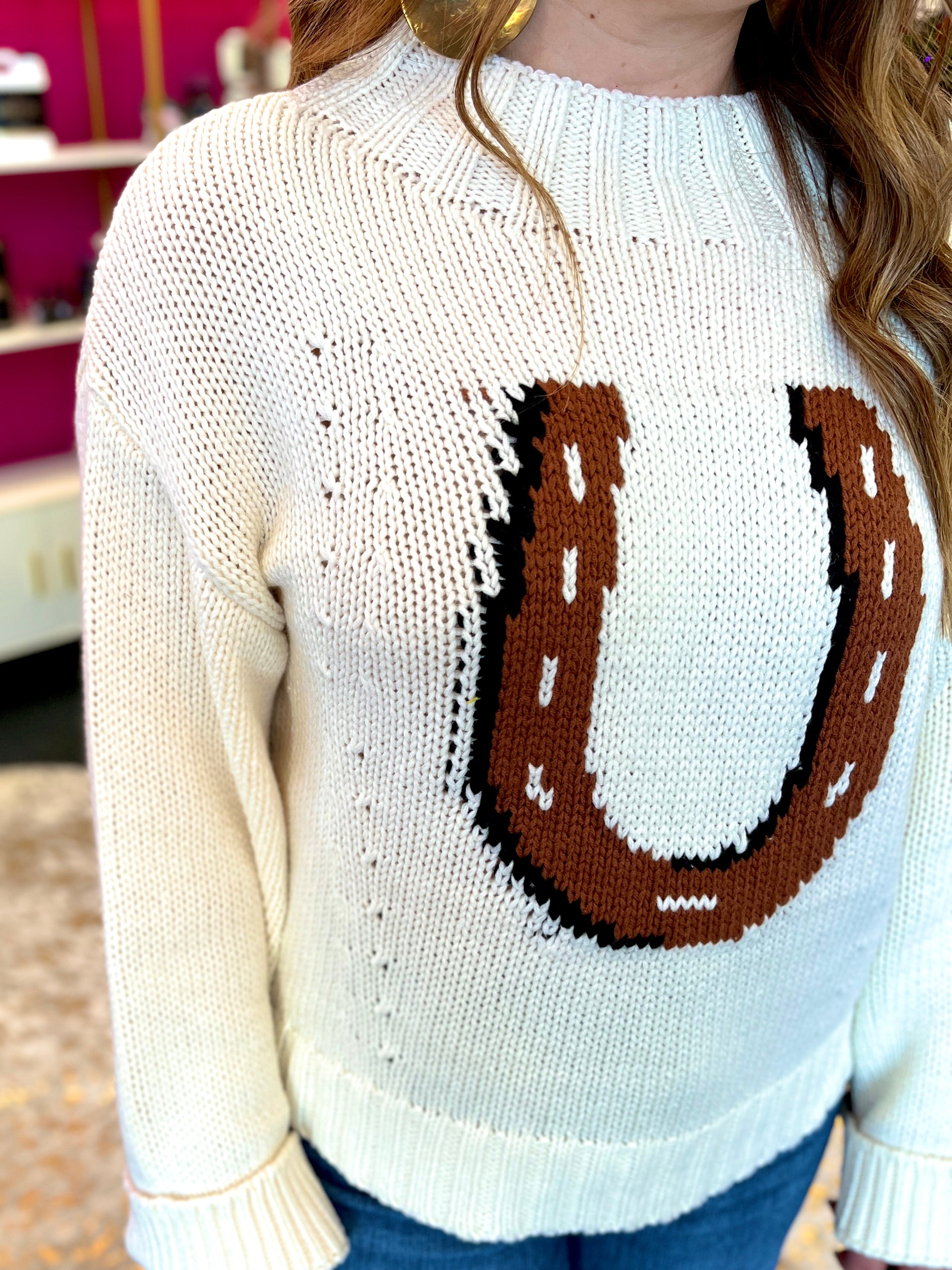 Cozy up in the Ivory Horseshoe Sweater, where western charm meets fall comfort. Its playful horseshoe design adds a touch of luck and style to your autumn wardrobe. Perfect for crisp days, this sweater brings warmth and a fun, laid-back vibe to your seasonal look.