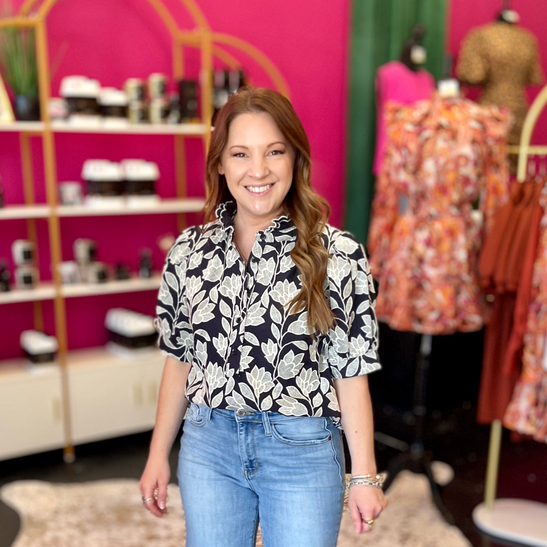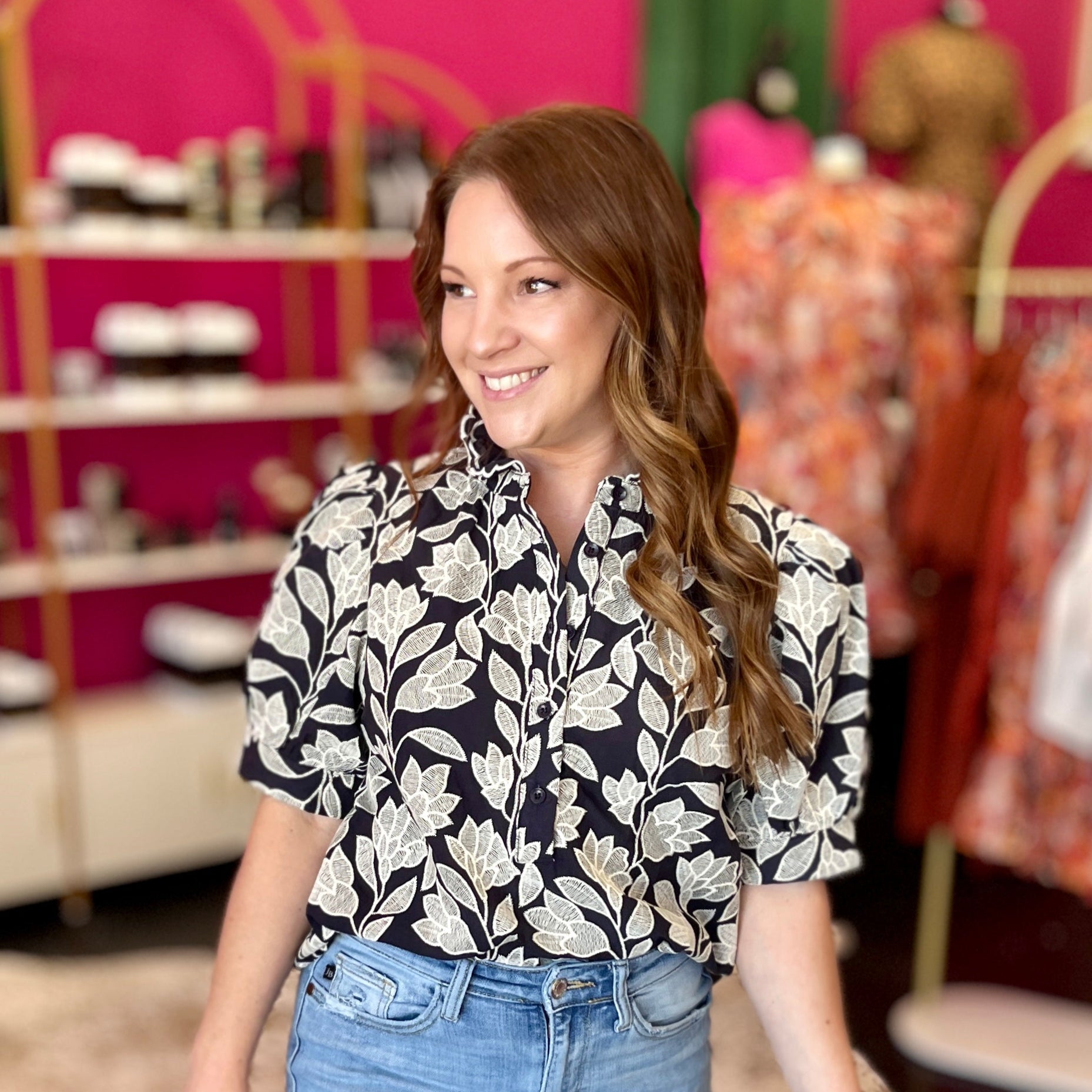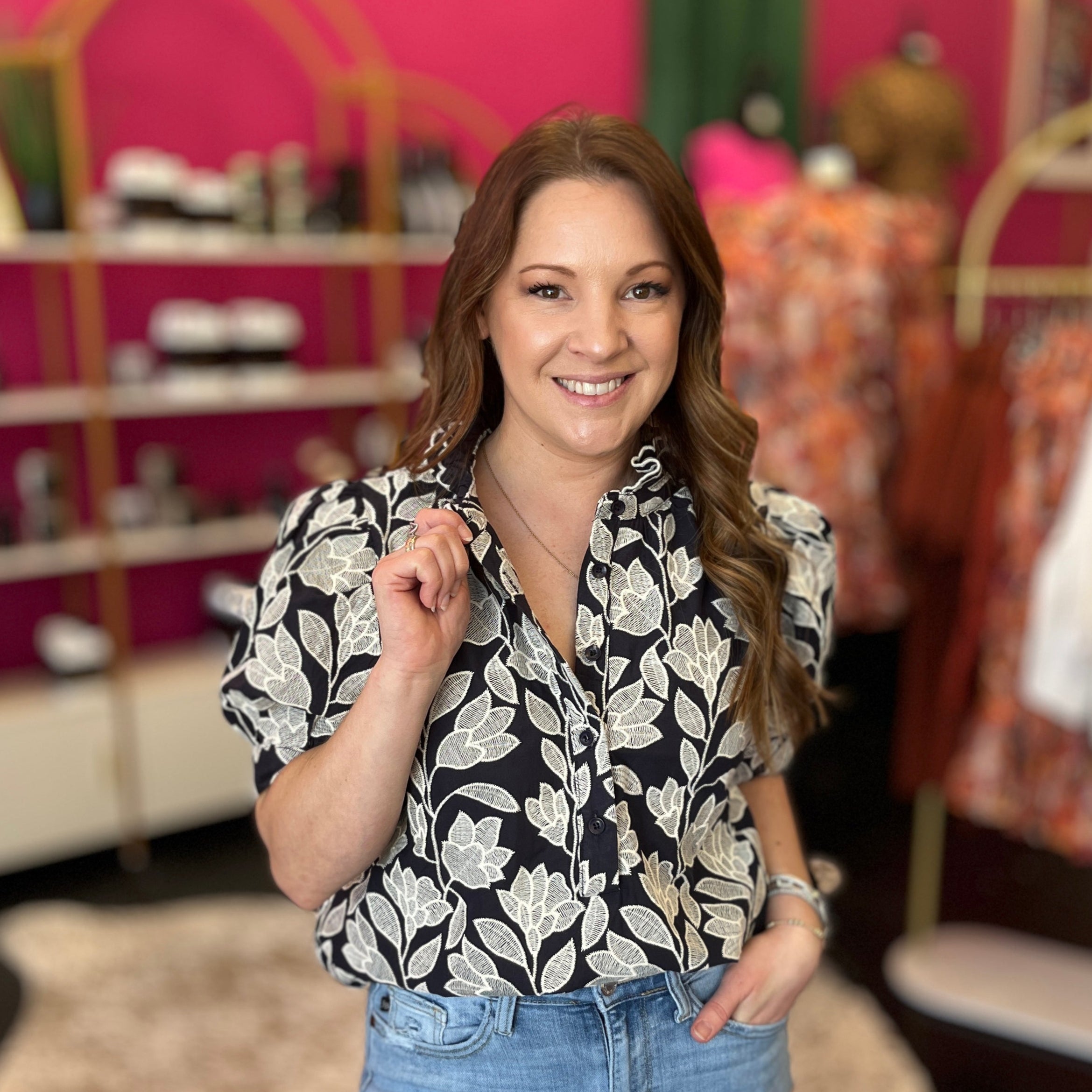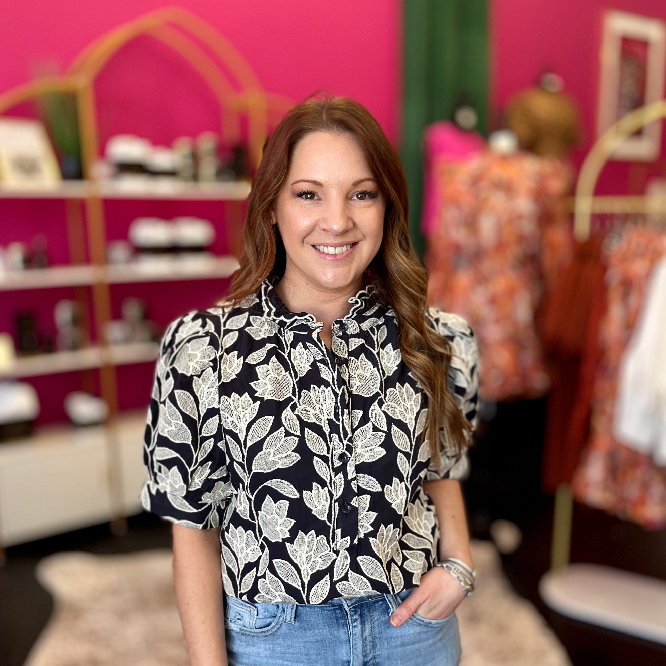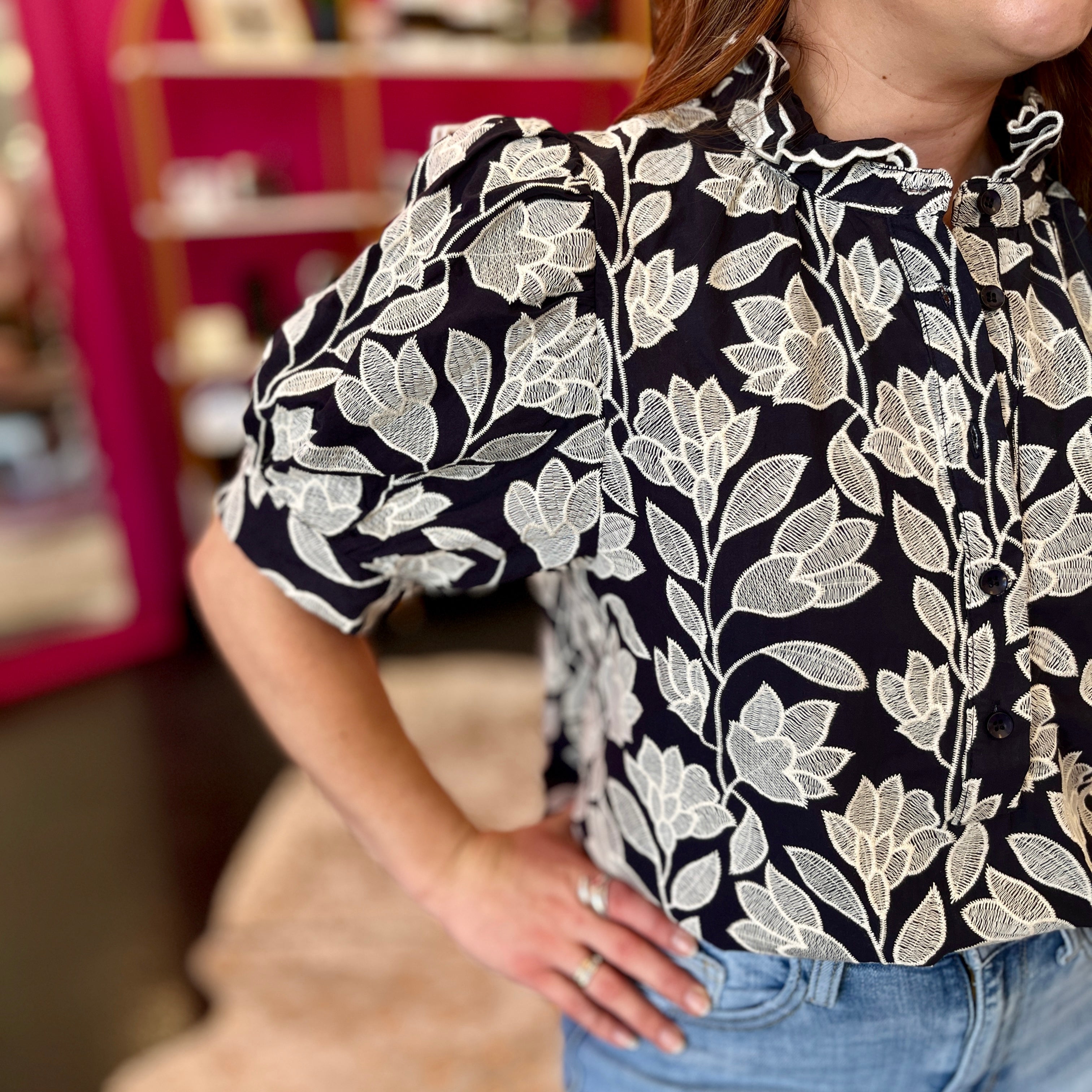 This navy top with crisp white embroidery is pure charm from every angle, featuring delicate designs on the front and back. The playful puff sleeves add a fun, flirty vibe, making it perfect for any day you want to brighten up your look. Too cute to miss!