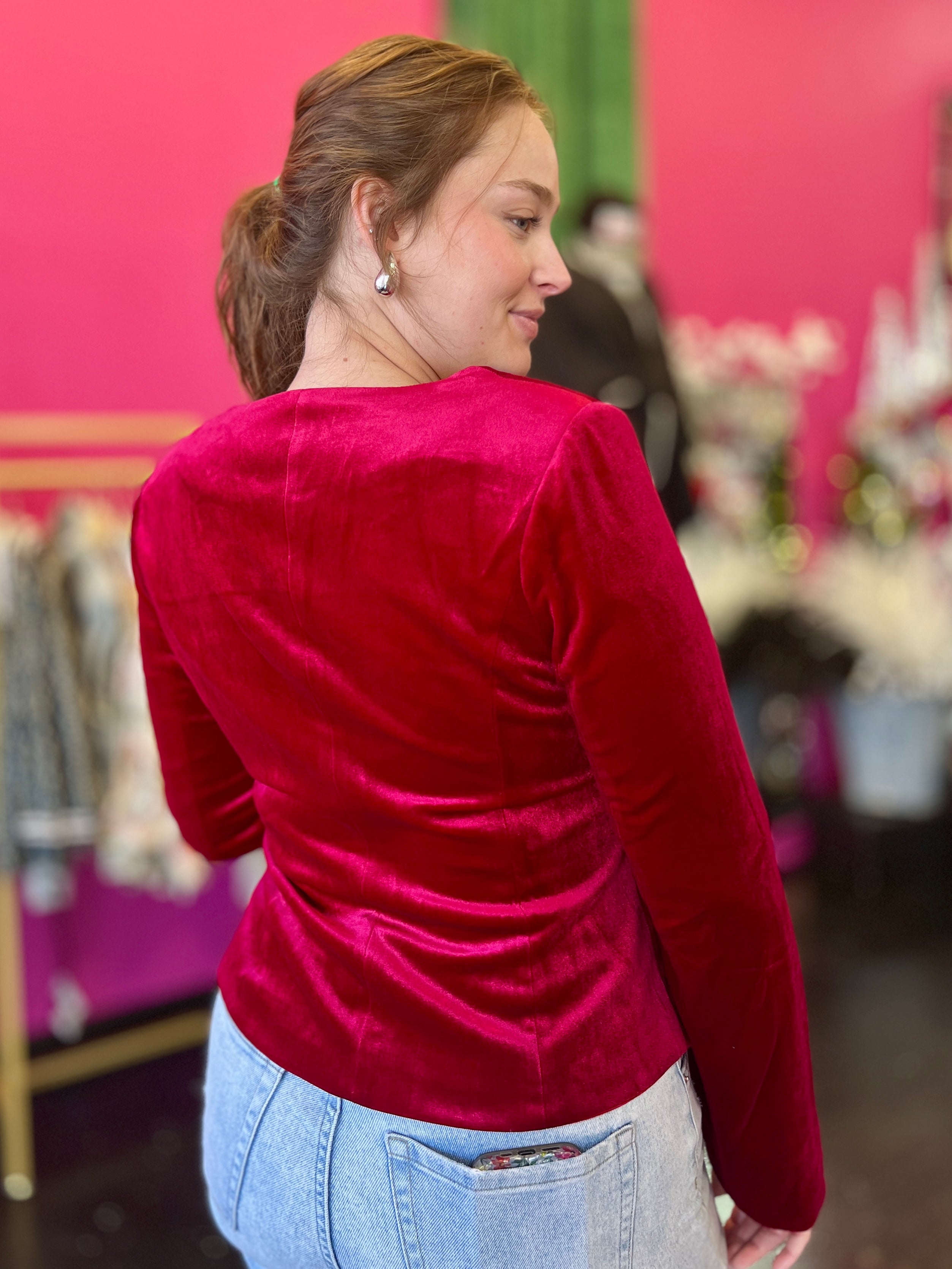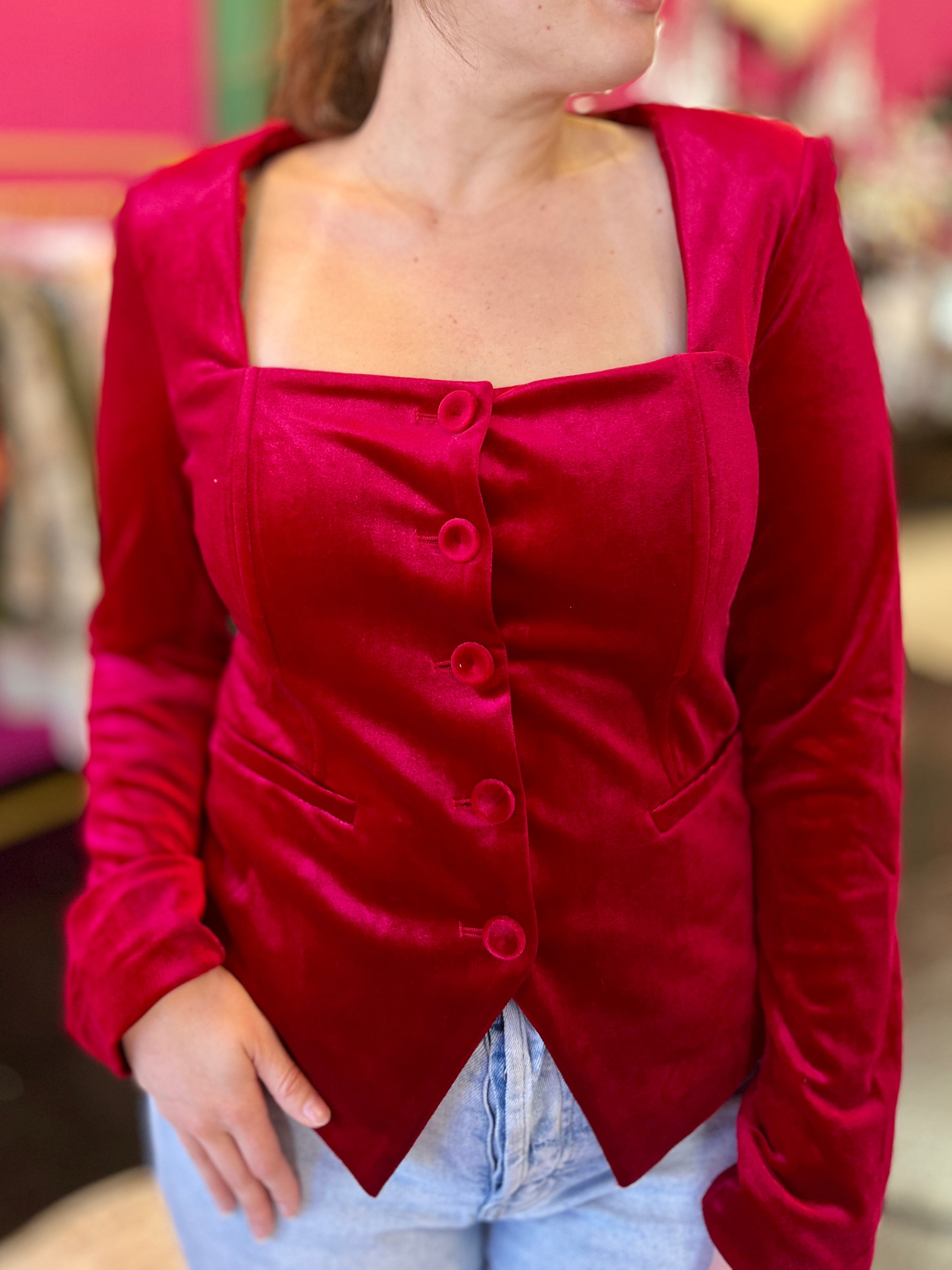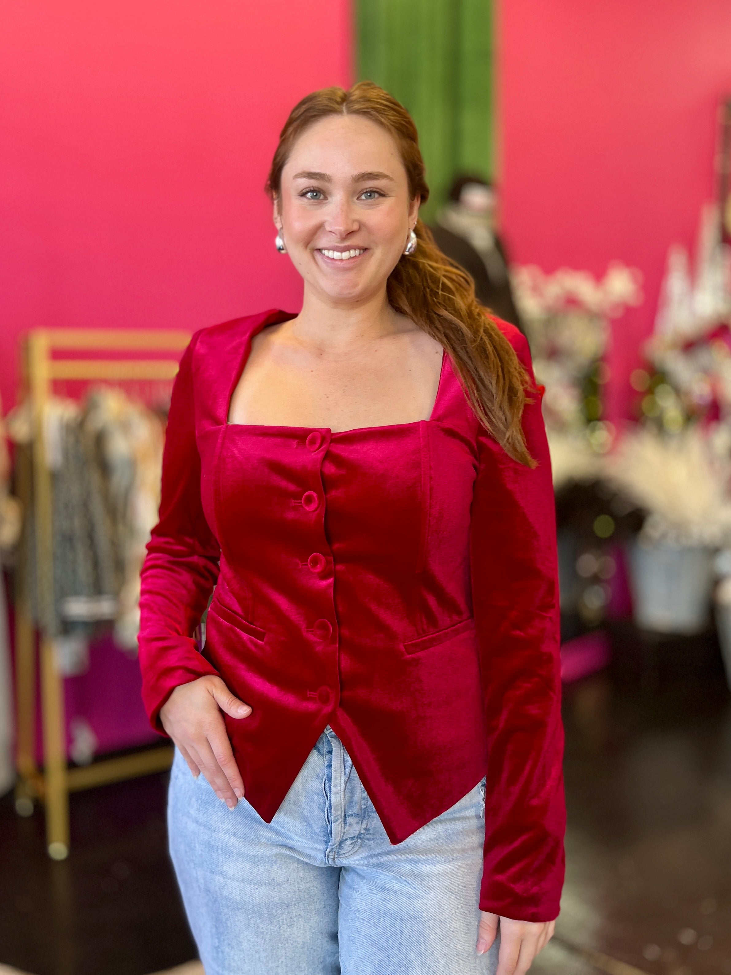 Wrap yourself in luxury with this stunning red velvet top—the ultimate holiday party essential. The flattering square neckline frames your shoulders beautifully while the sumptuous velvet fabric adds instant elegance to any festive look. Whether you're celebrating at an intimate gathering or dancing the night away, this showstopper piece brings sophistication and glamour to your seasonal wardrobe. Get ready to turn heads!