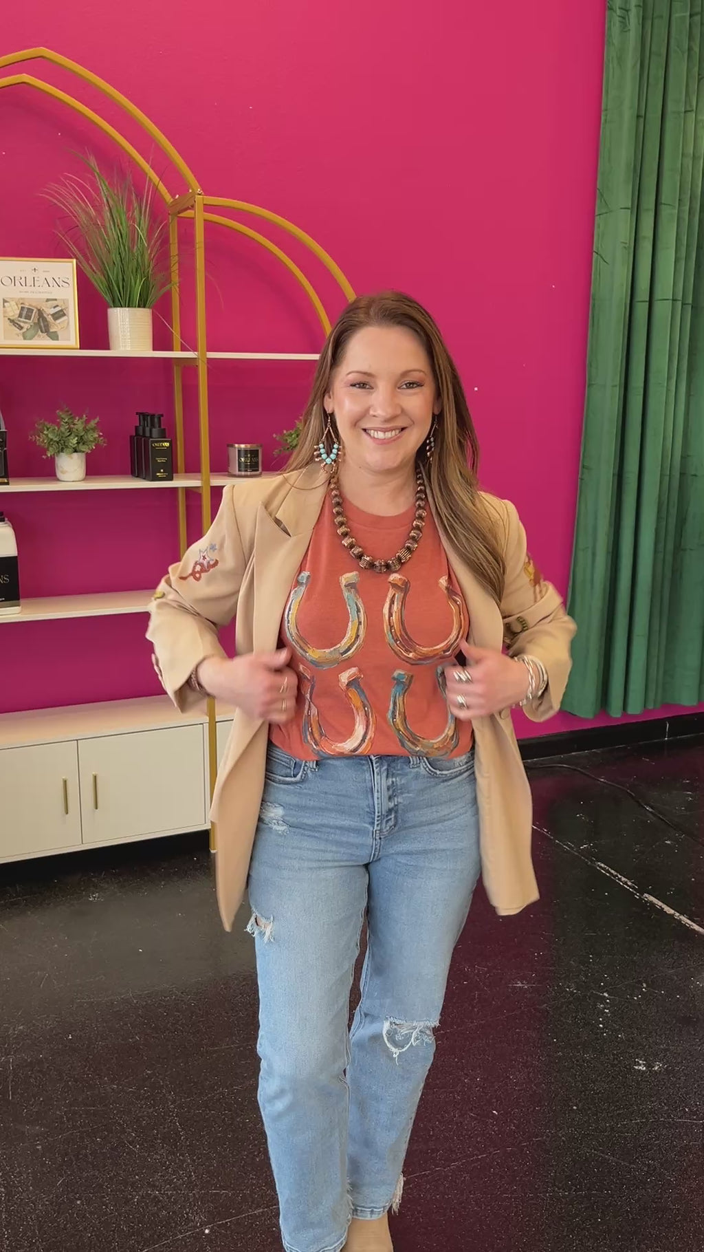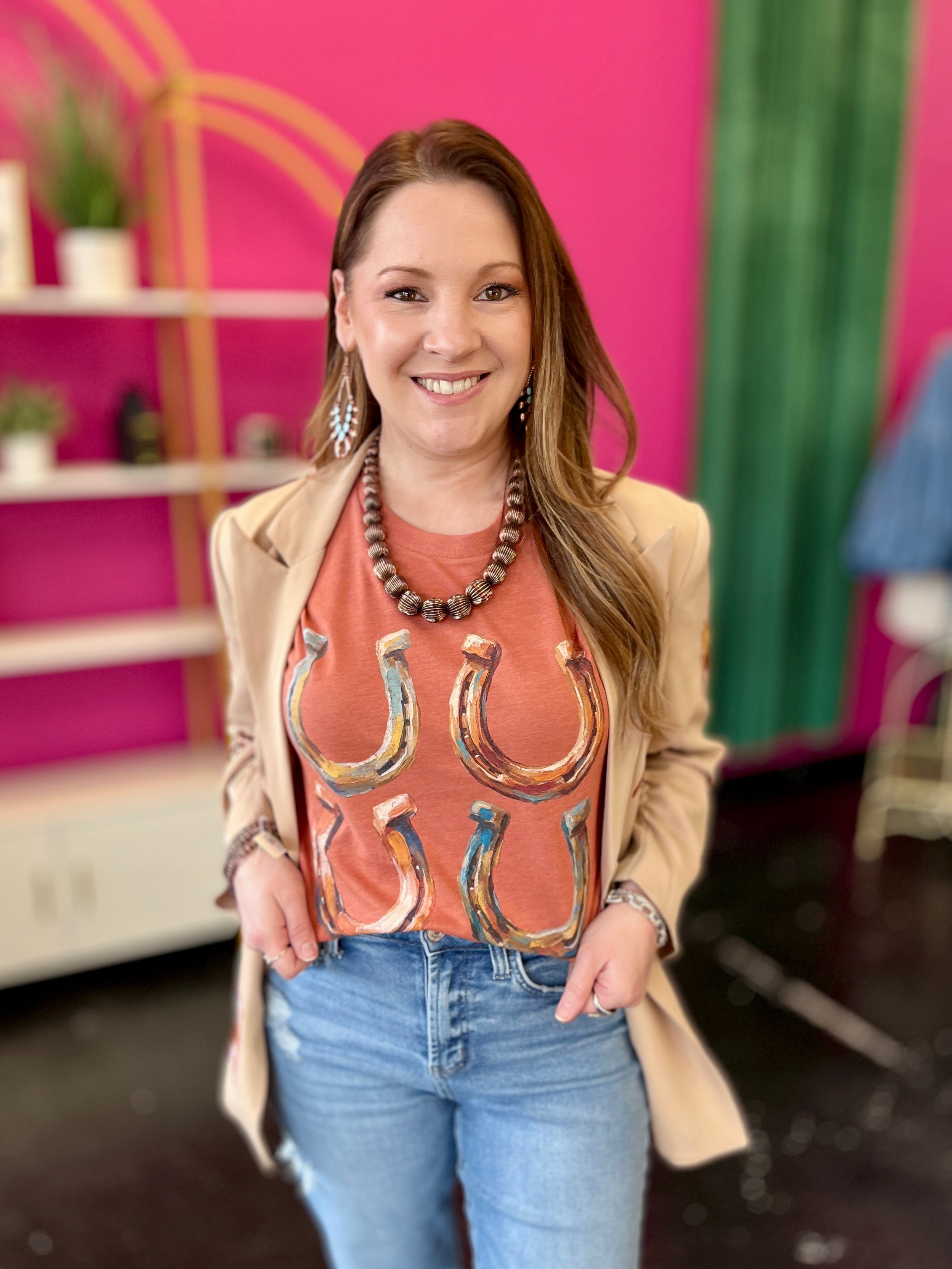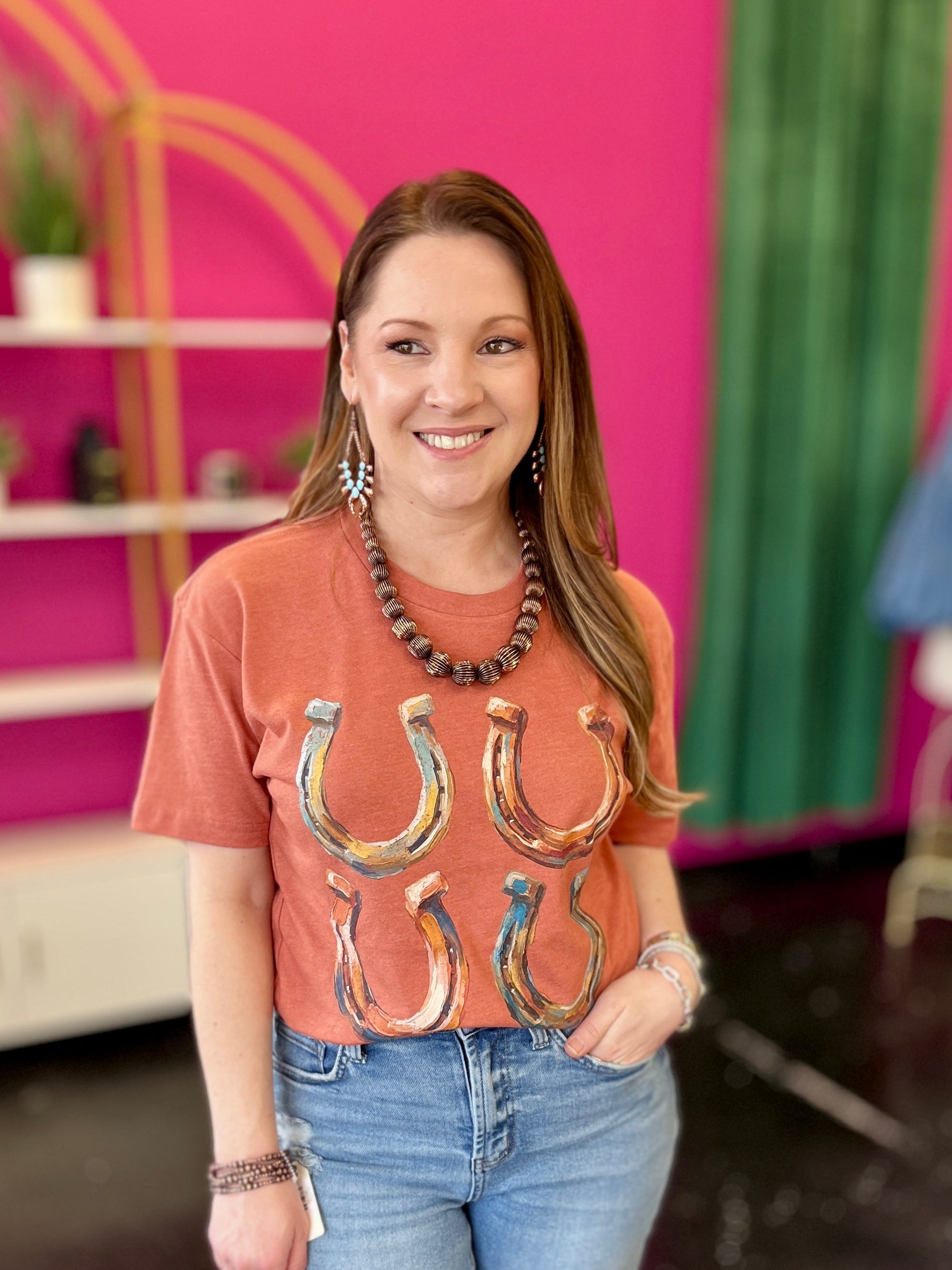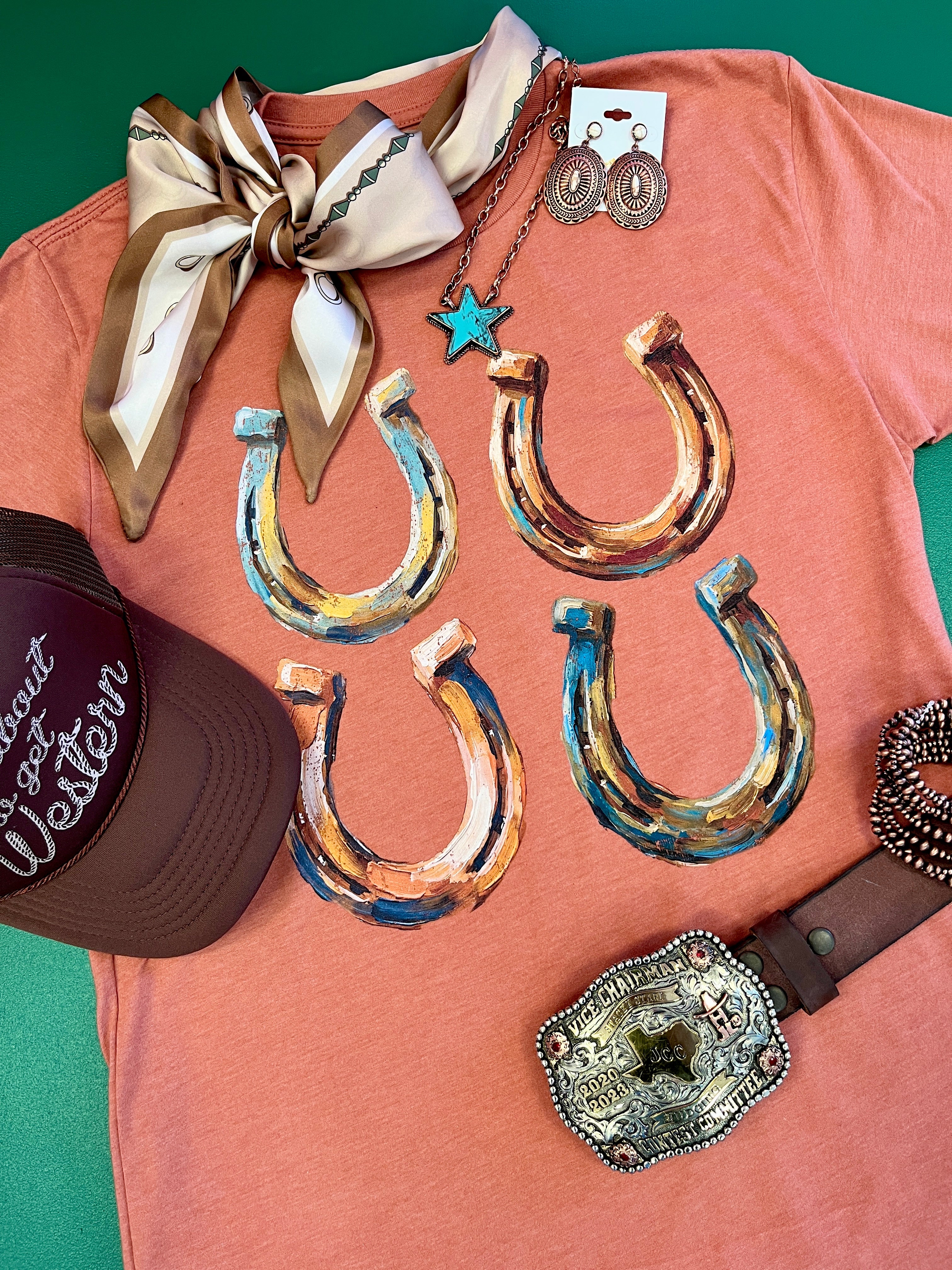 Saddle up in style with this Western Horseshoe Graphic Tee, featuring eye-catching coloring that's perfect for mixing and matching. Layer it effortlessly with a blazer or vest to elevate your look from casual to chic, or wear it solo for laid-back western vibes. A versatile staple that works as hard as you do.