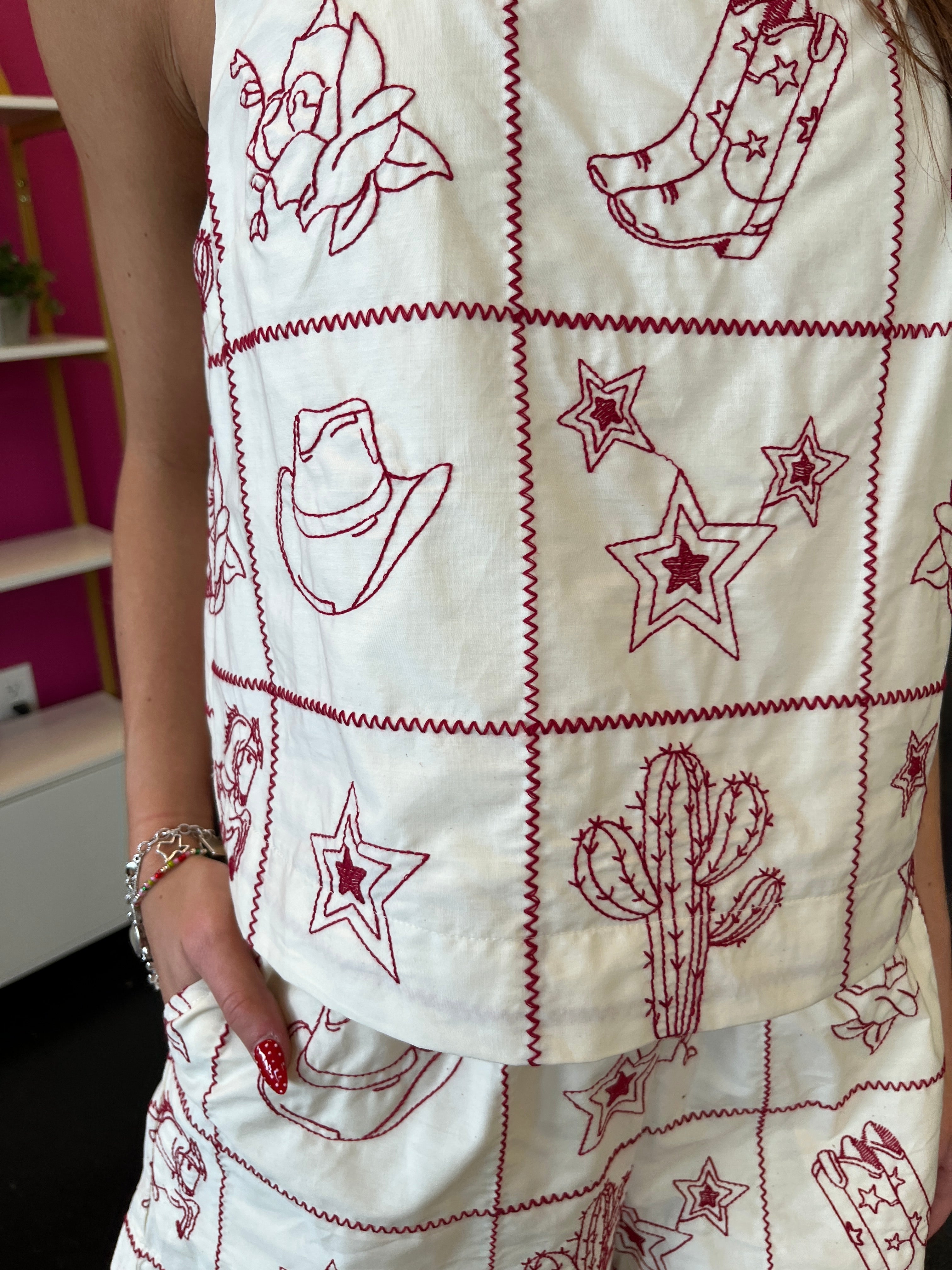These adorable cream top are a western-inspired dream! Featuring eye-catching red embroidery with authentic western motifs, they're perfect for channeling your inner cowgirl. Pair them with the matching shorts to complete your coordinated look. Whether you're heading to a rodeo, festival, or just want to add some playful flair to your everyday style, these shorts deliver charm and comfort in one irresistible package.