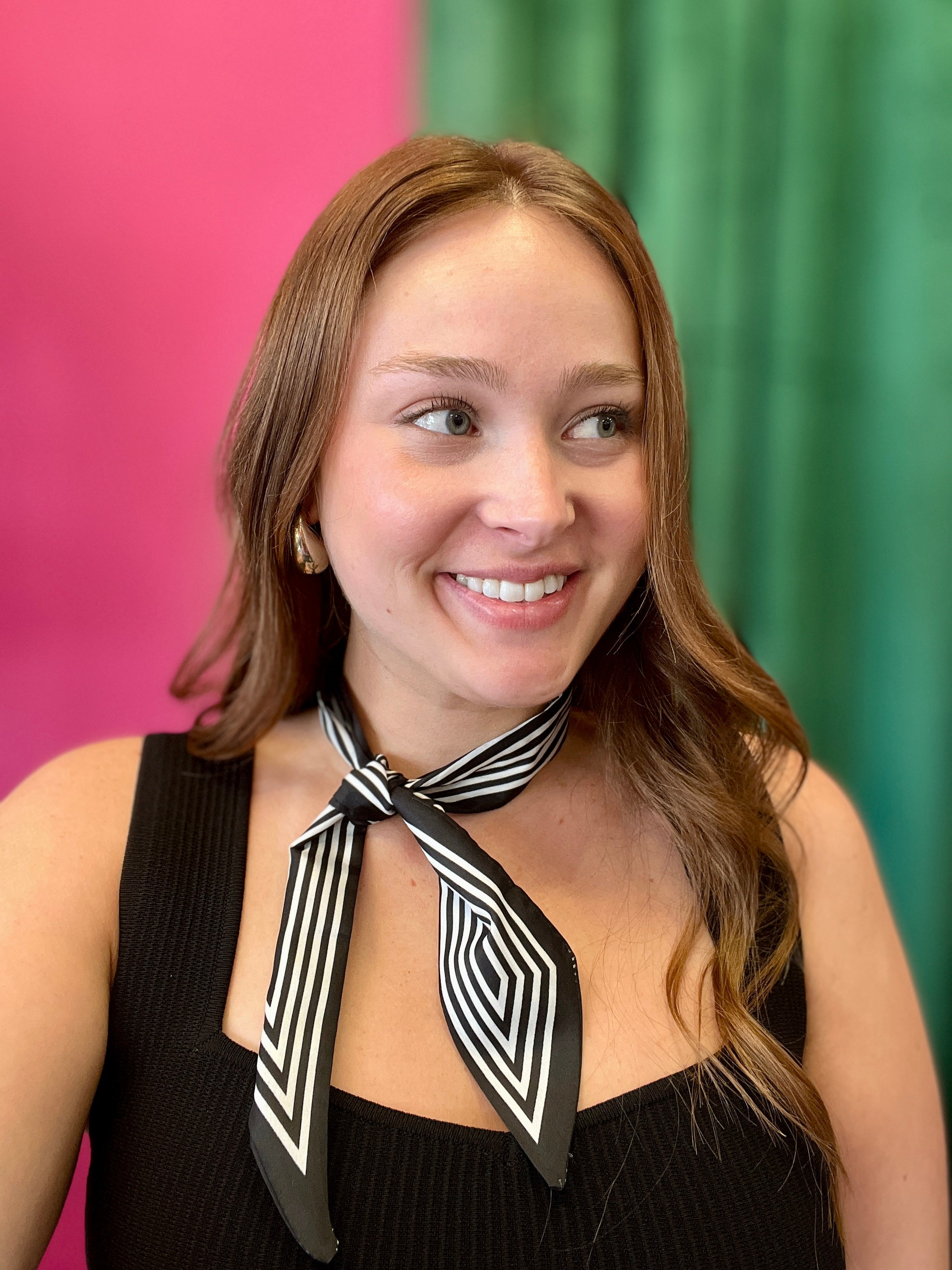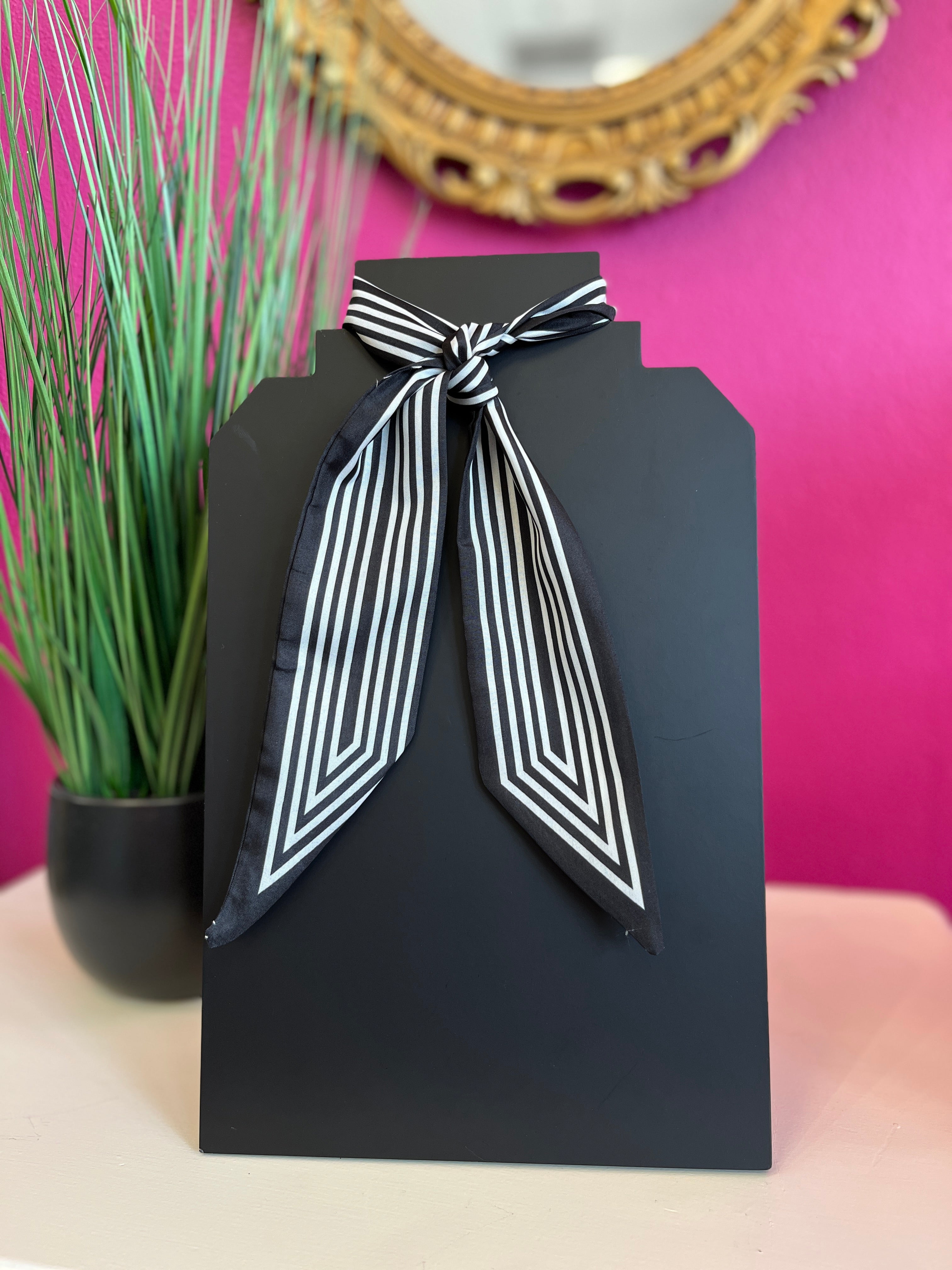 This Black with White Striped Twilly is the cutest little accessory you'll want all season! Wear it as a chic necklace charm, wrap it stylishly around your neck, or tie it to your purse for a playful pop of fall flair. Perfectly versatile and effortlessly trendy, it’s your go-to detail to brighten up any outfit.
