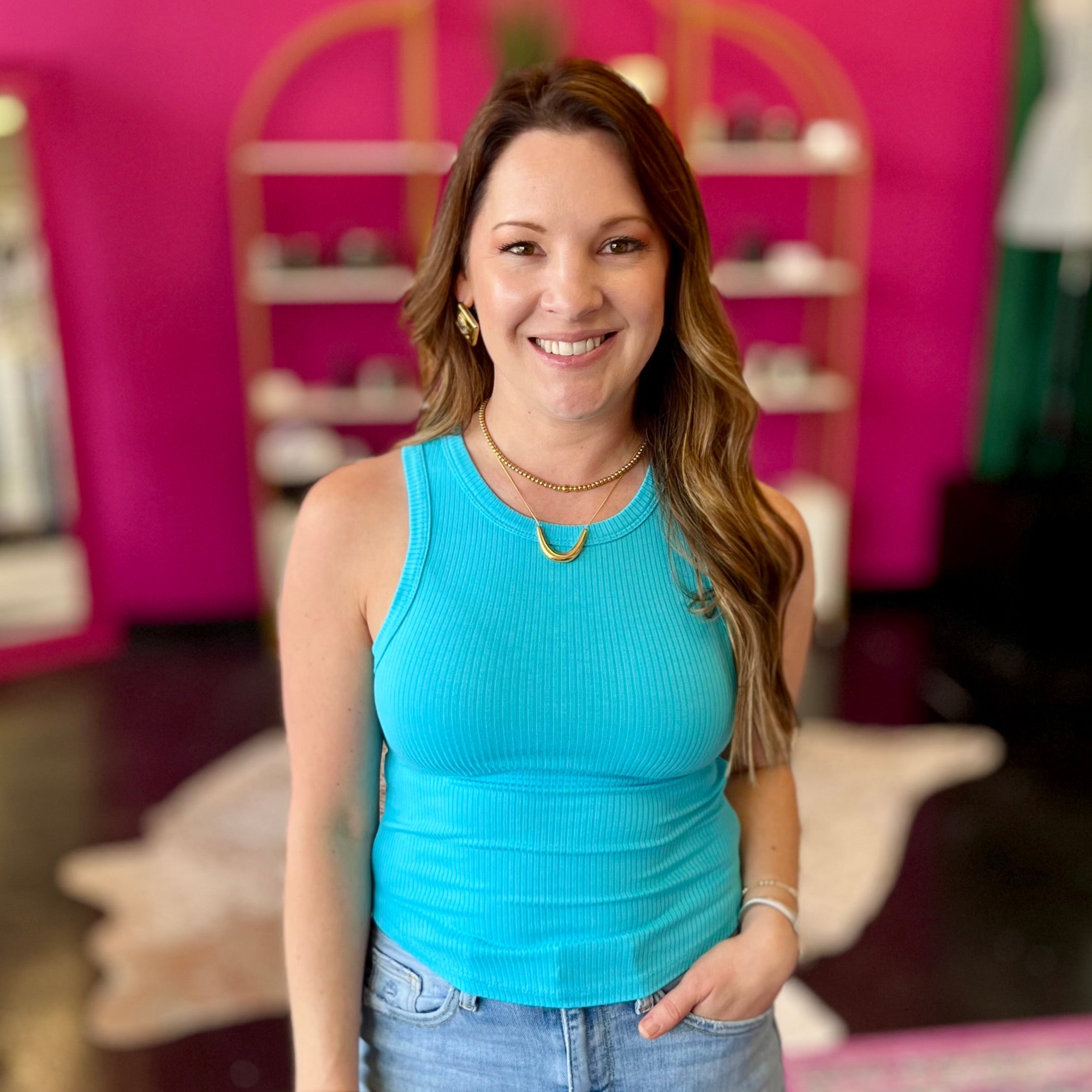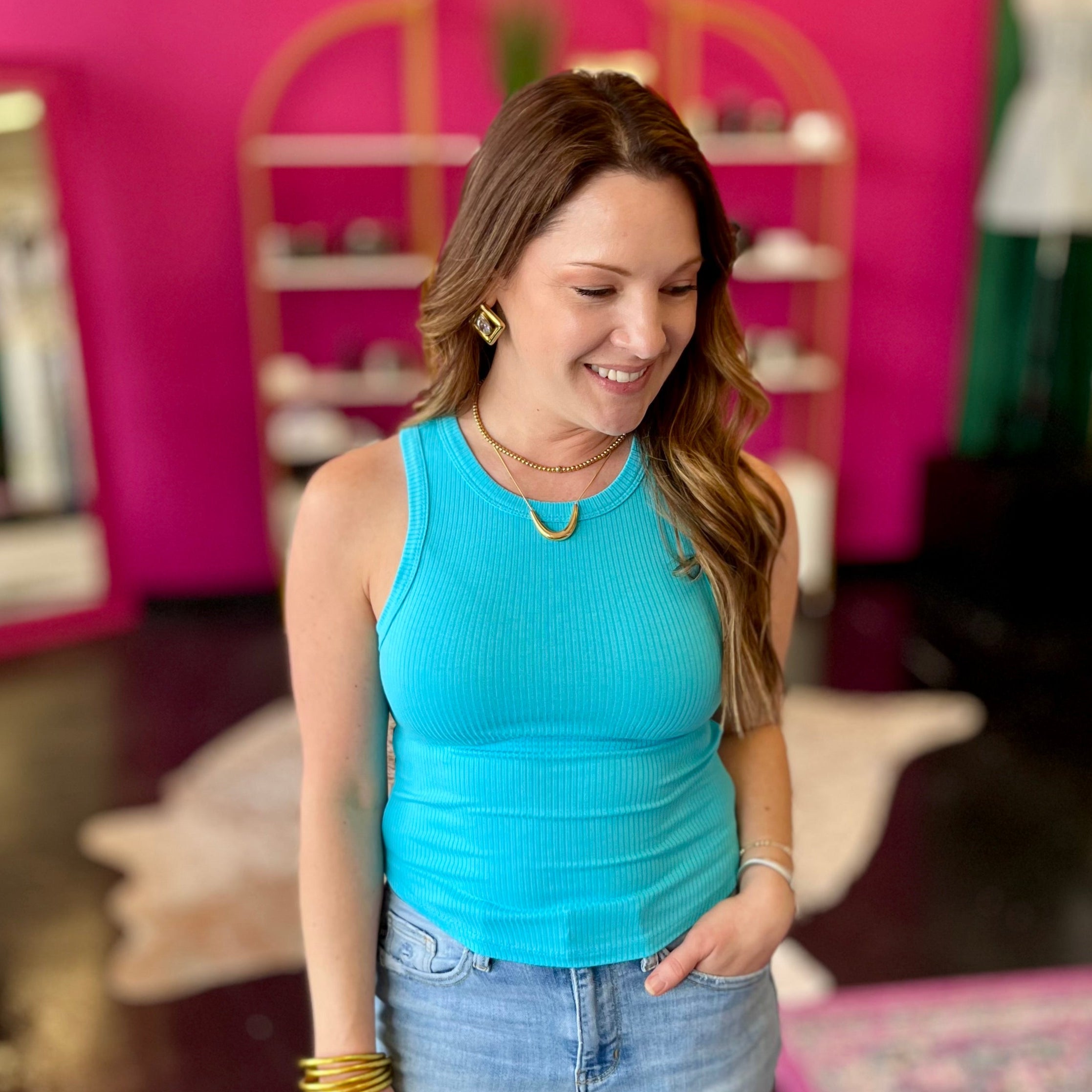 This Aqua Blue High Neck Ribbed Top from our Basics Collection brings a splash of vibrant color to your wardrobe. Featuring a trendy racerback style and a flattering high neck, it’s perfect for layering or wearing solo. The ribbed texture adds a fun twist, making it a playful yet versatile piece you’ll reach for again and again.