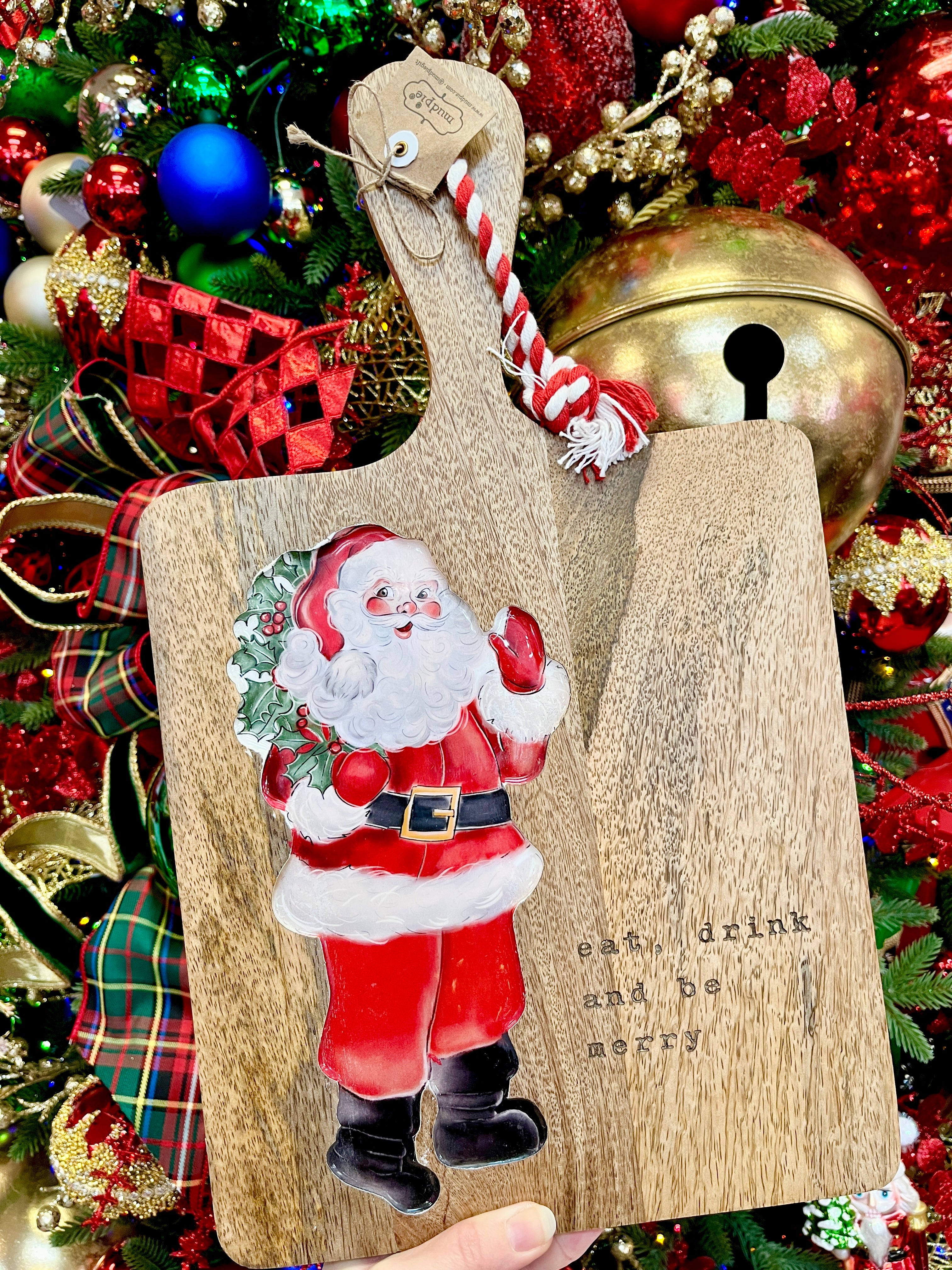 Bring festive fun to your holiday events with the Eat Drink & Be Merry Santa Serving Board. This playful mango wood board features a charming enamel standing Santa and an etched "Eat Drink & Be Merry" saying, making it the perfect centerpiece for serving snacks and spreading holiday cheer.