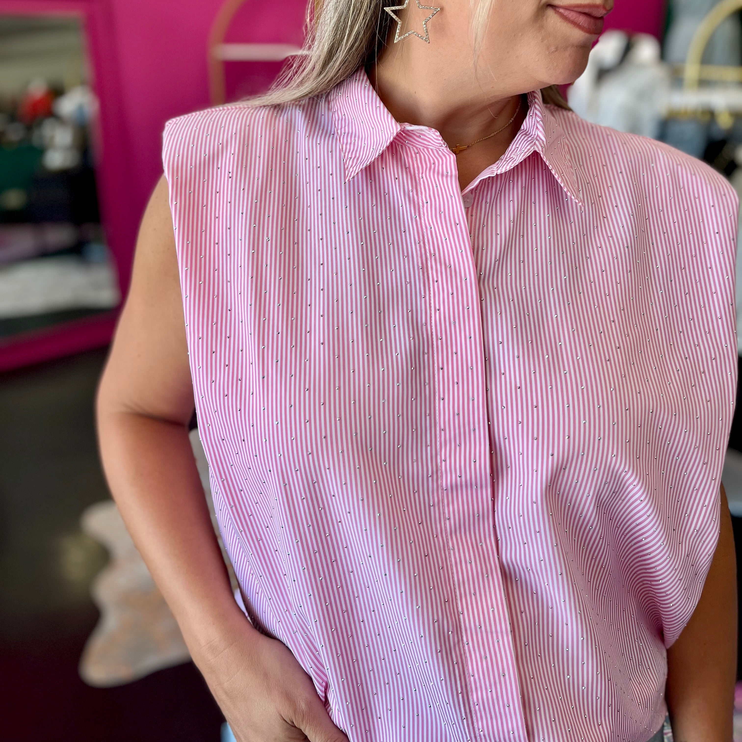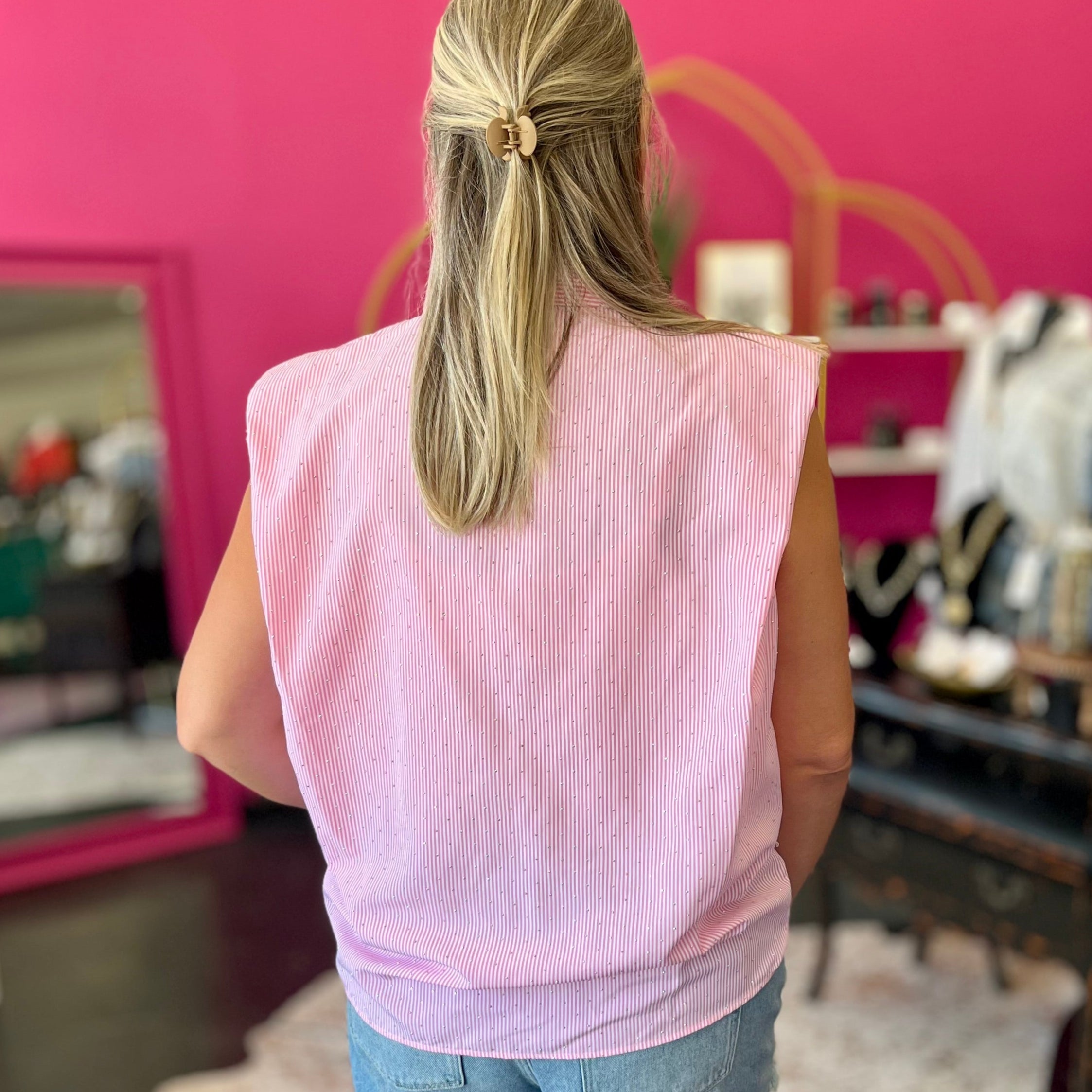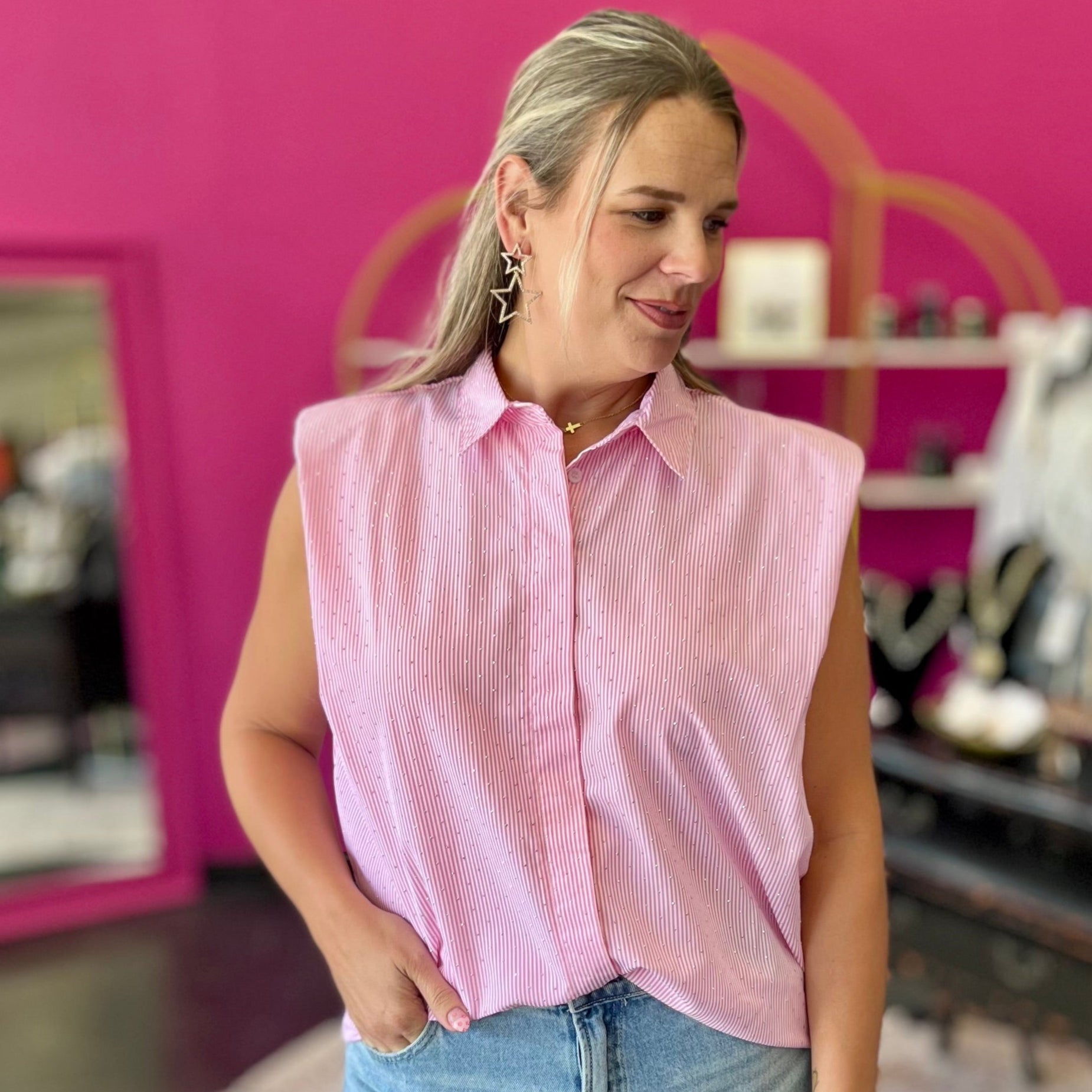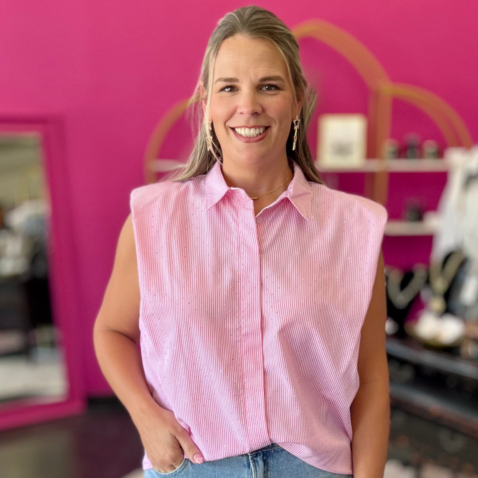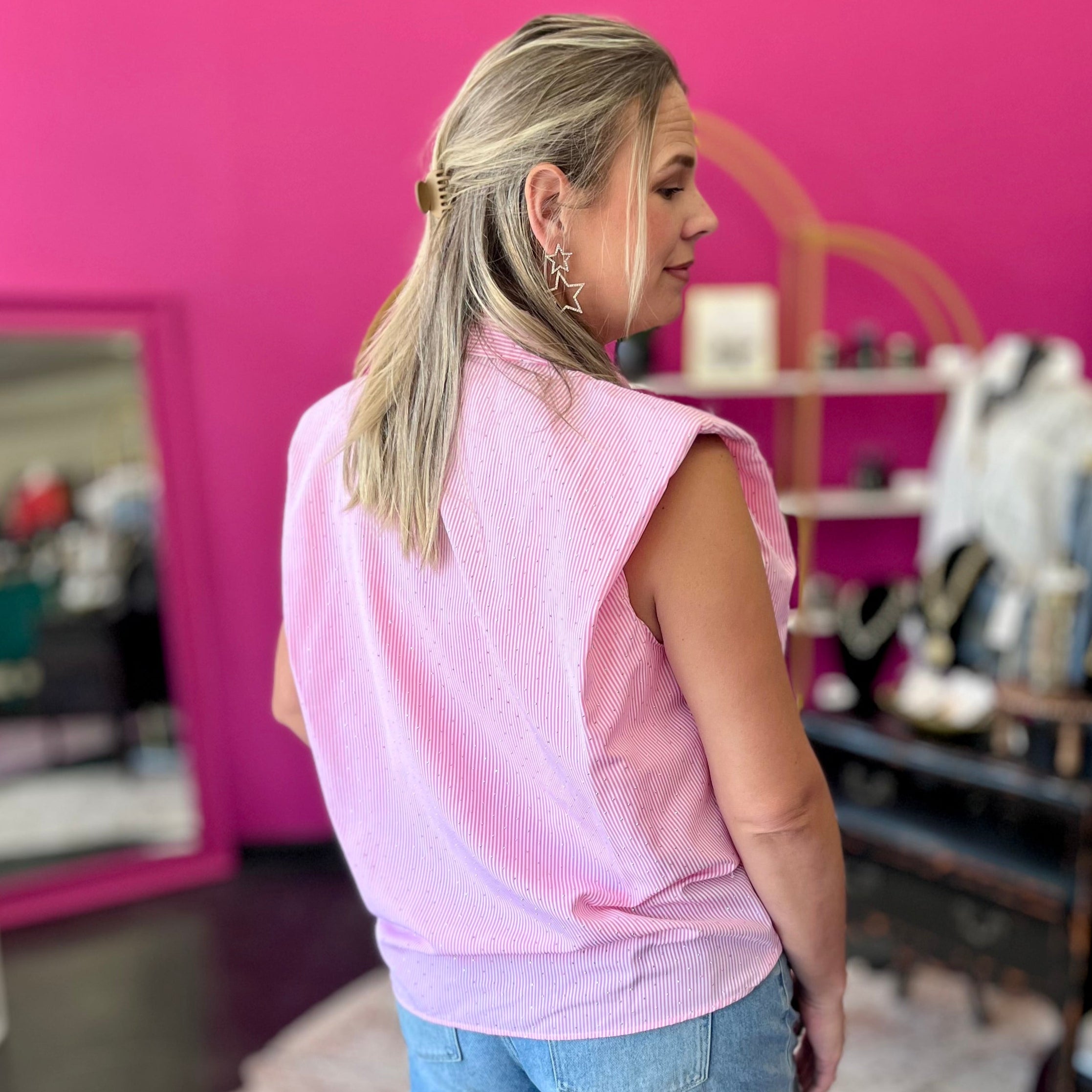 Add a touch of sparkle to your wardrobe with this Light Pink & White Striped Crystal Top. Featuring playful cap sleeves and shimmering crystal accents, it’s the perfect blend of cute and chic. Whether dressing up or down, this top brings effortless charm and a little bling to any outfit.